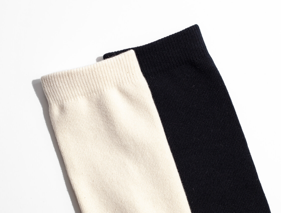 本体はコットンをメインに、ポリエステルとナイロン・ポリウレタンをブレンド。コットンならではの柔らかな肌あたりをベースに、耐久性とフィット感を高めたバランスの良い素材使いです。編み地は、天竺編み。フラットで滑らかな表面感は上品で、足入れした瞬間に感じるのは締め付けすぎない自然なフィット。コットンの吸湿性に、ポリエステルの速乾性、ナイロンの強度が加わることで、日常使いにちょうどいい快適さを実現しています。