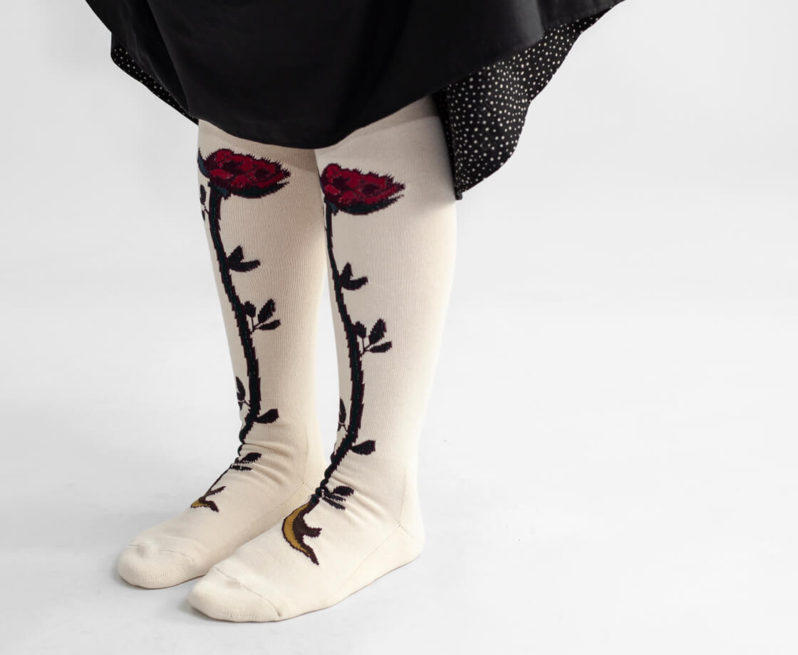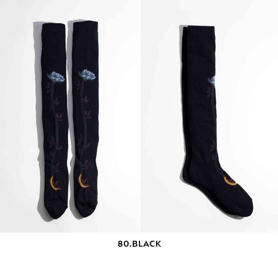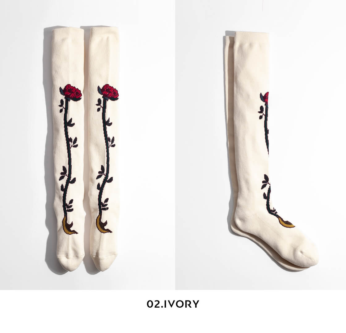 デザイナー小塚氏による手描きのイラストを、緻密なジャカード編みで丁寧に表現。膝まで届くロング丈に、アートピースのような存在感を宿しました。フロントに大胆に配された一本のカーネーション。このモチーフは、2026SSシーズンテーマ「The moon is floating in the room」に込められた"月"のイメージとともに、小塚氏がミシンの練習として制作し、母の日の贈り物にした布の花から着想を得たもの。静かでやわらかな記憶が、一本の花となって足元に咲きます。膝上の長さは、そのまま端正に履いても、くしゅっとたゆませてルーズに楽しんでもいい。スタイリングにさりげない余白と個性を生み出すハイソックスです。