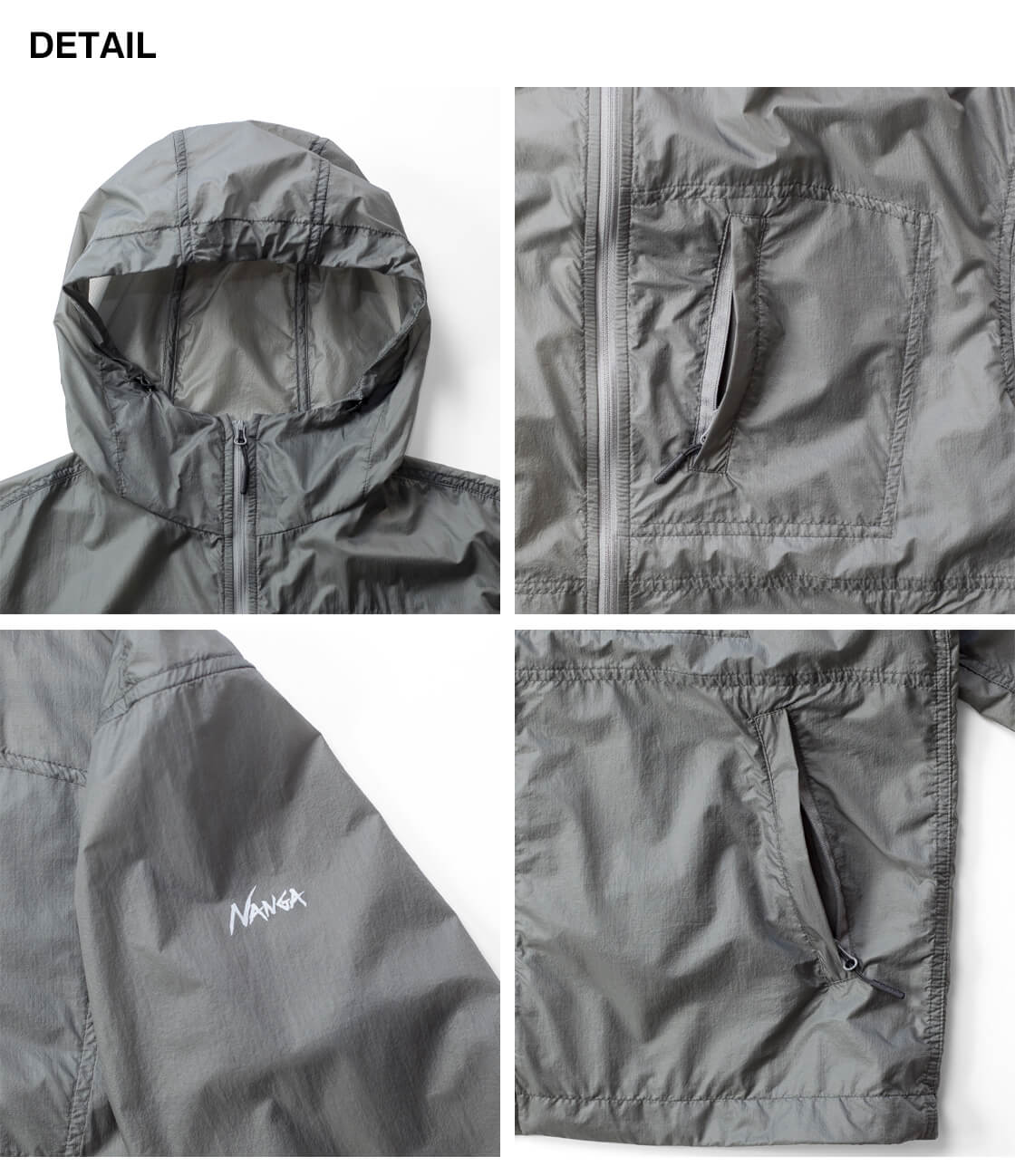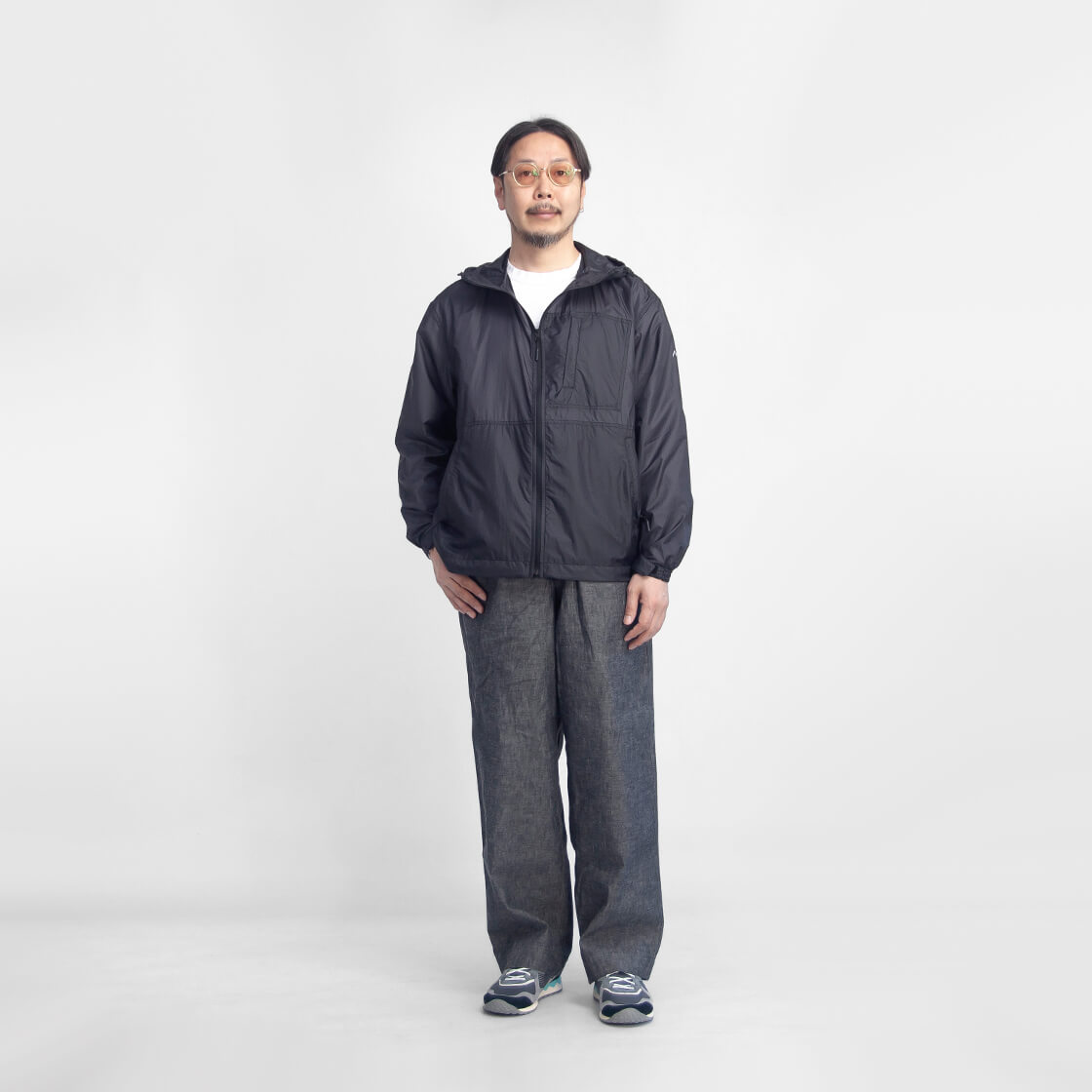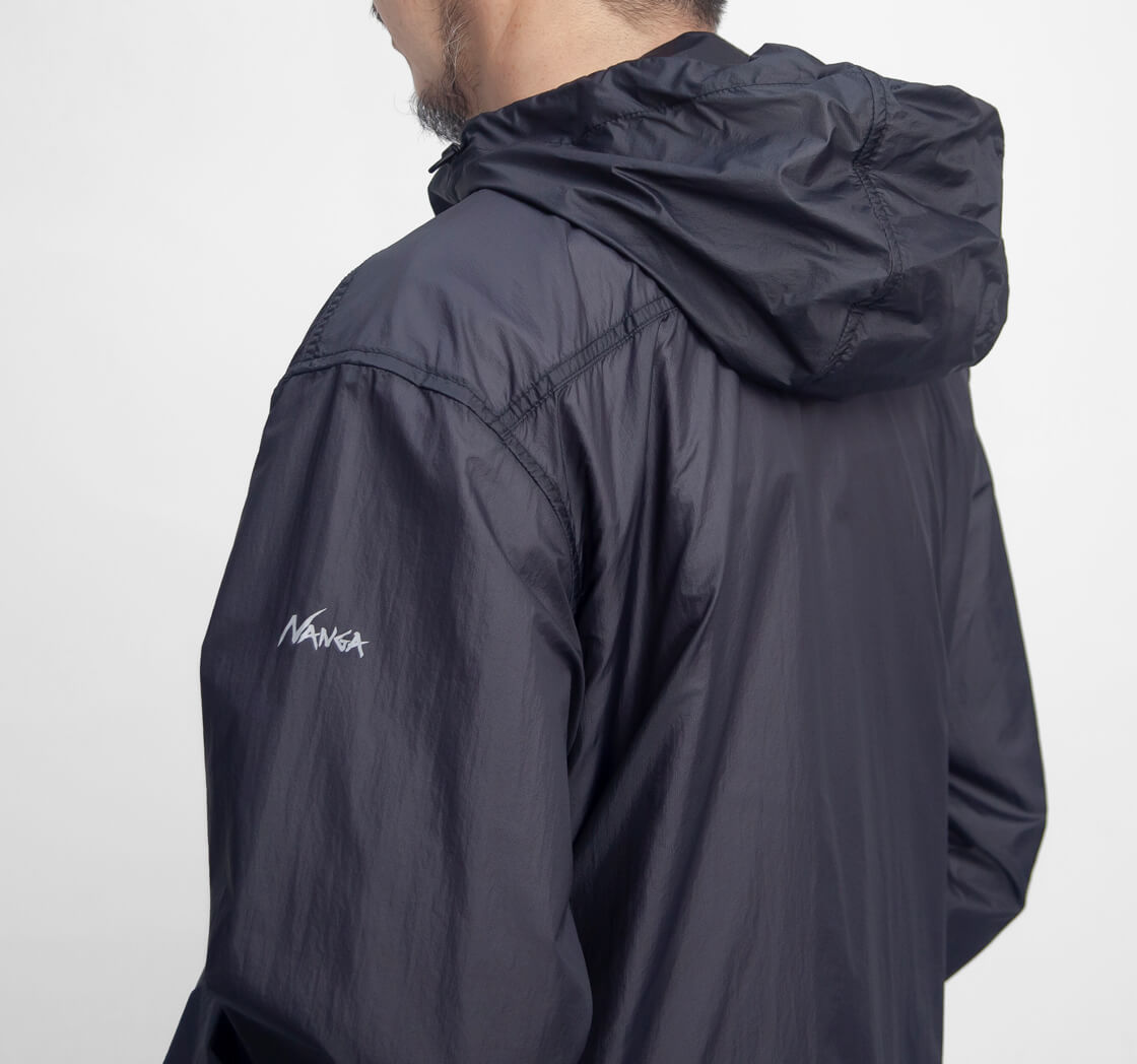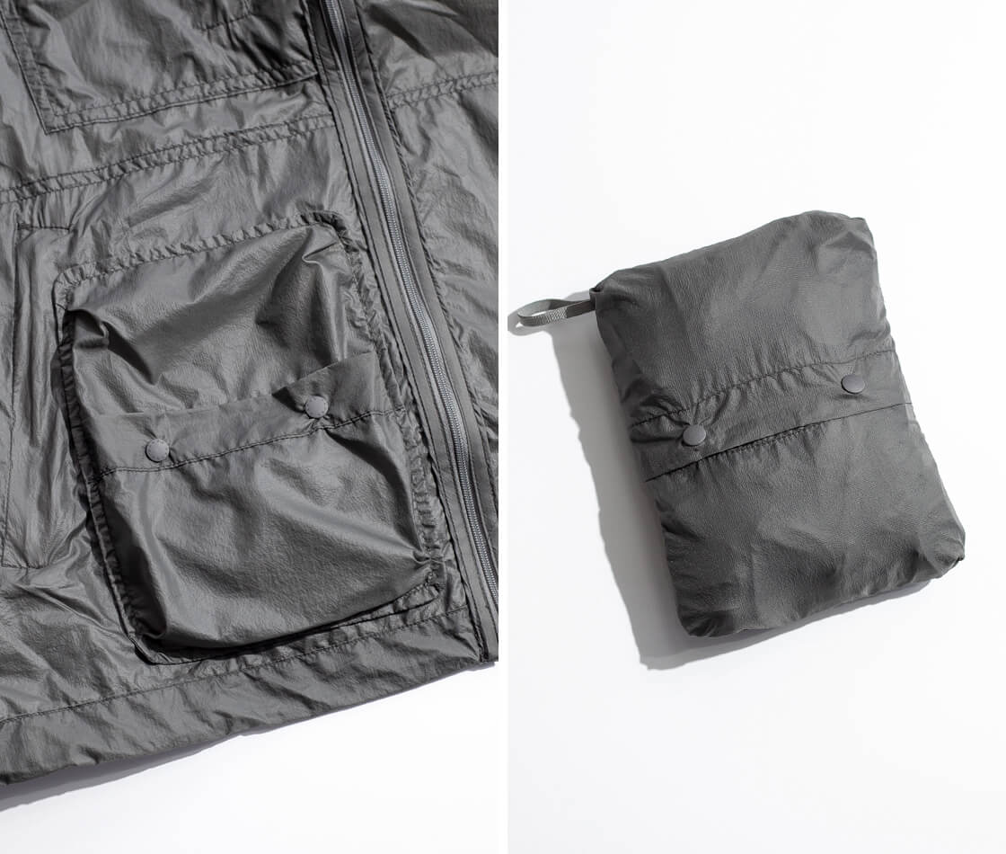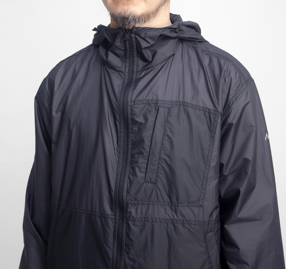 程よく透ける、軽やかなナイロン。指先で触れれば、その薄さに一瞬頼りなさを覚えるかもしれません。けれど、その印象は静かに裏切られたのがこのアイテム。撥水加工を施したこの生地は、驚くほどしなやかで、そして実用的。軽さと機能が、高い次元で両立されています。そんな素材を活かして仕立てられたのが、NANGAの「SHEER JACKET(シアージャケット)」。羽衣のように軽やかな着心地でありながら、細部にまで行き届いた作り込みというのが大きな魅力のフードジャケットです。フードはドローコードで自在にフィットを調整可能。袖口はゴムと面ファスナーでしっかりと風の侵入を防ぎます。左胸と腰位置のポケットにはファスナーを備え、大切な持ち物を安心して収納。さらに裾のドローコードを絞れば、シルエットは丸みを帯び、スタイリングに応じて表情を変えます。そして特筆すべきは、その携帯性。身頃内側のポケットに本体を畳み込み、裏返すことでコンパクトに収納できるポケッタブル仕様。バッグに忍ばせておけば、いざという時に頼れる存在になります。