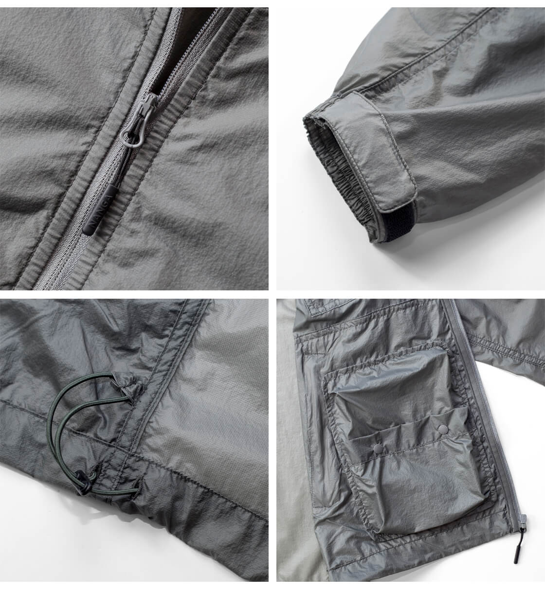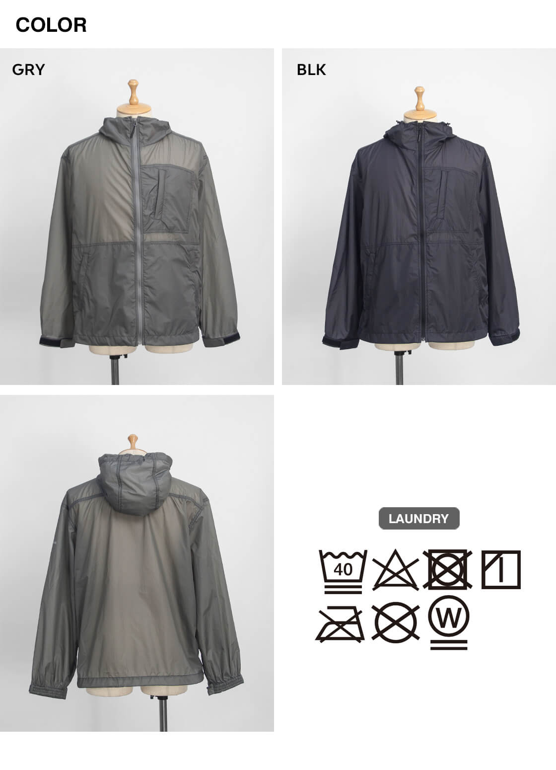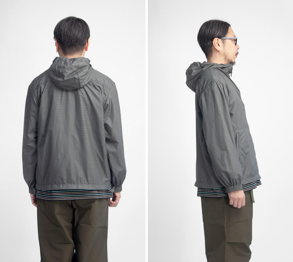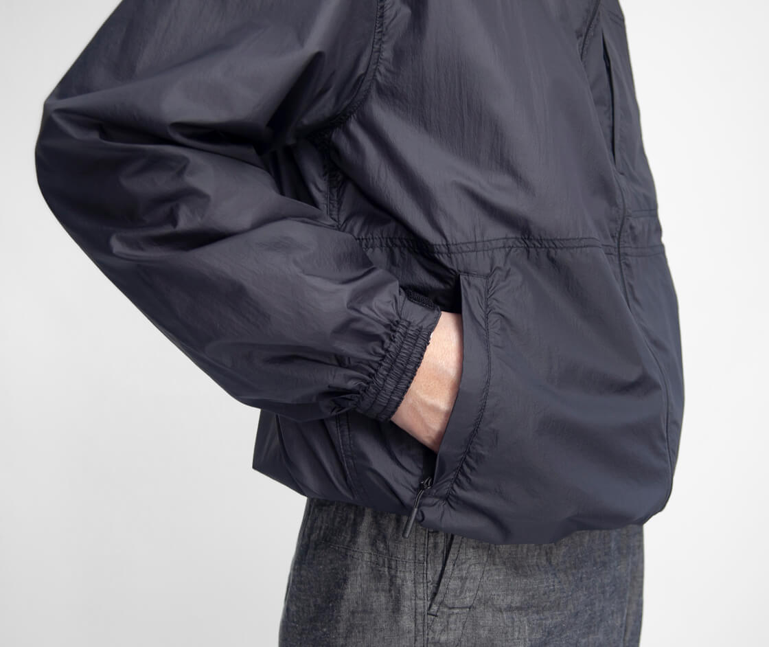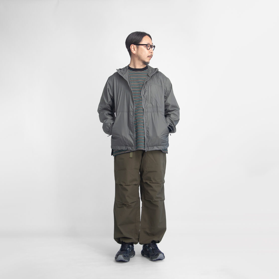 程よく透ける、軽やかなナイロン。指先で触れれば、その薄さに一瞬頼りなさを覚えるかもしれません。けれど、その印象は静かに裏切られたのがこのアイテム。撥水加工を施したこの生地は、驚くほどしなやかで、そして実用的。軽さと機能が、高い次元で両立されています。そんな素材を活かして仕立てられたのが、NANGAの「SHEER JACKET(シアージャケット)」。羽衣のように軽やかな着心地でありながら、細部にまで行き届いた作り込みというのが大きな魅力のフードジャケットです。フードはドローコードで自在にフィットを調整可能。袖口はゴムと面ファスナーでしっかりと風の侵入を防ぎます。左胸と腰位置のポケットにはファスナーを備え、大切な持ち物を安心して収納。さらに裾のドローコードを絞れば、シルエットは丸みを帯び、スタイリングに応じて表情を変えます。そして特筆すべきは、その携帯性。身頃内側のポケットに本体を畳み込み、裏返すことでコンパクトに収納できるポケッタブル仕様。バッグに忍ばせておけば、いざという時に頼れる存在になります。