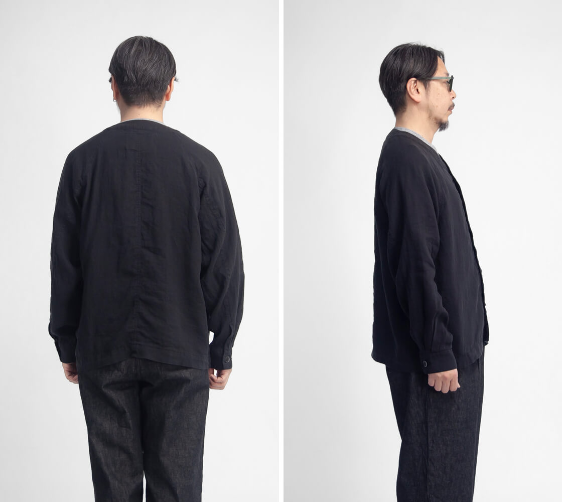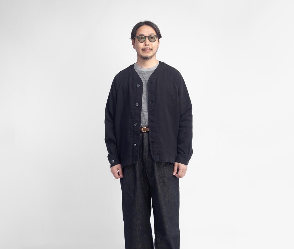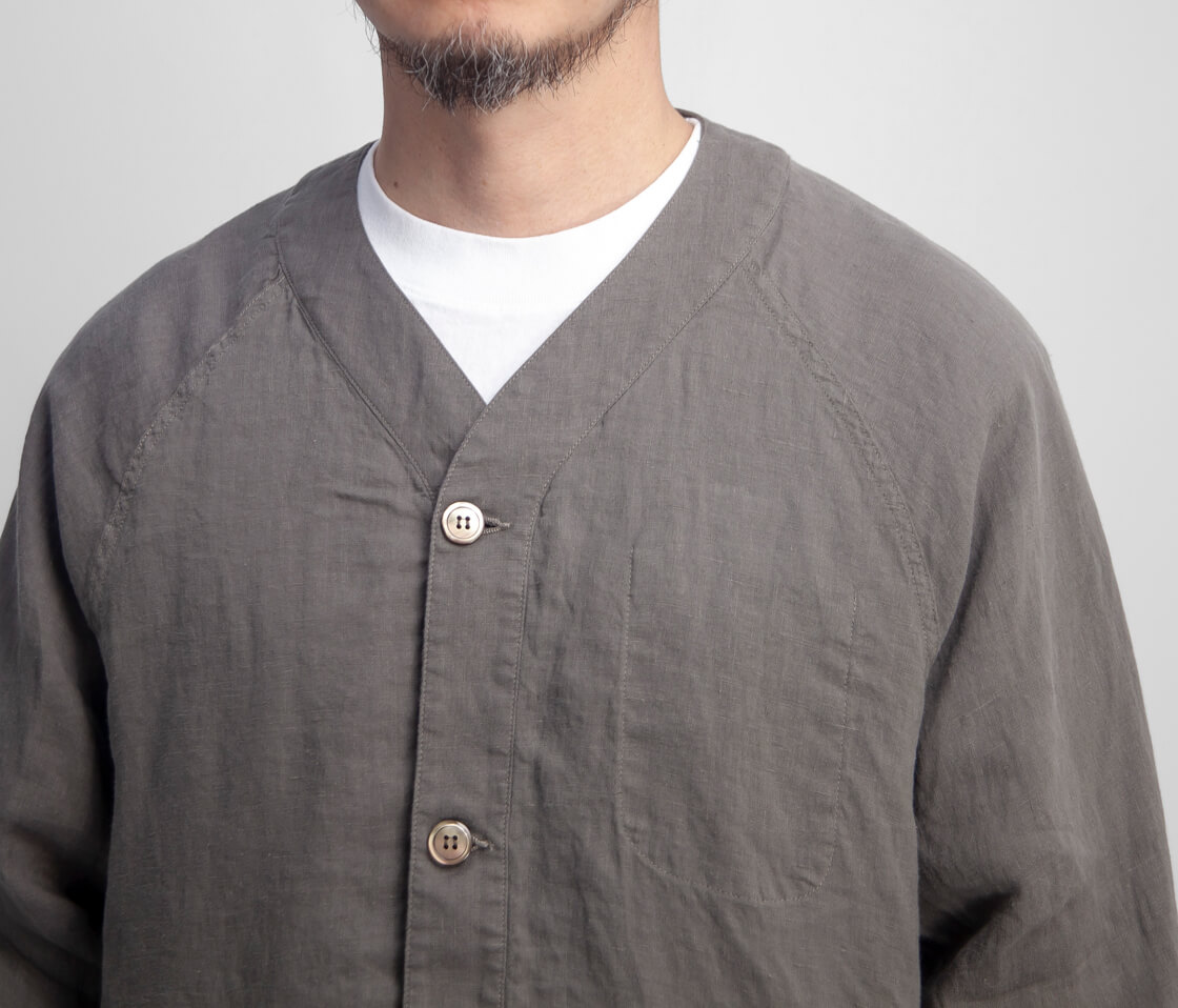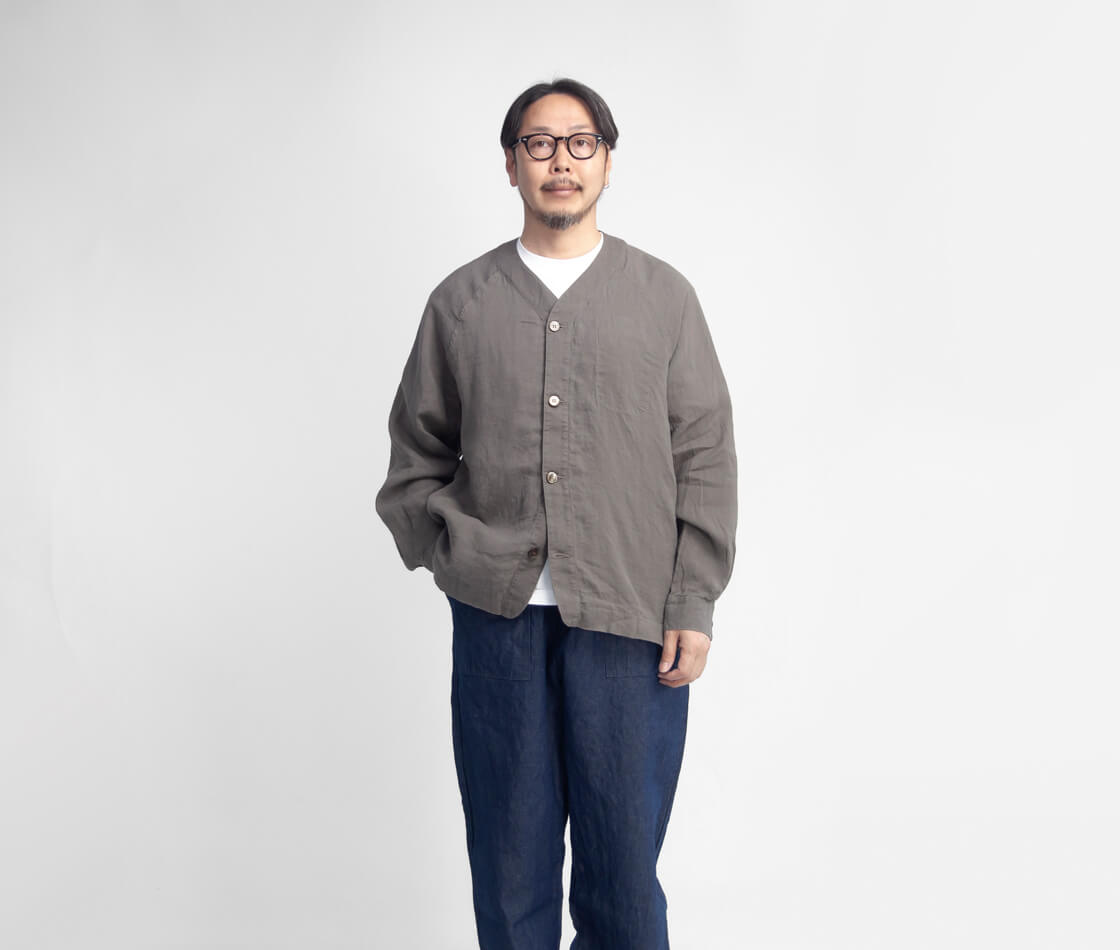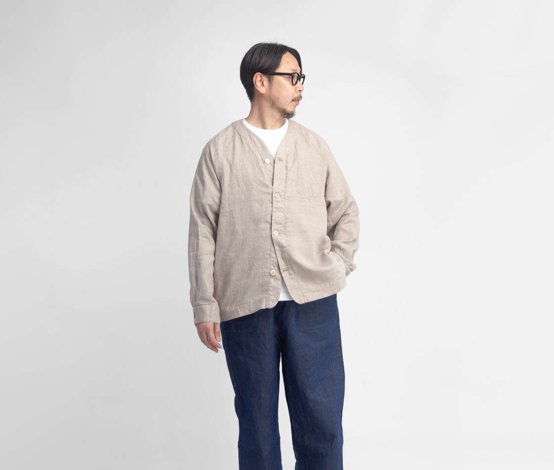 リネンを100%使用した、清涼感あふれる have a good day のカーディガン「Linen cardigan」。軽やかな着心地と雰囲気の良さを兼ね備え、春夏の軽い羽織りとしてちょうどいい一着です。フロントは、艶のある品の良いボタン仕様。脇には実用的なシームポケットを備え、さらに左胸の内側には内ポケットも設けられるなど、シンプルながら気の利いたディテールも魅力。袖付けは肩幅を選ばないラグランスリーブ。ボタンホールにはほつれにくい流れハトメを採用しており、シャツ感覚の軽快さがありながら、どこかアウターライクな表情も感じさせます。ゆったりとしたシルエットは、空気をはらむような軽やかさで風抜けも良好。少しオーバーサイズ気味のTシャツの上からでも無理なく羽織れる、春夏らしいリラックス感のある仕上がりです。