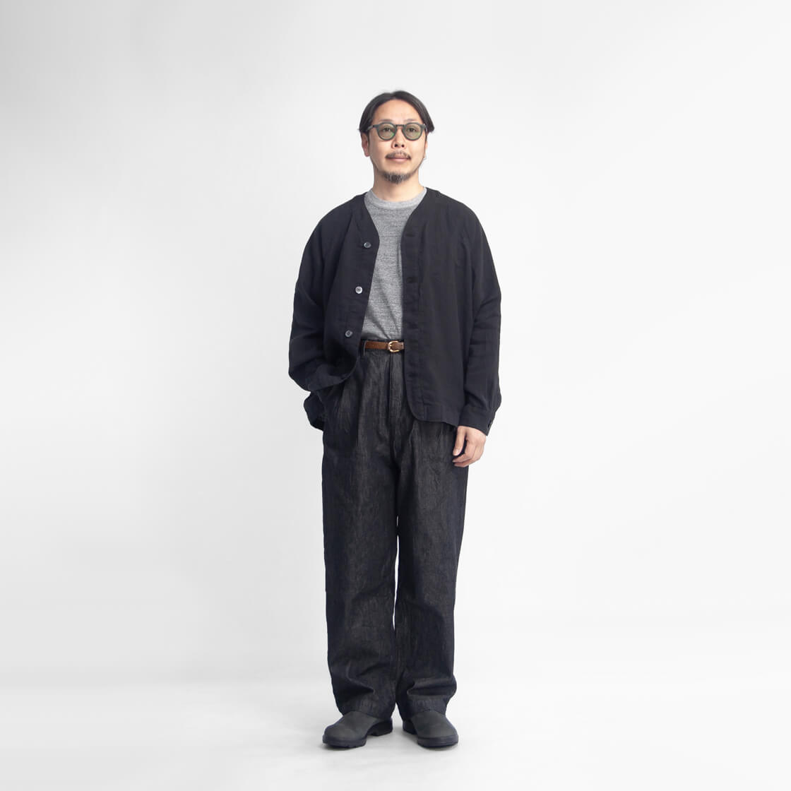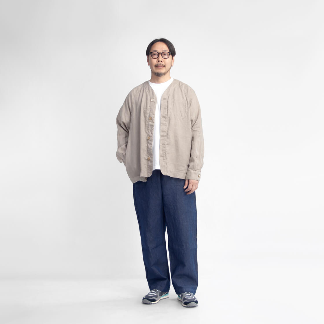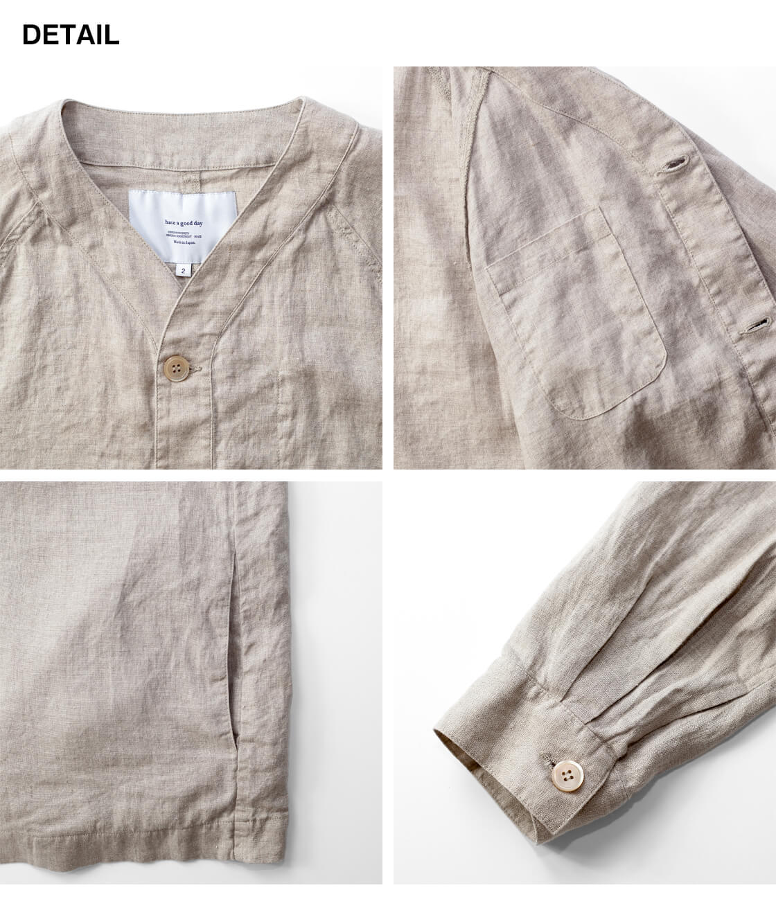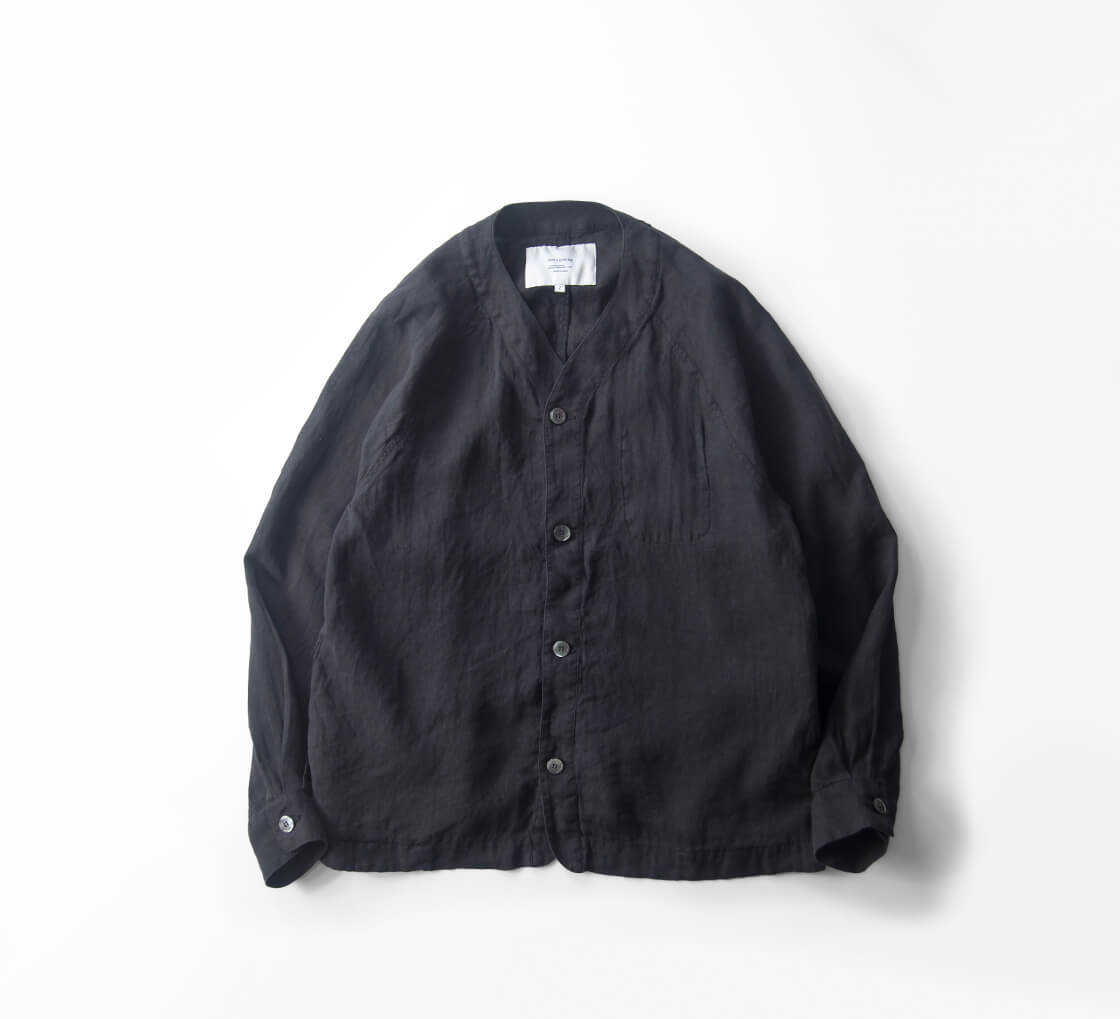 リネンを100%使用した、清涼感あふれる have a good day のカーディガン「Linen cardigan」。軽やかな着心地と雰囲気の良さを兼ね備え、春夏の軽い羽織りとしてちょうどいい一着です。フロントは、艶のある品の良いボタン仕様。脇には実用的なシームポケットを備え、さらに左胸の内側には内ポケットも設けられるなど、シンプルながら気の利いたディテールも魅力。袖付けは肩幅を選ばないラグランスリーブ。ボタンホールにはほつれにくい流れハトメを採用しており、シャツ感覚の軽快さがありながら、どこかアウターライクな表情も感じさせます。ゆったりとしたシルエットは、空気をはらむような軽やかさで風抜けも良好。少しオーバーサイズ気味のTシャツの上からでも無理なく羽織れる、春夏らしいリラックス感のある仕上がりです。