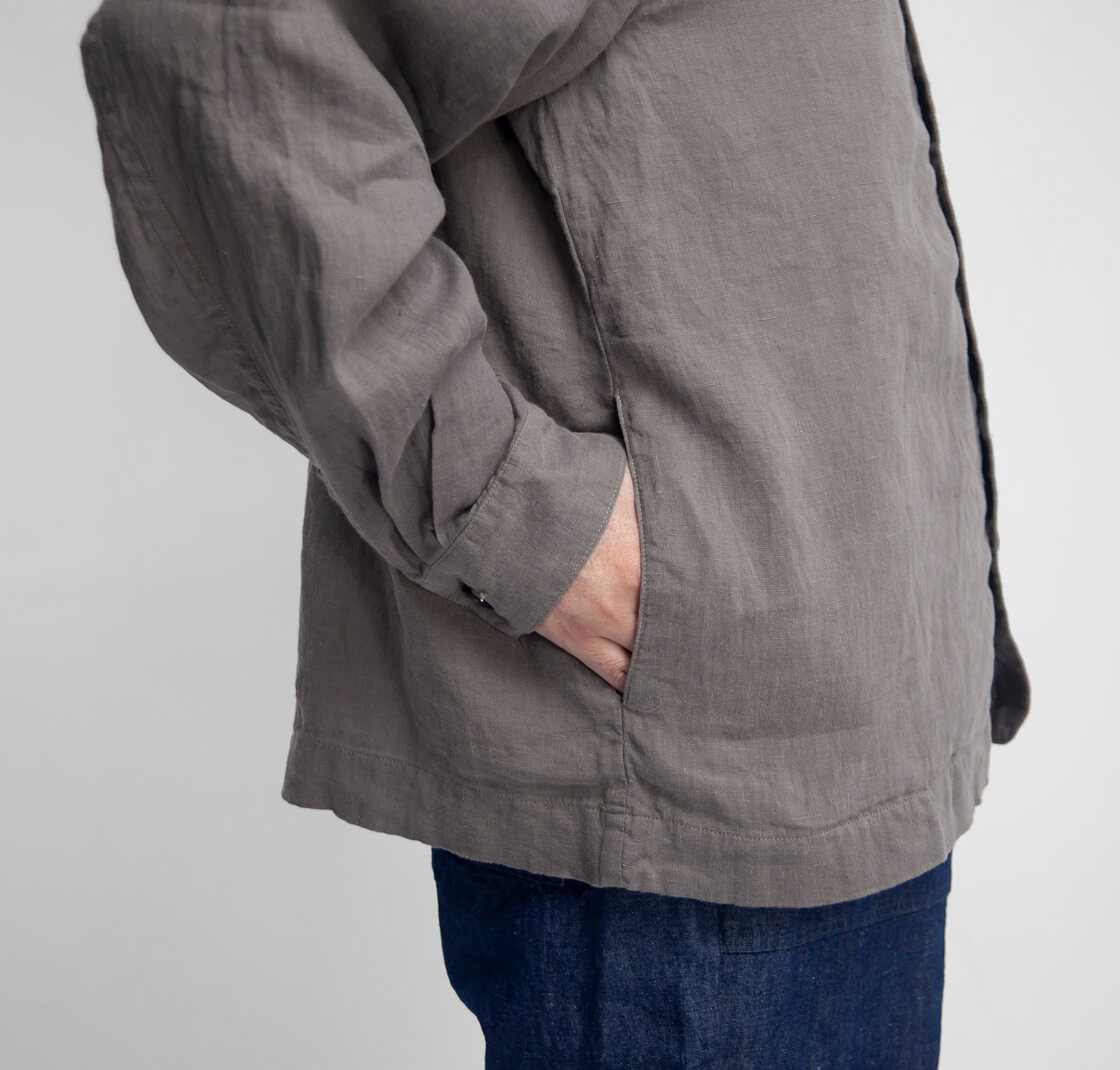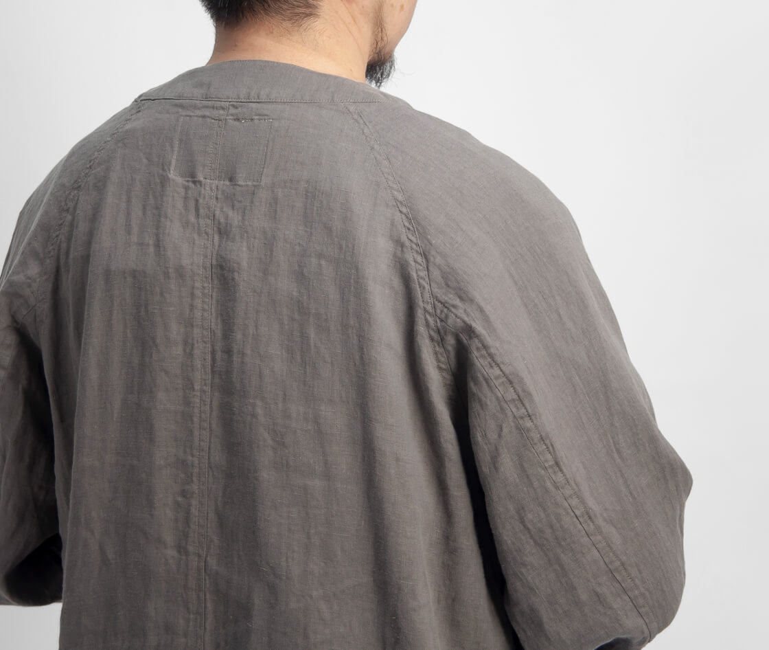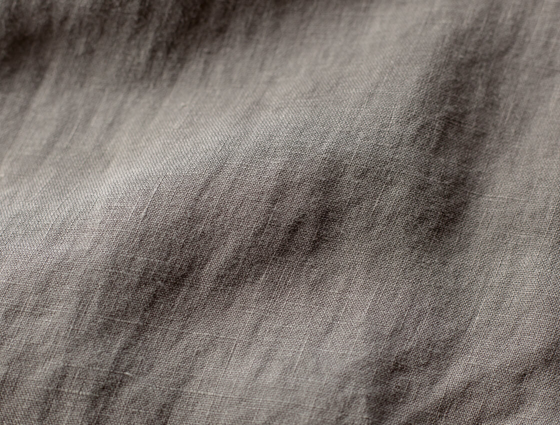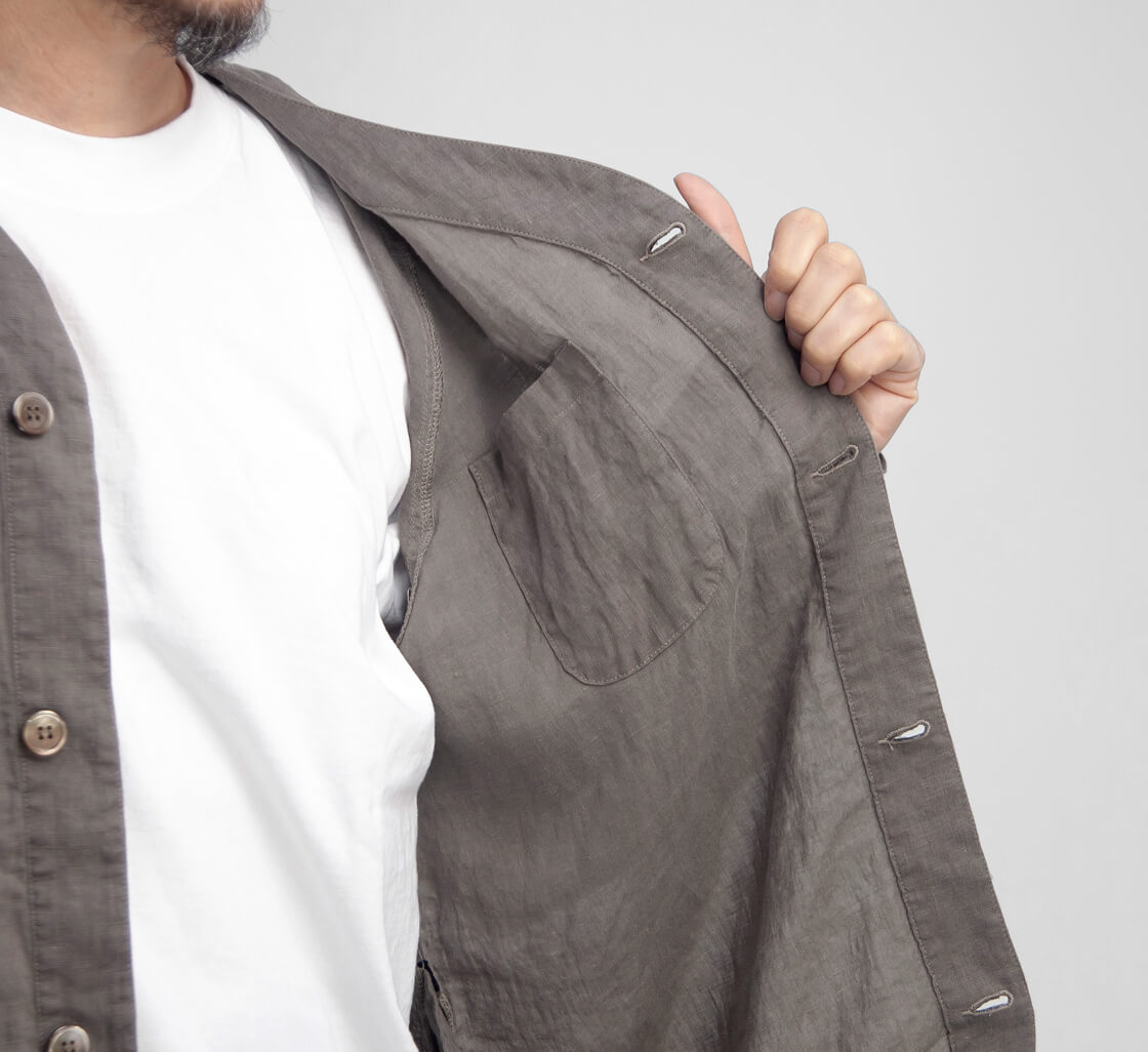 本体に使用している生地は、湿気の多い日本の夏にピッタリな吸水性に速乾性に優れたリネン(亜麻)を100%使用した、平織りのリネンキャンバス生地。着始めはキャンバスの少しゴワッとした質感ですが、60番手糸のやや透け感のある薄手の生地なので、着込むことですぐに馴染み、柔らかく変化します。夏にも心地よい清涼感が感じられ、膨らみ、シワ感、カラッと乾いたシャリ感がなんと言ってもリネンの魅力。リネン(亜麻)の特性と言えば、洗濯に強くて水に濡れると60%も増す強度、綿に比べ吸湿性が約1.5倍、放湿性は約1.4倍もあるということ。また、天然の抗菌・防臭性も持ち合わせているので、細菌類が繁殖しにくく衛生的。高温多湿な日本の夏では、気候の面からみても麻を使うことは適しているといえます。