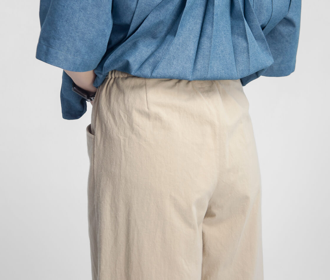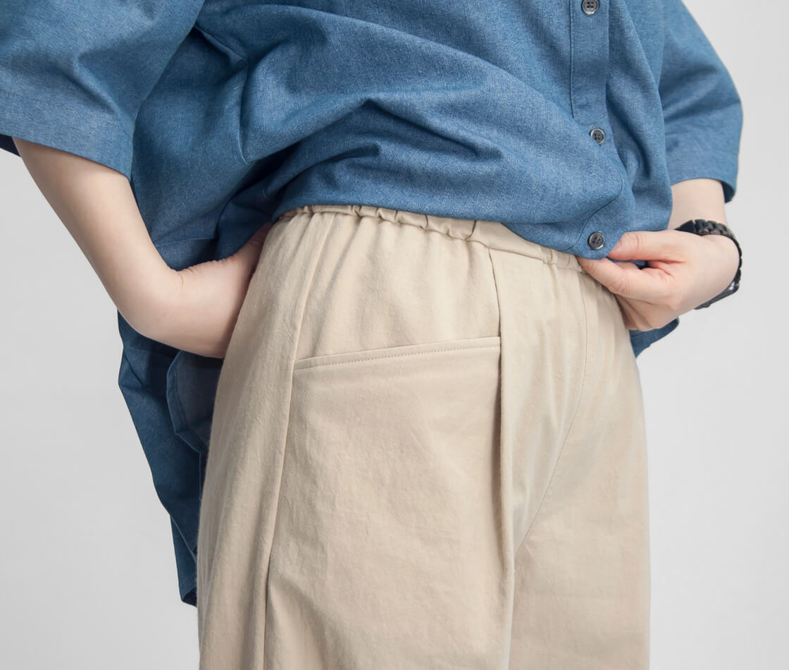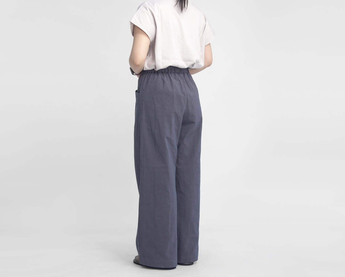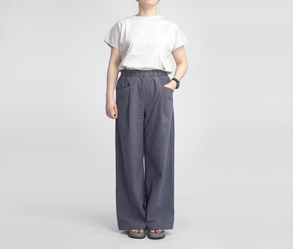 ゆとりのあるワイドシルエットが特徴で、脚のラインを拾わず体型をさりげなくカバー。落ち感のある生地によって広がりすぎず、動くたびに自然なドレープが生まれ、女性らしい柔らかな印象を演出します。ウエストは総ゴム仕様に加え、ドローコードを内蔵しているため、お好みのフィット感に調整可能で着脱もスムーズ。腰まわりにはワンタックを施し、立体感と動きやすさをプラスしています。また、タックから自然につながるようにデザインされたポケットは、ワークテイストをさりげなく取り入れた実用性とデザイン性を兼ね備えた仕様です。