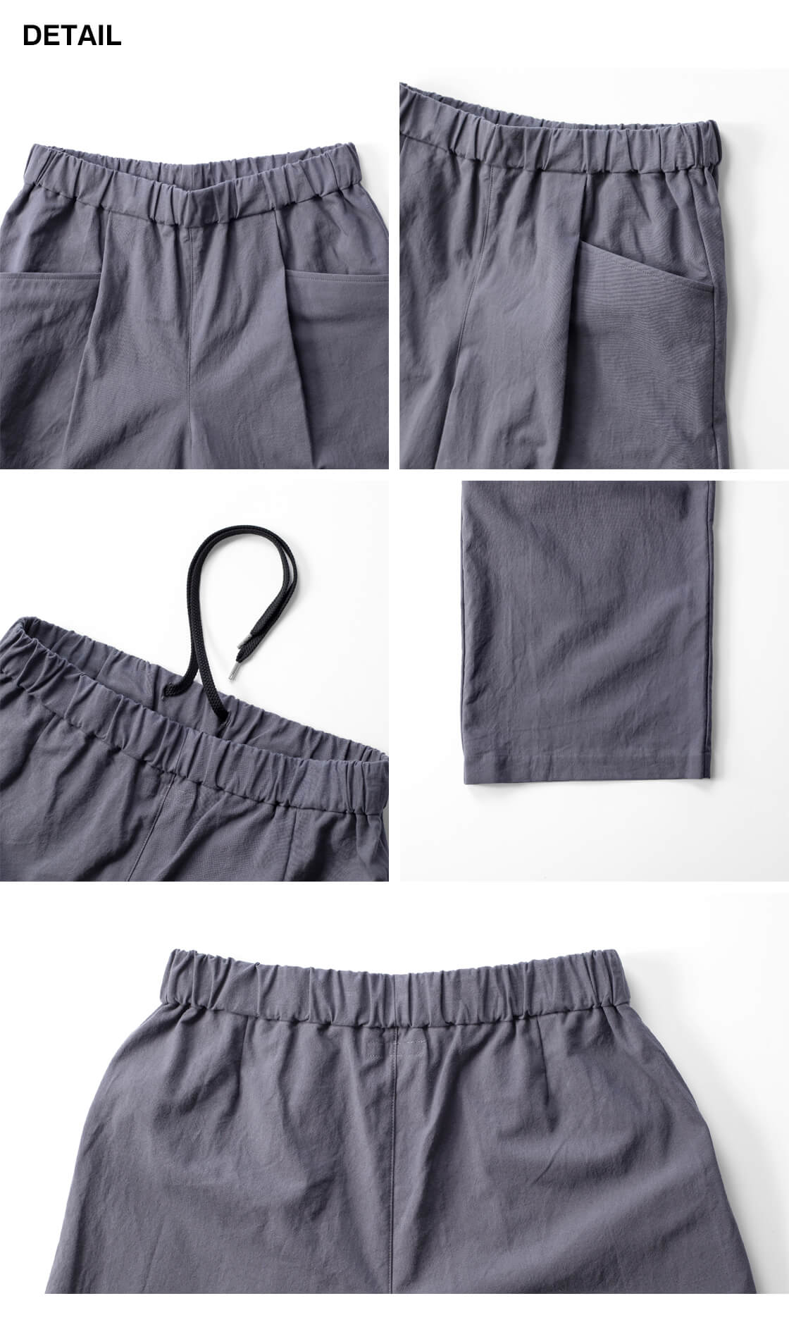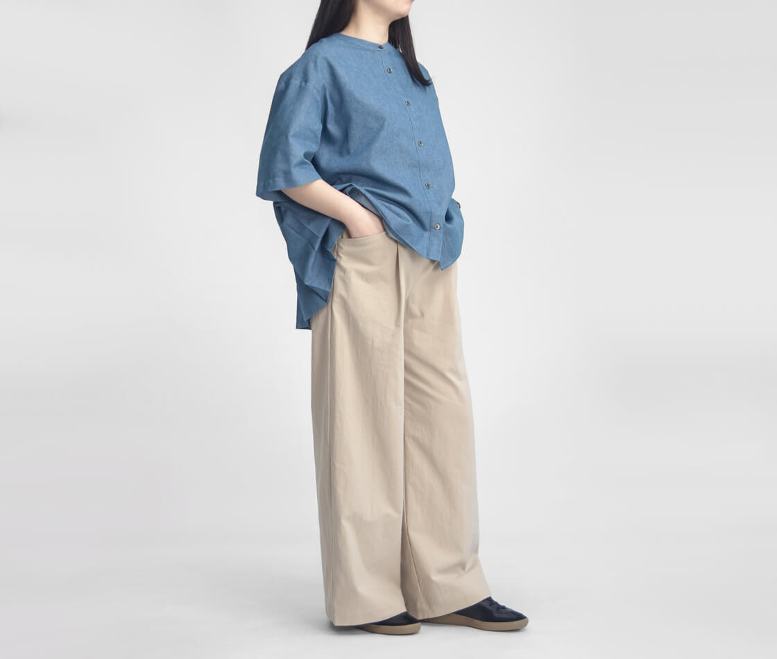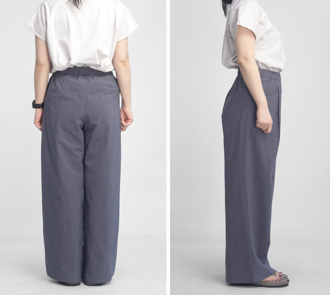 ゆとりのあるワイドシルエットが特徴で、脚のラインを拾わず体型をさりげなくカバー。落ち感のある生地によって広がりすぎず、動くたびに自然なドレープが生まれ、女性らしい柔らかな印象を演出します。ウエストは総ゴム仕様に加え、ドローコードを内蔵しているため、お好みのフィット感に調整可能で着脱もスムーズ。腰まわりにはワンタックを施し、立体感と動きやすさをプラスしています。また、タックから自然につながるようにデザインされたポケットは、ワークテイストをさりげなく取り入れた実用性とデザイン性を兼ね備えた仕様です。