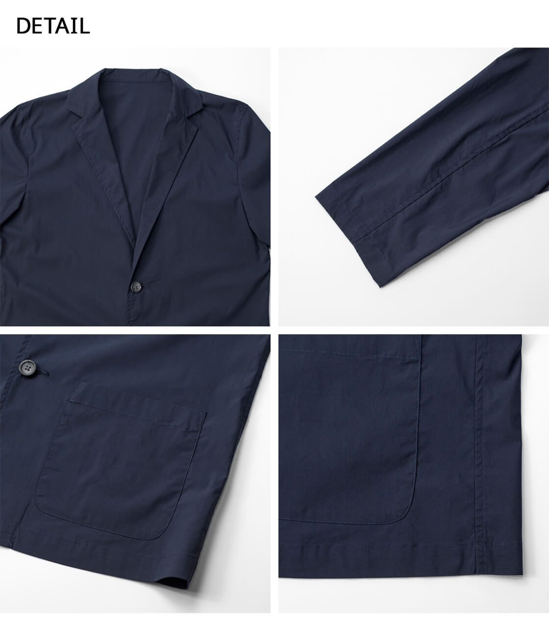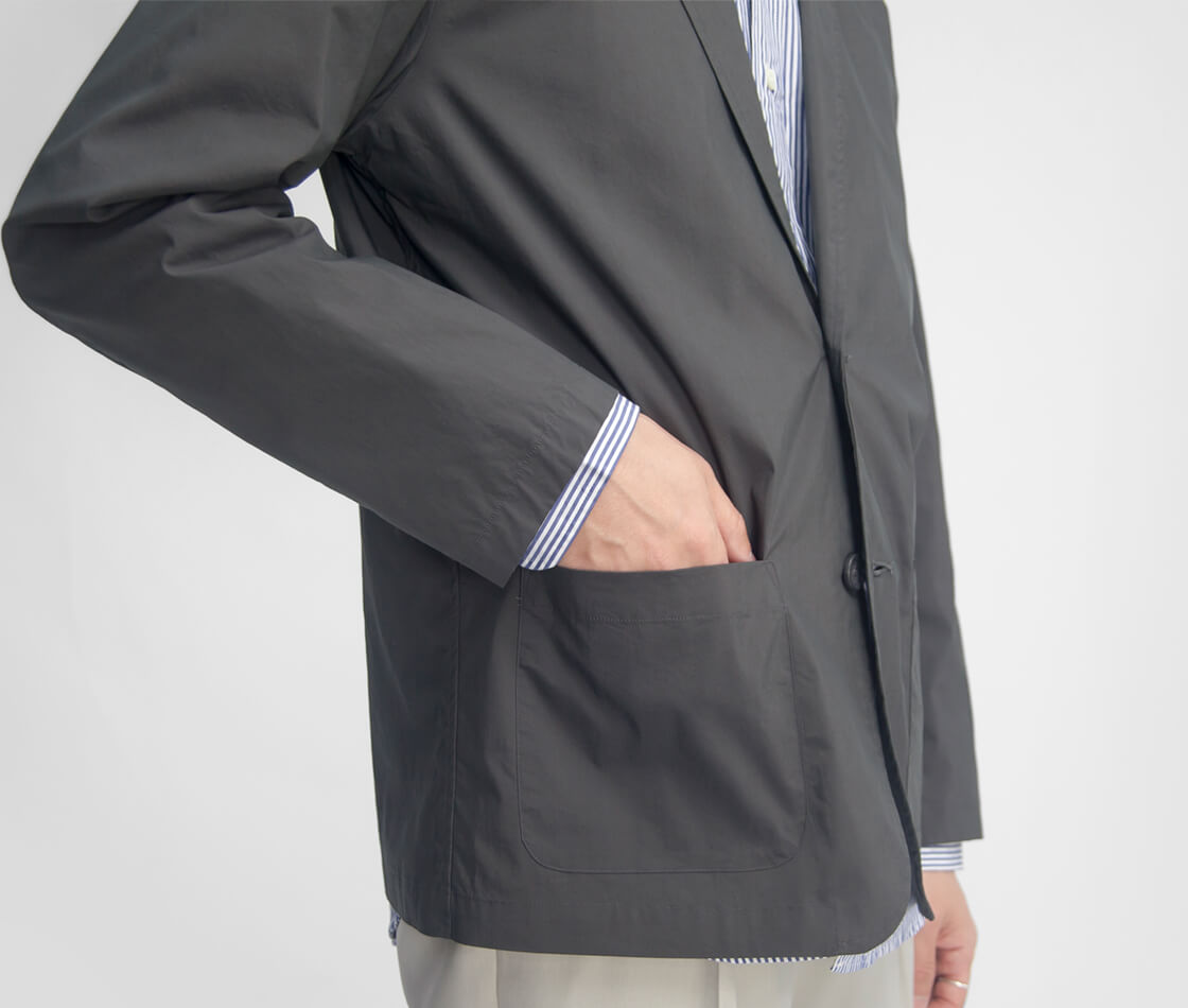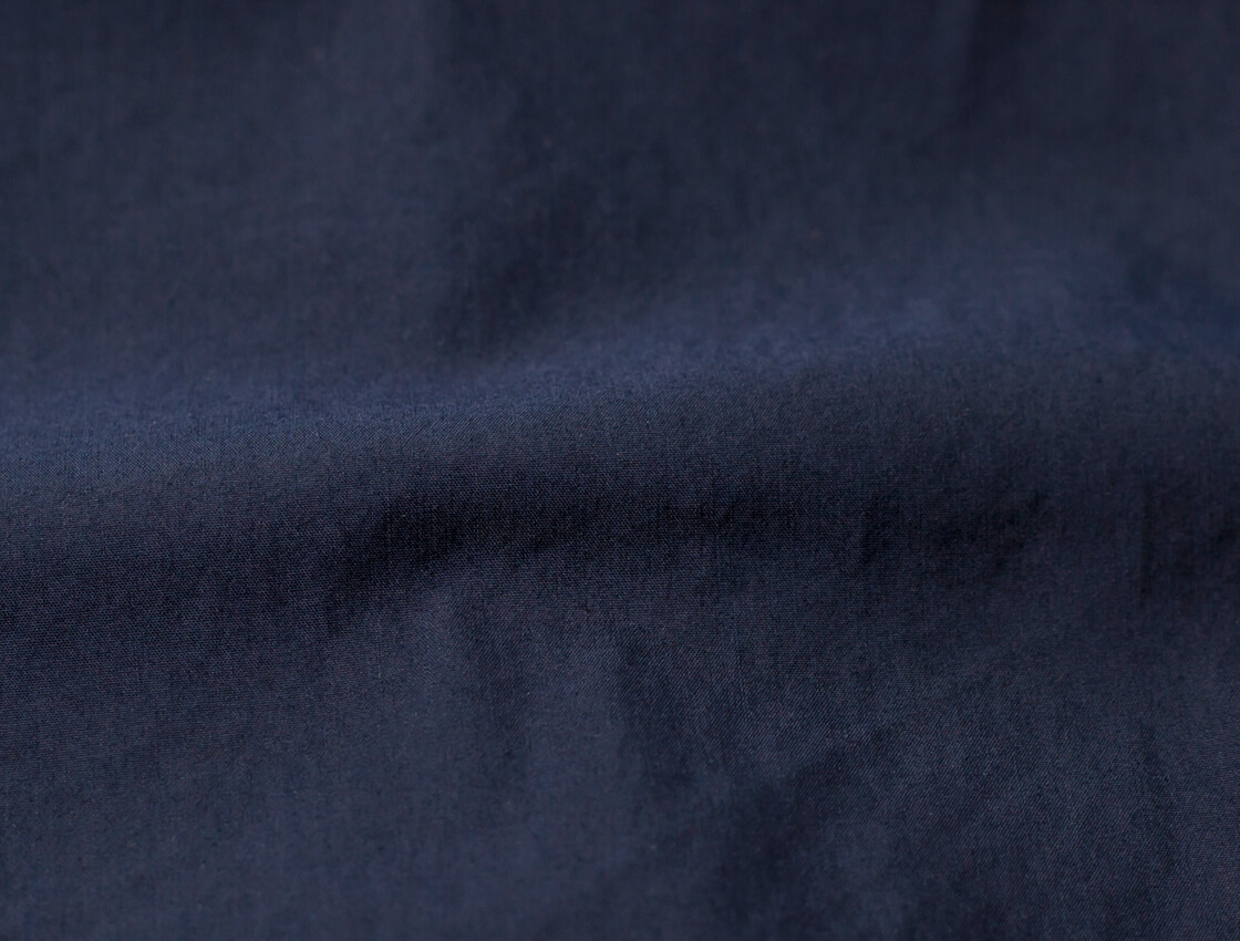 本体には、自然な光沢感と適度な伸縮性、軽量さを備えたタイプライター生地を使用。経糸に50番手のコットン、緯糸に高機能ポリエステル素材であるT400を組み合わせたハイブリッド構造の生地です。T400とは、収縮率の異なる2種類のポリエステルを組み合わせた複合繊維。糸そのものがバネのように働くため、動きに合わせてしなやかに伸び、優れた形状回復性を発揮します。そのT400をコットンと掛け合わせることで自然な風合いを活かしながら、型崩れしにくく、美しいシルエットを保ちやすくしたのがこの生地なのです。さらに風合い加工と製品洗いを施すことで、ふっくらと滑らかなタッチに仕上げています。イージーケア性にも優れ、ご家庭での洗濯が可能なのも嬉しいポイント。見た目は上品で、着心地が軽快な春夏らしい素材です。