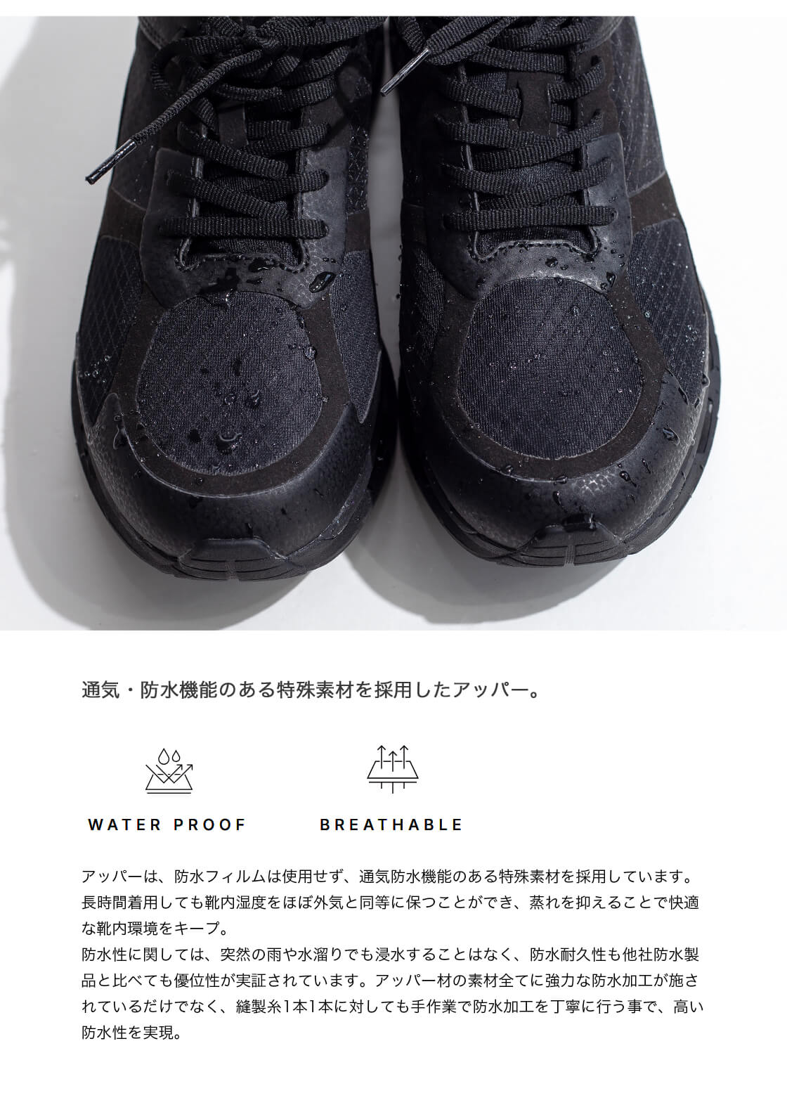 アッパーは、防水フィルムは使用せず、通気防水機能のある特殊素材を採用しています。