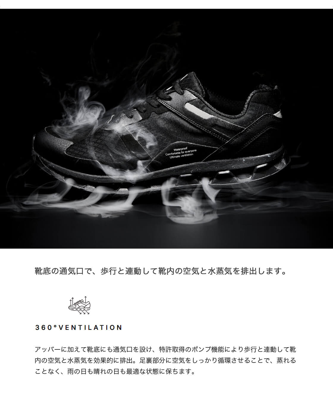 アッパーに加えて靴底にも通気口を設け、特許取得のポンプ機能により歩行と連動して靴内の空気と水蒸気を効果的に排出。