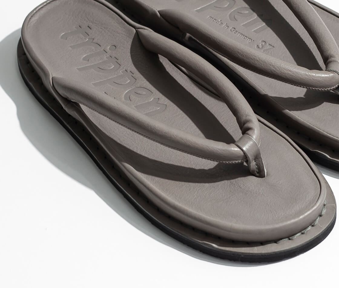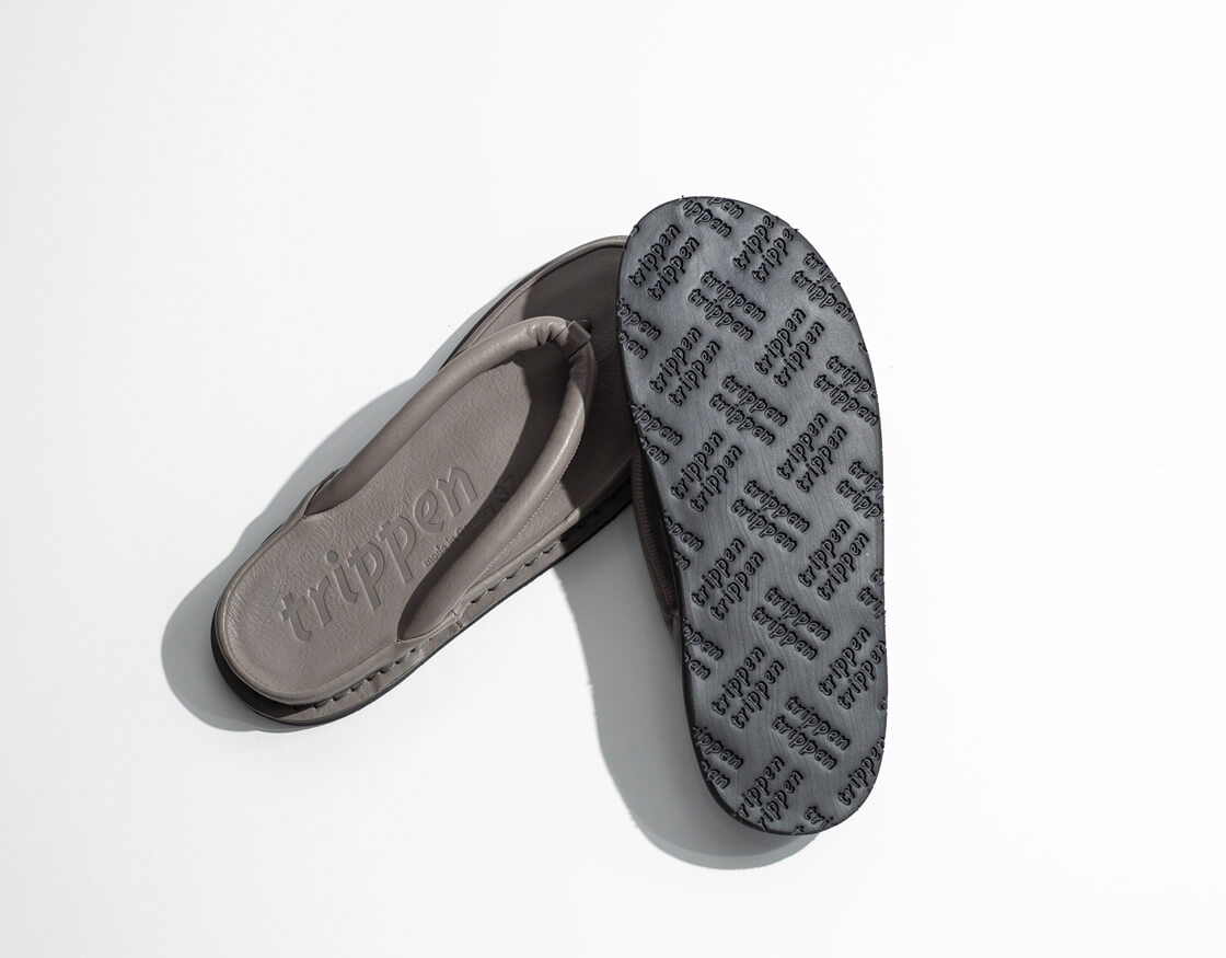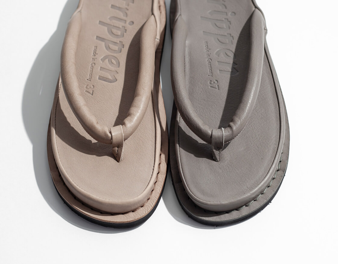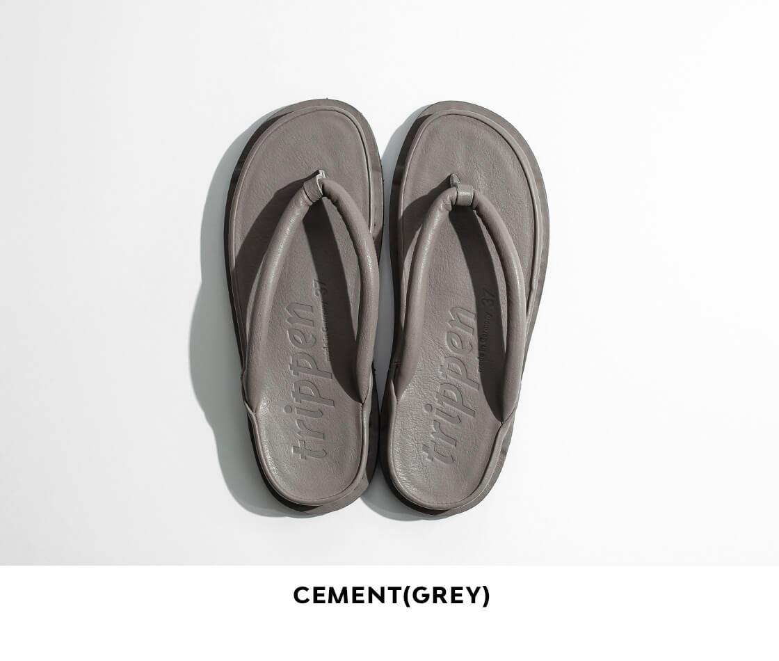 日本の草履に着想を得て、trippenのフィルターで再構築した「ZORI」。当店限定の別注カラー「CEMENT」を含む、ニュアンスカラーで仕上げた洗練の一足。