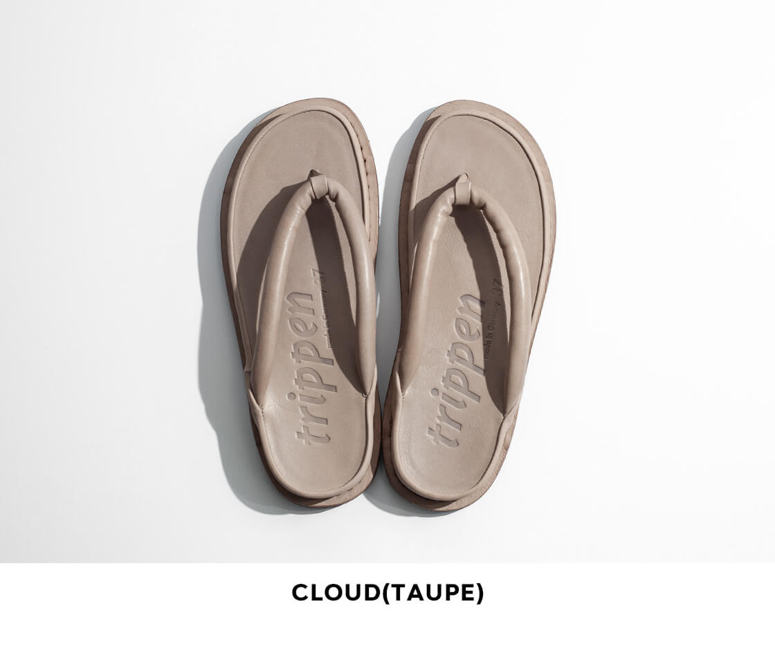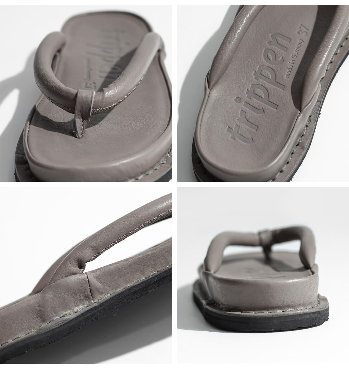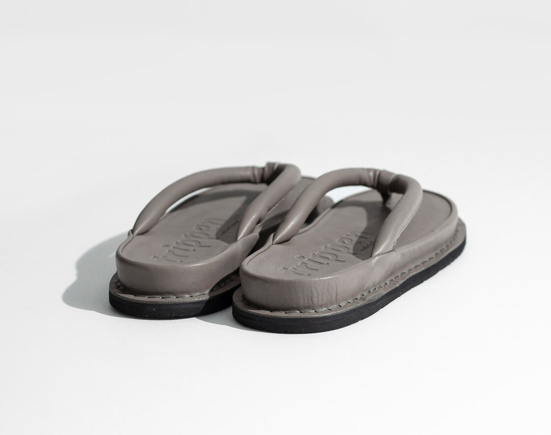 日本の草履に着想を得て、trippenのフィルターで再構築した「ZORI」。当店限定の別注カラー「CEMENT」を含む、ニュアンスカラーで仕上げた洗練の一足。