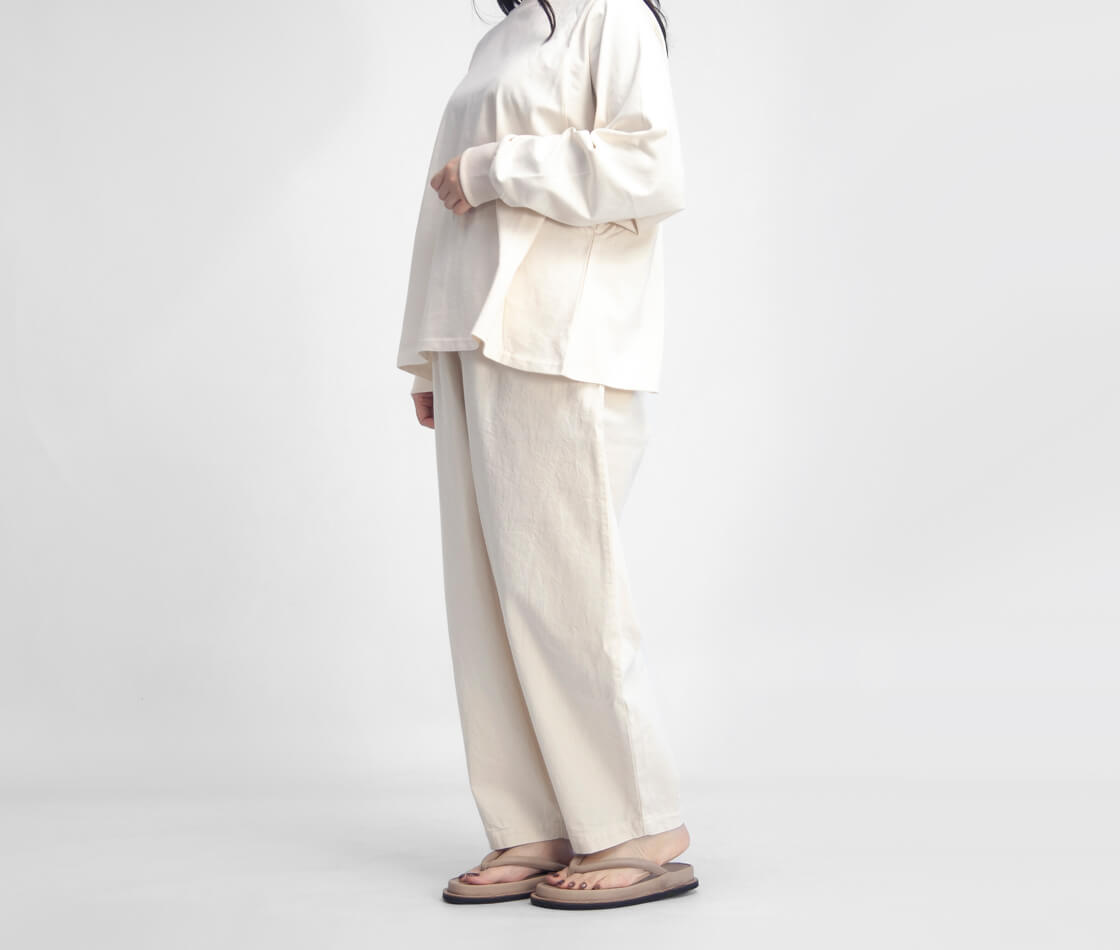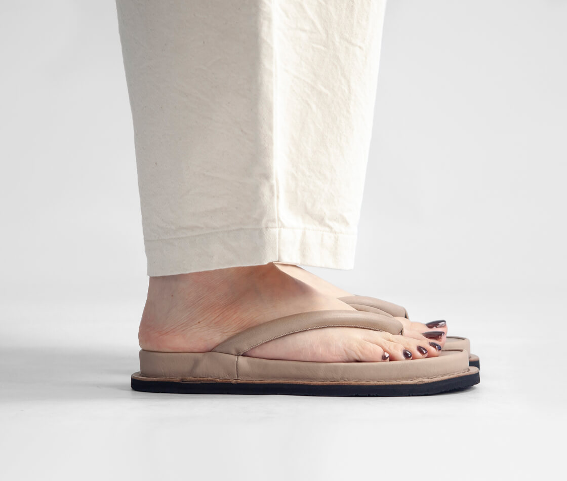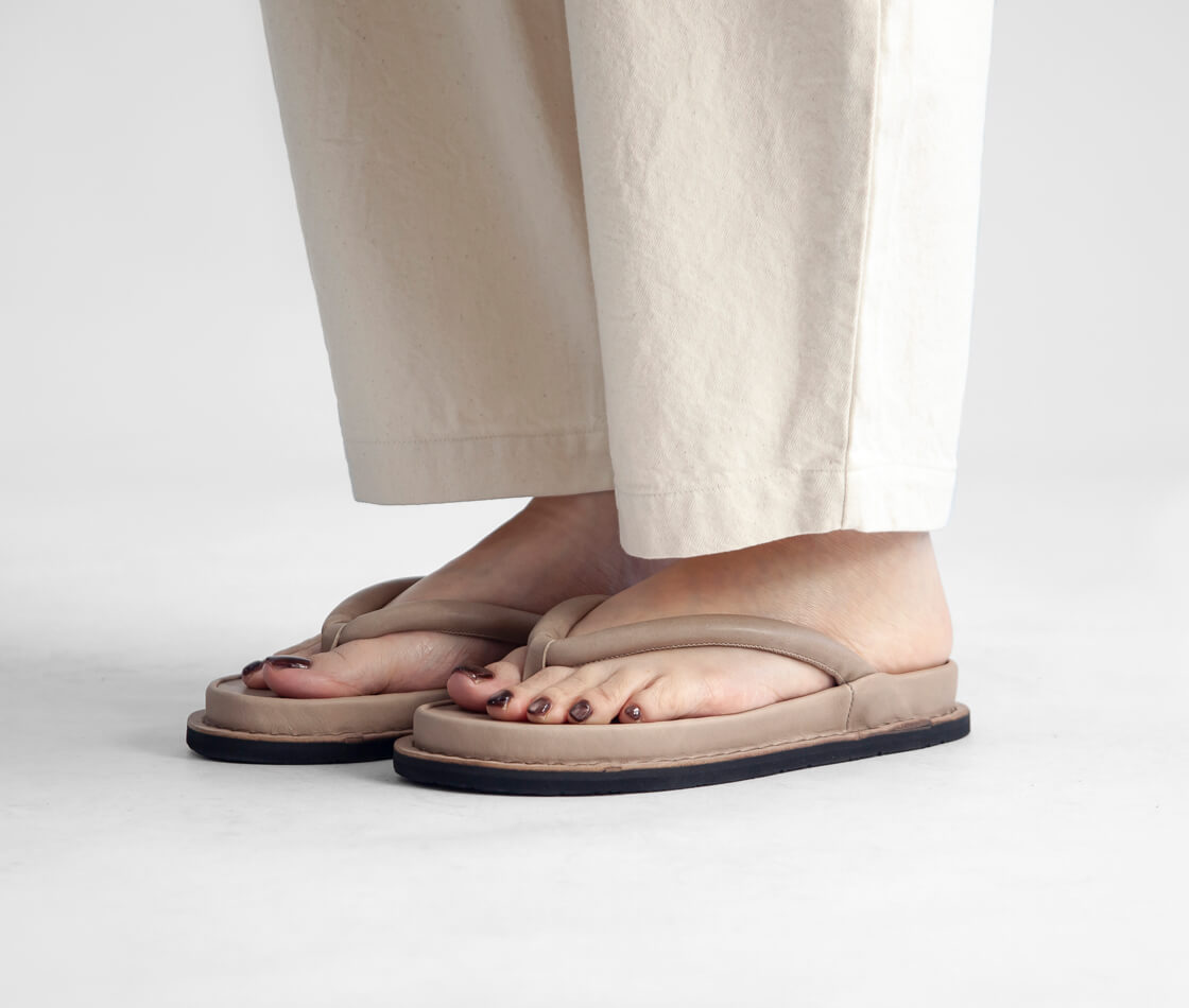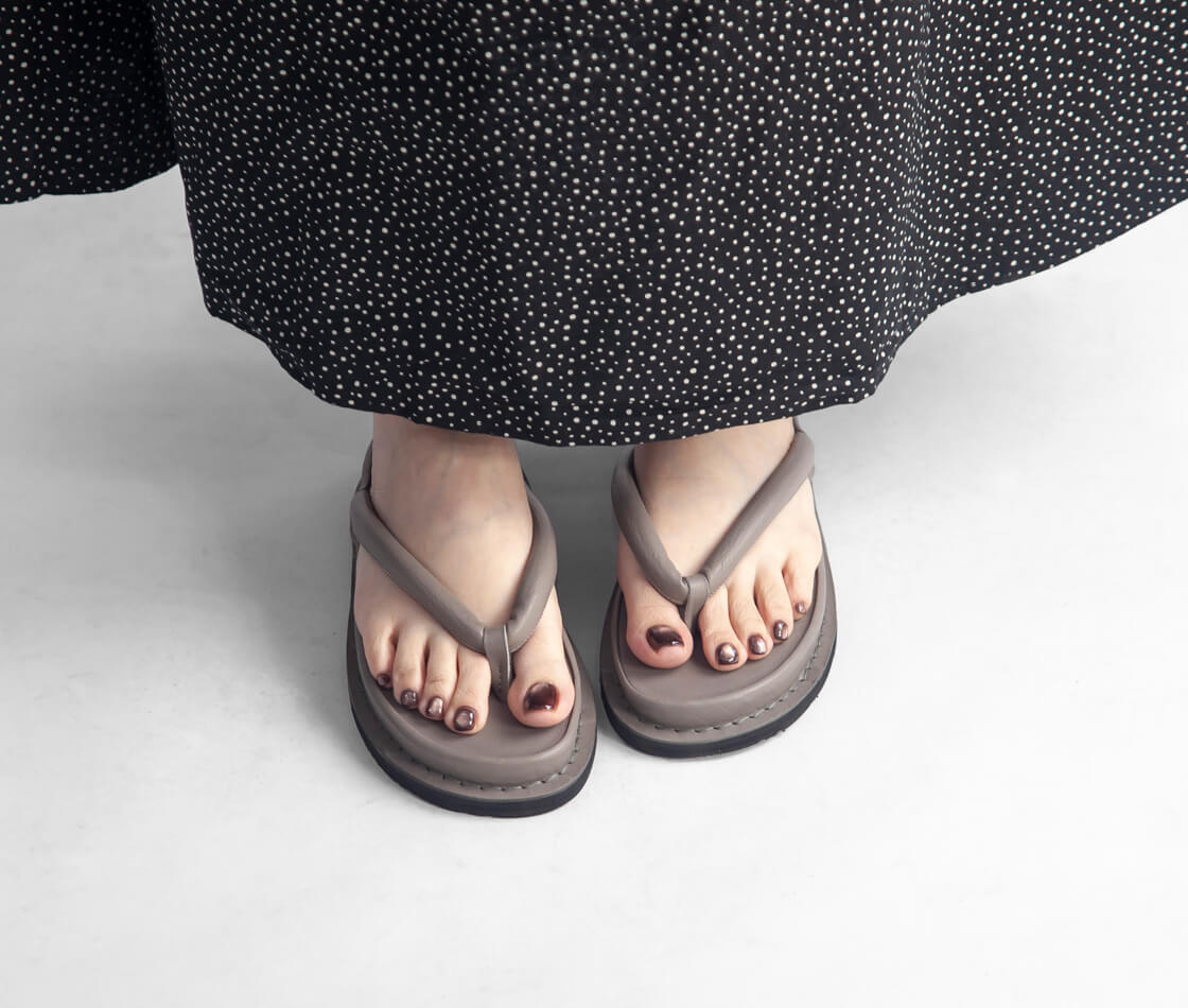 鼻緒、前坪に関してもカーフレザーで仕上げられていて、その鼻緒はクッション性があるので履き心地もソフト。パンツにもスカートにもワンピースにも自然と馴染みますが、ぜひ合わせていただきたいのが着物や浴衣。草履をルーツに持つ一足だからこそ相性は抜群で、装いをぐっと洗練された印象へと引き上げてくれます。