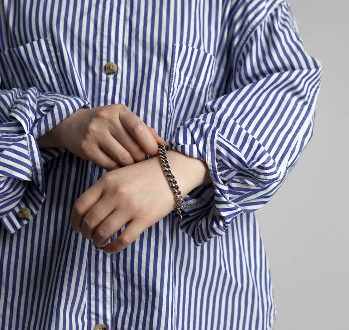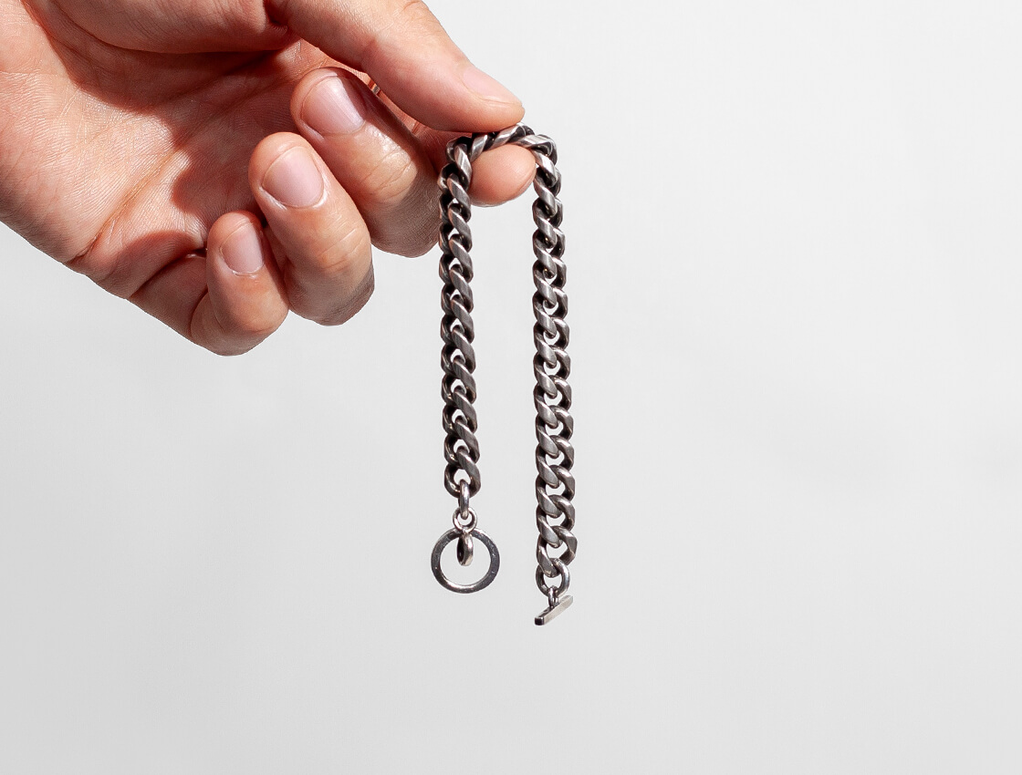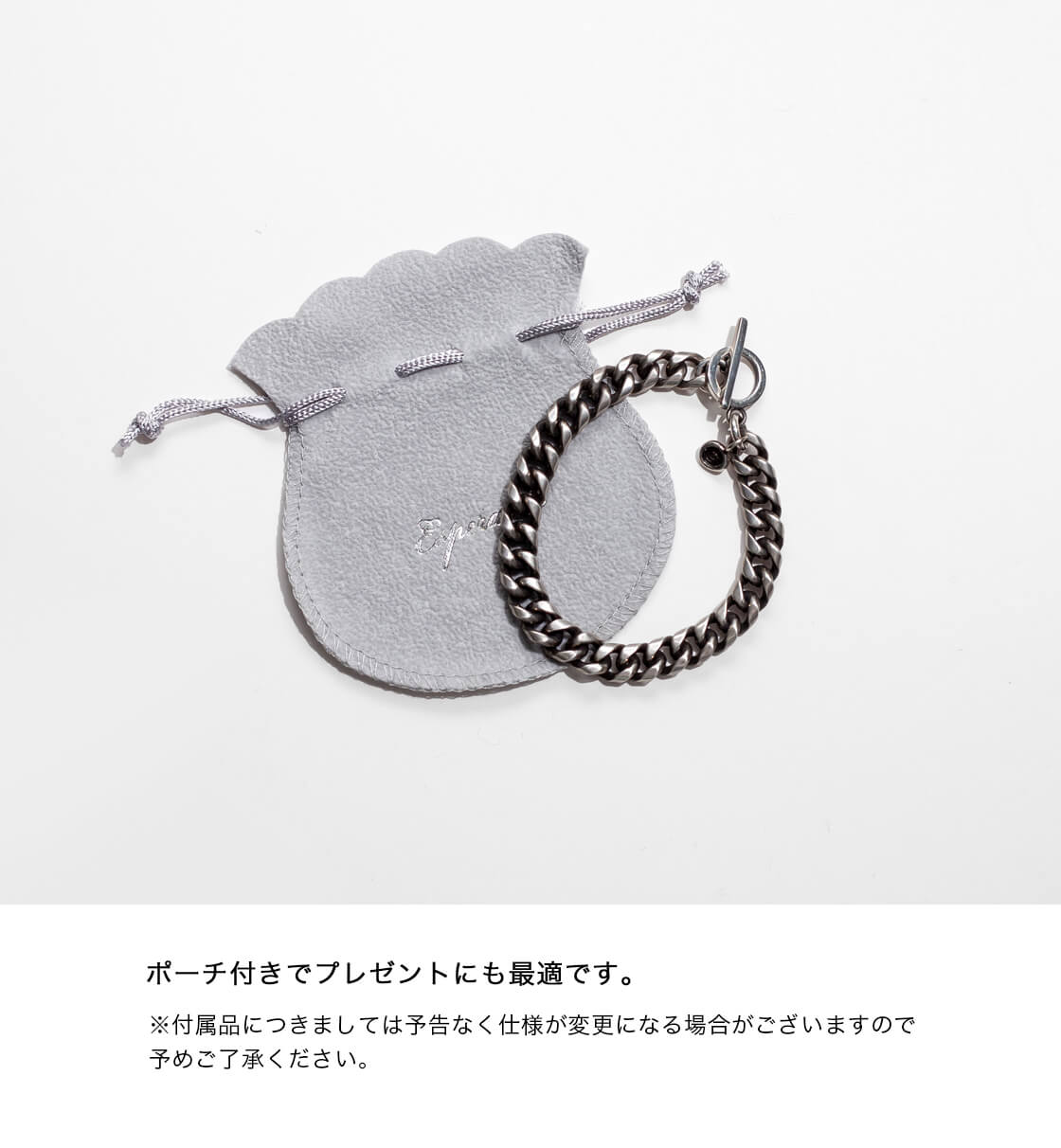 ボリューム感のあるブレスレットは、薄着の季節のファッションアイテムの中でも主役になれる程の名脇役。コチラのエスペラントのシルバー925製チェーンブレスレットはシンプルですが、一本で十分存在感のあるボリューム感で、燻し加工を入れた奥行きのある表情は、チェーンの陰影をより際立たせてくれる。リングに通すだけの簡単装着で小振りなチャームもアクセントになります。