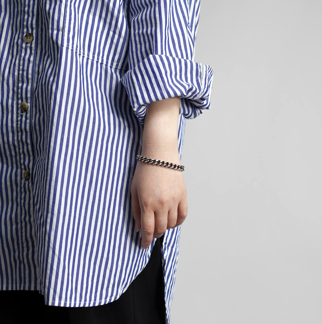 サイズは18.5cm。女性だと、すこしオーバーで下に垂らす感じでの着用に。男性だと、手首の細い方なら少し下に垂れる感じ、標準的な方だとちょうど良いサイズ感になるかと思います。大体15~17cmくらいの手首回りの方が適したサイズになるかと思います。ボリューム感のあるブレスレットは、それだけでコーディネートの主役になれるほどインパクト抜群。そして使うごとにくすみが取れ輝きを増していくエイジングは、使い込むという楽しみも与えてくれます。是非ご検討下さい。