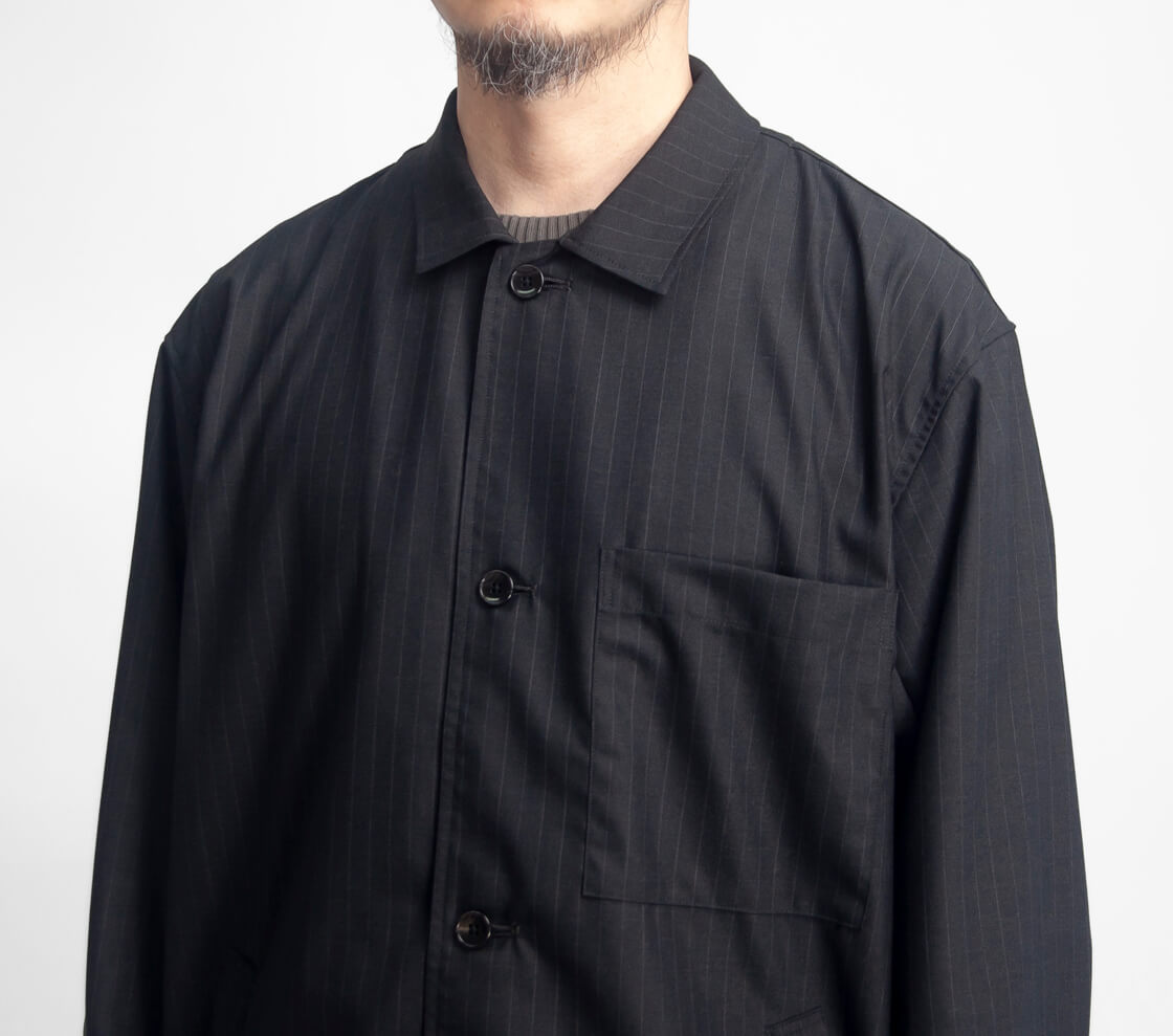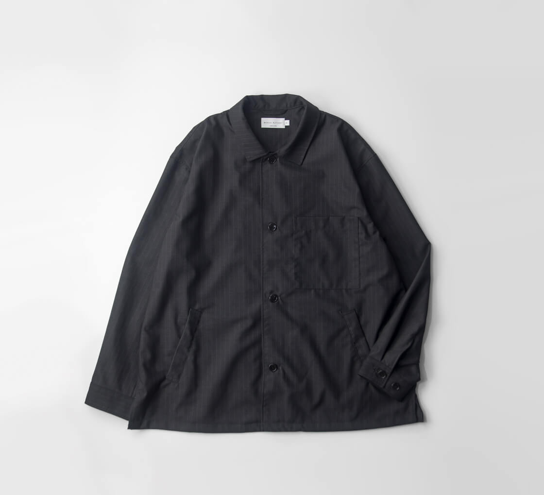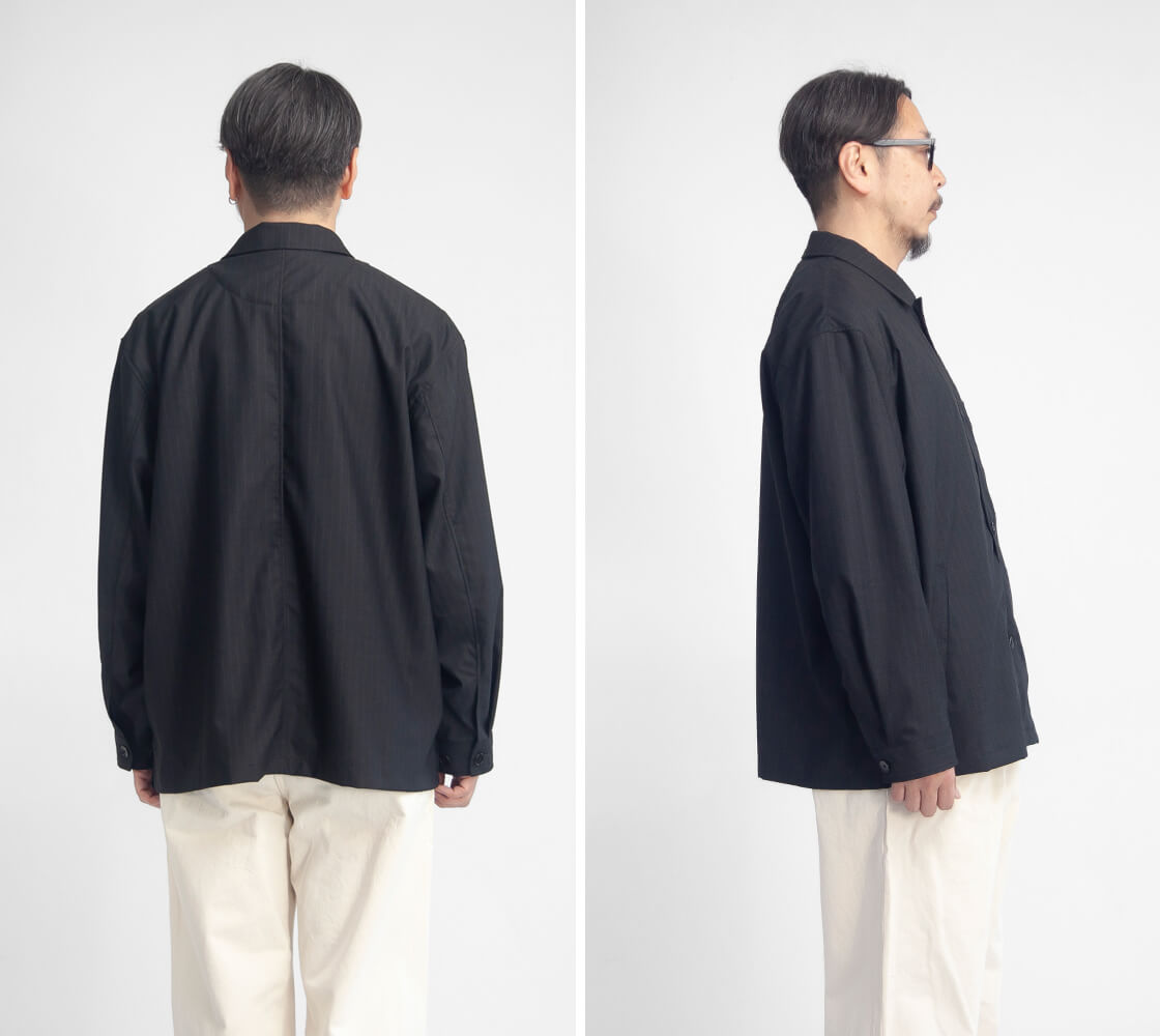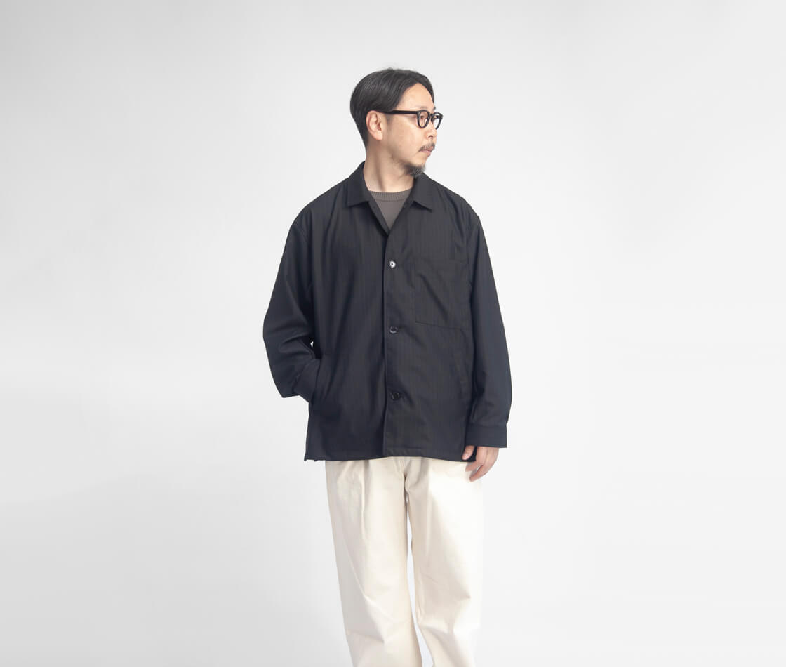 何といってもポリエステル・ウール混紡のトロピカル生地の上品な表情が大人顔な、MANUAL ALPHABETのカバーオール「T/W/R TROPICAL JACKET(T/W/Rトロピカルジャケット)」。デザインのベースになっているのは、フレンチワークを象徴するカバーオール。象徴的な腰のパッチポケットは箱ポケットへとアレンジされ、見た目のすっきりさと手の入れやすさを両立。衿はやや小ぶりに抑えつつ、横に少し広げた設計。トップボタンを外せば、オープンカラーのような抜けのある表情が自然と生まれます。袖口はボタン2つで調整できるカフス仕様、さらに裾脇には浅めのスリットを入れることで、動きやすさと軽やかさもさりげなくプラス。全体はゆとりのあるボックスシルエット。生地の落ち感を活かしたパターンによって、リラックス感がありながらもラフに見えすぎない、絶妙なバランスに仕上がっています。