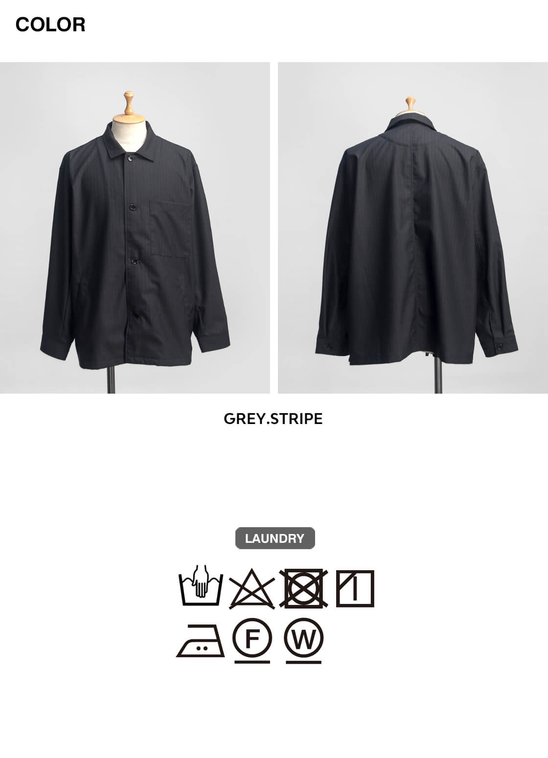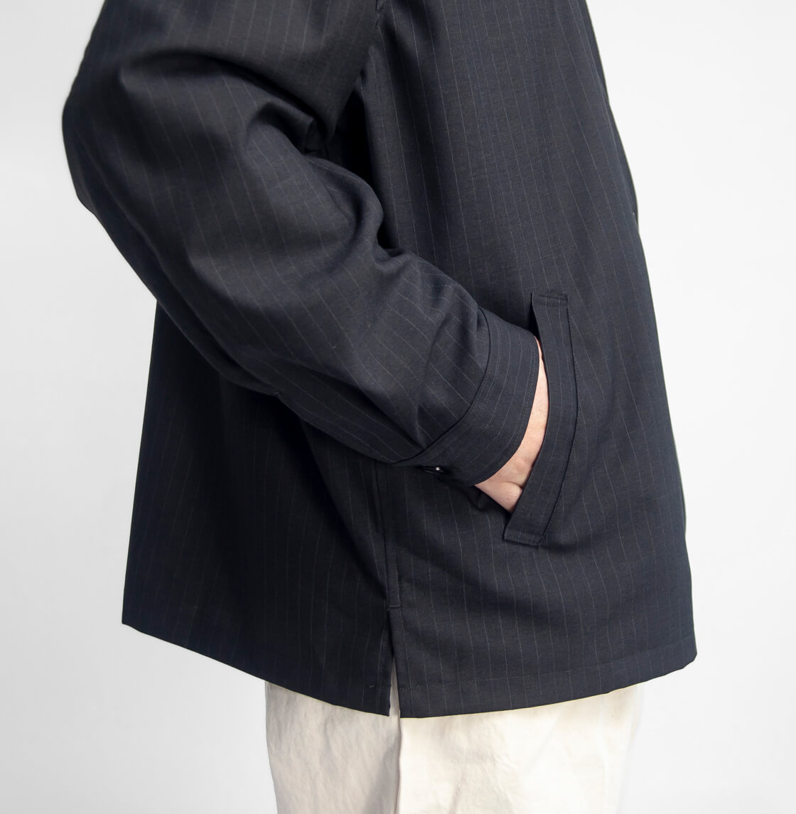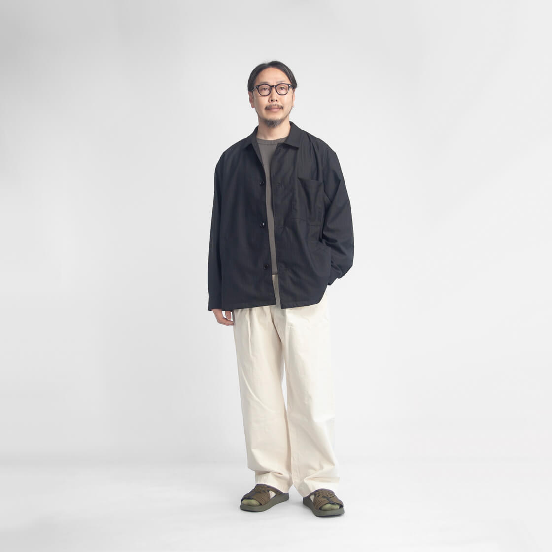 何といってもポリエステル・ウール混紡のトロピカル生地の上品な表情が大人顔な、MANUAL ALPHABETのカバーオール「T/W/R TROPICAL JACKET(T/W/Rトロピカルジャケット)」。デザインのベースになっているのは、フレンチワークを象徴するカバーオール。象徴的な腰のパッチポケットは箱ポケットへとアレンジされ、見た目のすっきりさと手の入れやすさを両立。衿はやや小ぶりに抑えつつ、横に少し広げた設計。トップボタンを外せば、オープンカラーのような抜けのある表情が自然と生まれます。袖口はボタン2つで調整できるカフス仕様、さらに裾脇には浅めのスリットを入れることで、動きやすさと軽やかさもさりげなくプラス。全体はゆとりのあるボックスシルエット。生地の落ち感を活かしたパターンによって、リラックス感がありながらもラフに見えすぎない、絶妙なバランスに仕上がっています。