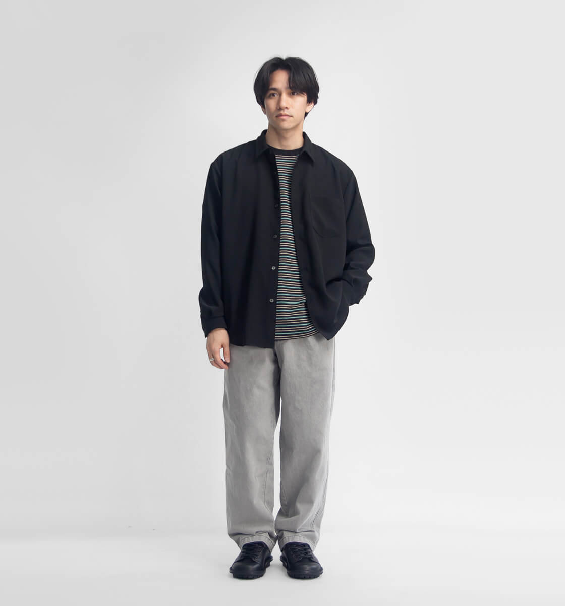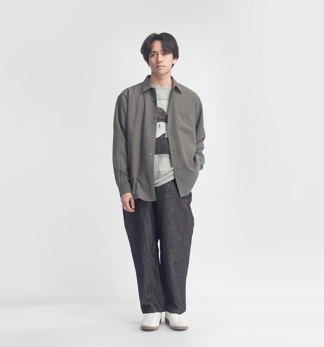ミニマルな見た目と、体から自然に離れるシルエットが生むしなやかなドレープ。そこに春夏に嬉しい機能性を備えたMANUAL ALPHABETの「RELA×ION TWILL WIDE RC SHIRTS」。小ぶりな襟や収まりの良い胸ポケットなど、ディテールはシンプルに構成。アームホールやヨーク、脇下、袖下はインターロックで縫製処理をしているので、縫い目がほとんど外から見えないクリーンで上品な仕上がりです。肩幅・身幅ともにゆとりを持たせつつ、着丈は長すぎないバランスで、体のラインを拾いすぎない今っぽいボックスシルエット。ボタンをすべて留めても窮屈さはなく、大人っぽく上品でありつつもほどよく力の抜けた印象で、第一ボタンと第二ボタンの間隔は短めに設定しているため、第一ボタンを開けた時のヌケ感も自然です。羽織りとして着ても雰囲気の出るワイドフィットは、しなやかなドレープを持つ生地とも相性が良く、肩の力を抜いた、大人のリラックス感をしっかり演出してくれます。
