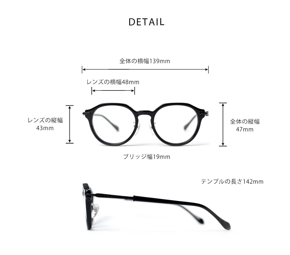 FREE / レンズ横幅48mm / レンズ縦幅43mm / 全体の横幅(フレーム込み)139mm / 全体の縦幅47mm / ブリッジ幅19mm / テンプル長さ142mm