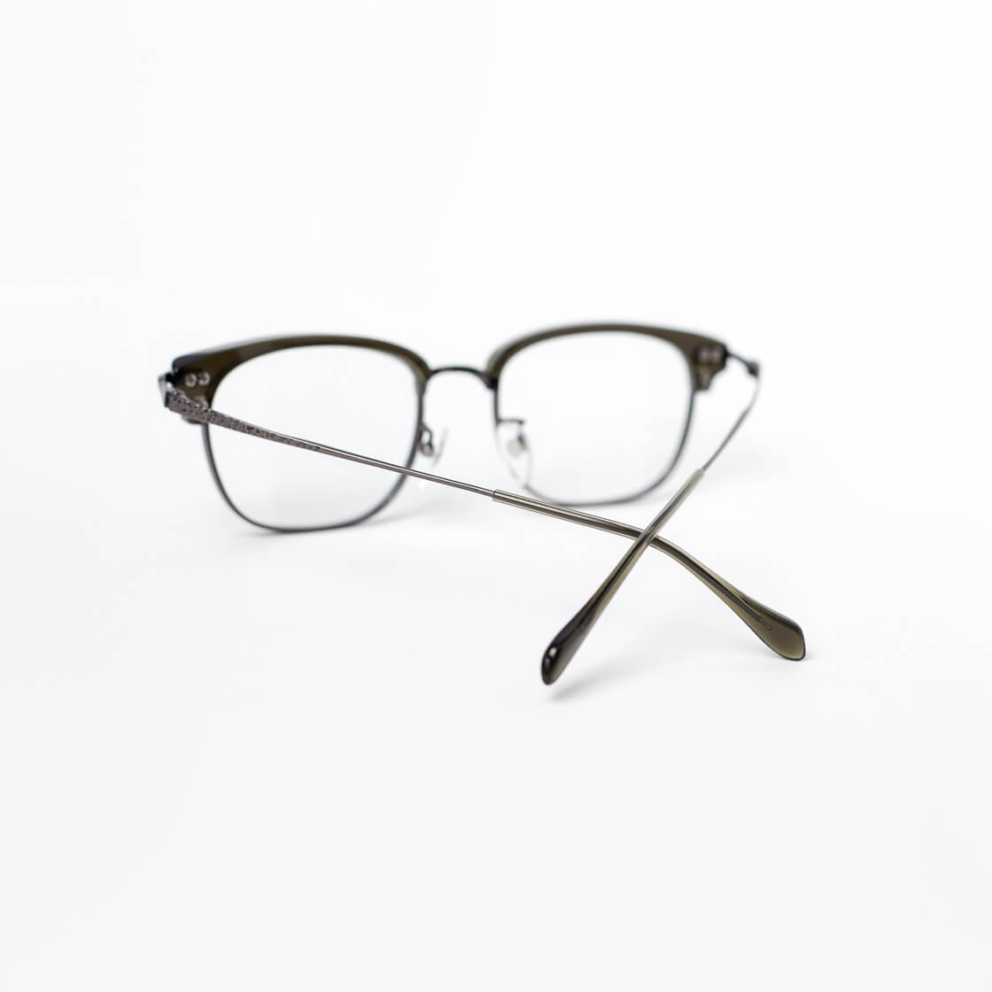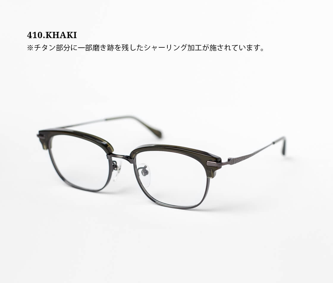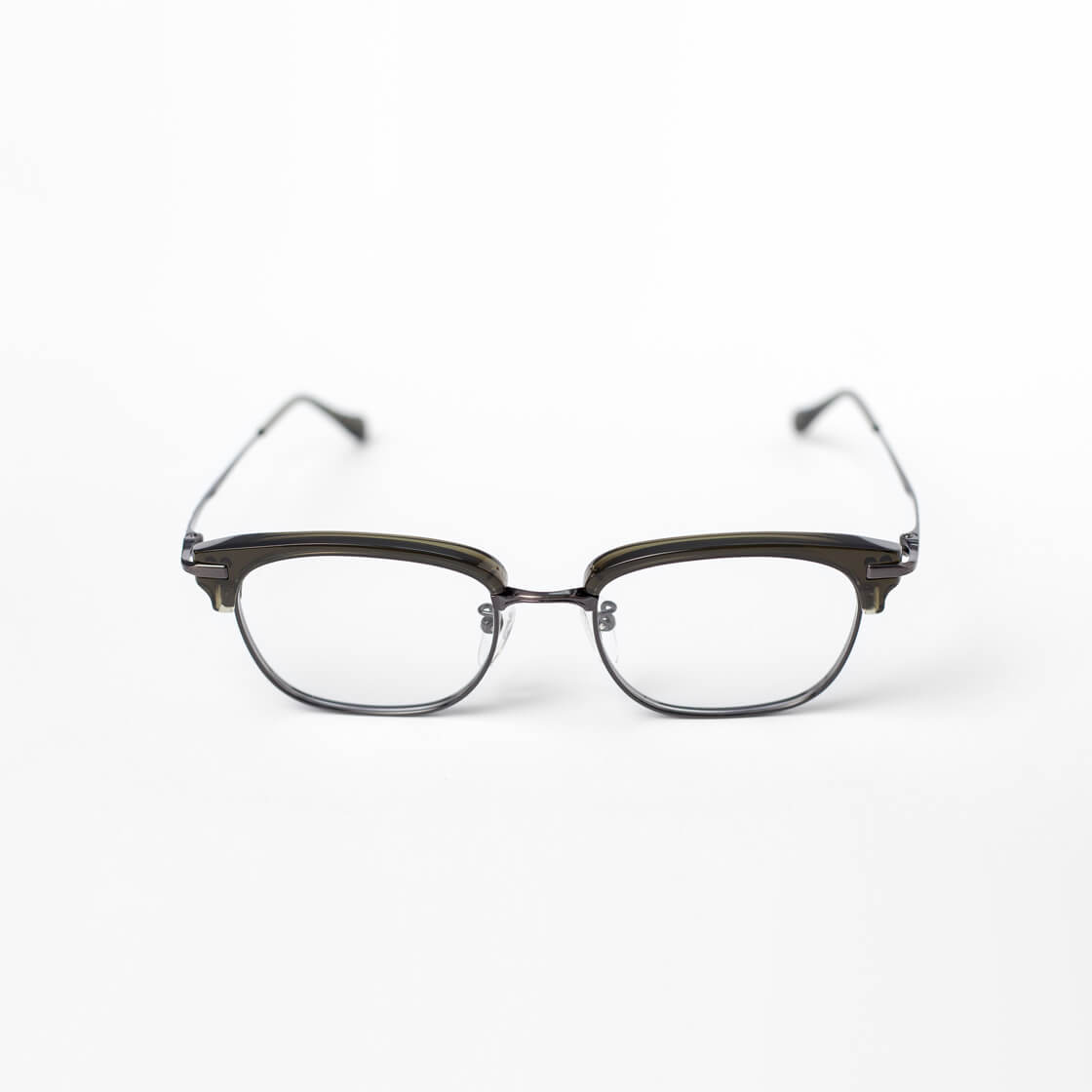 フレームはオールチタンをベースに、ブロウ部分のみアセテートを組み合わせたコンビネーション仕様。異素材ならではの質感のコントラストが、知的で落ち着いた印象を演出します。レンズ周りのチタンに厚みを持たせることで、レンズの厚みが目立ちにくい設計。細身のモデルが多いチタンフレームですが、こちらは強度数の方にもおすすめの一本です。