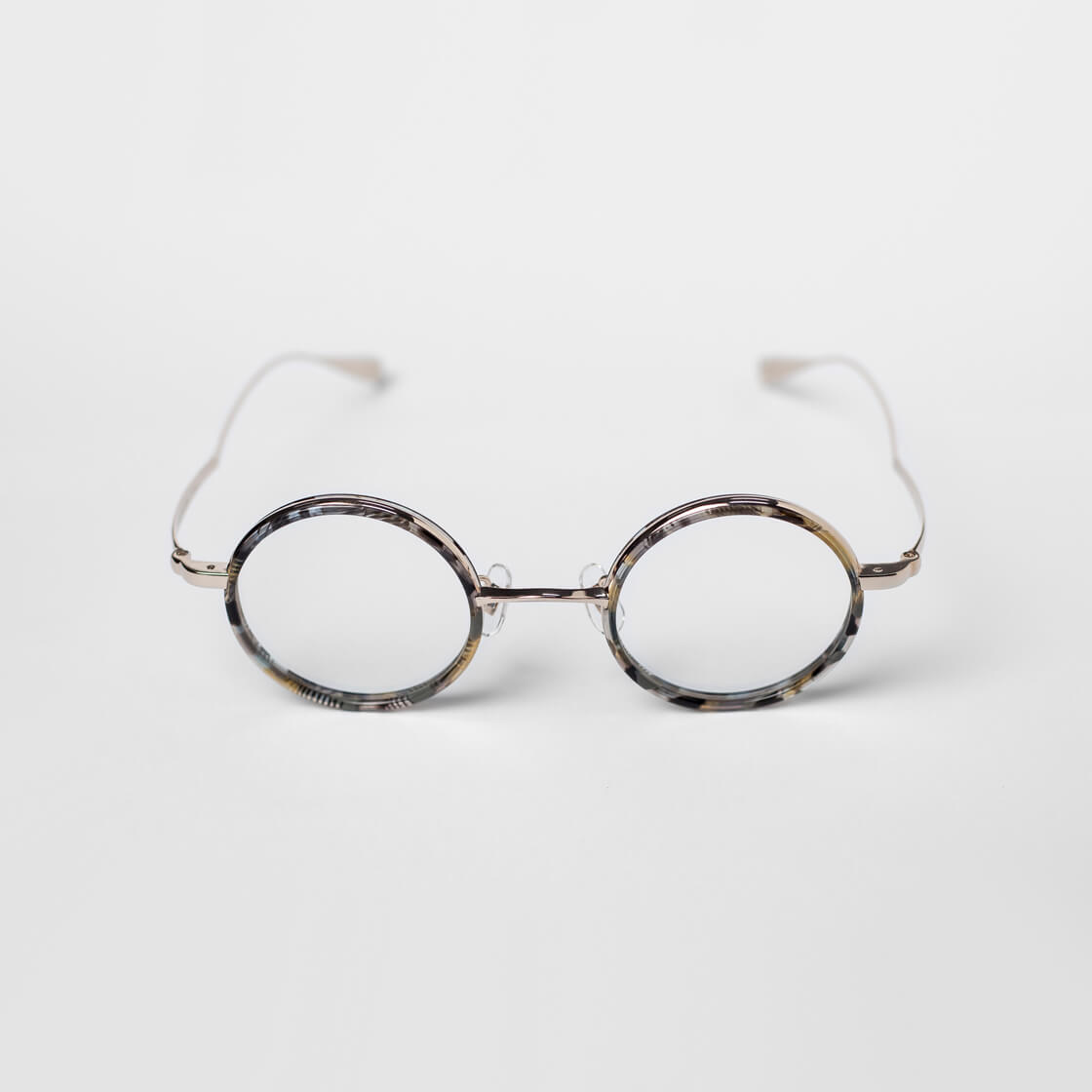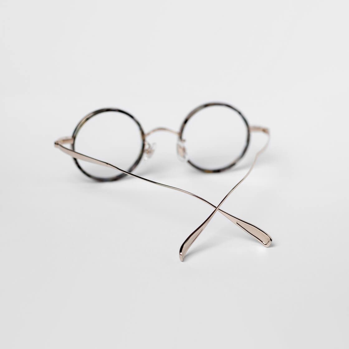 軽やかなチタンに、肌馴染みの良いべっ甲柄を加えたラウンドフレーム。