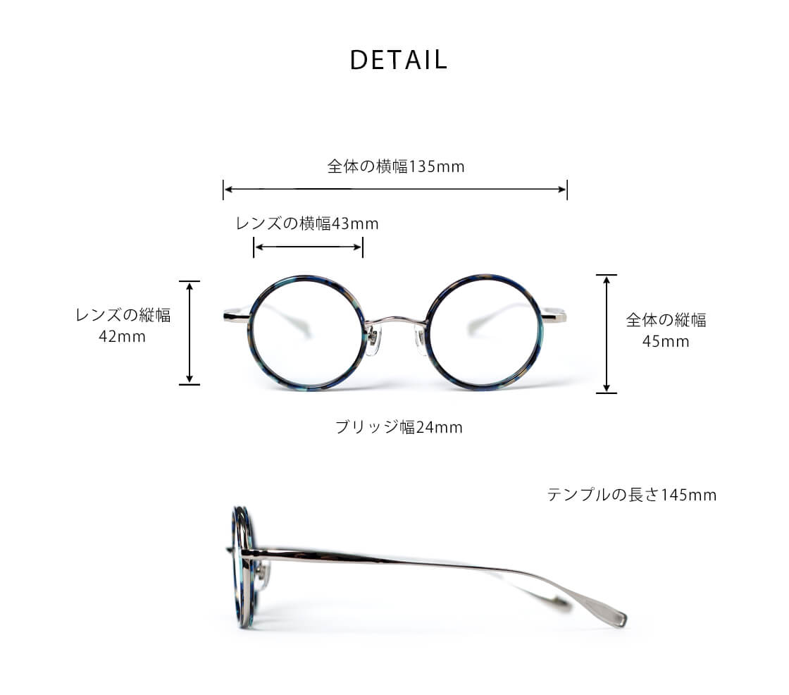 FREE / レンズ横幅43mm / レンズ縦幅42mm / 全体の横幅(フレーム込み)135mm / 全体の縦幅45mm / ブリッジ幅24mm / テンプル長さ145mm