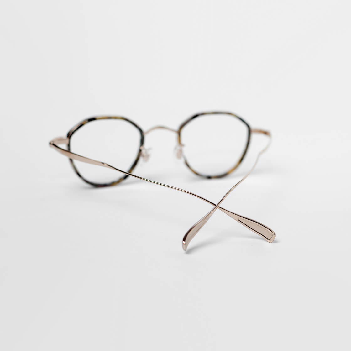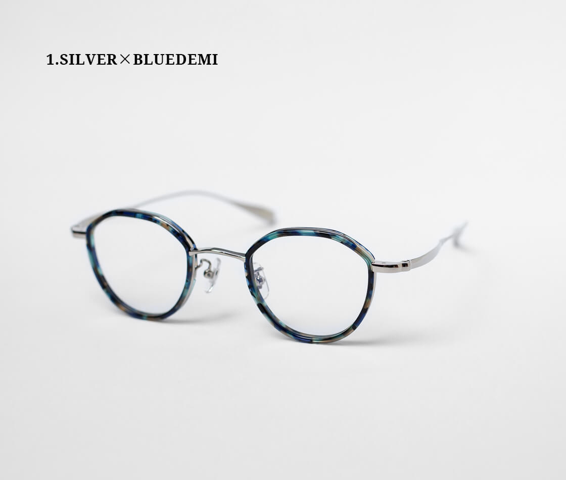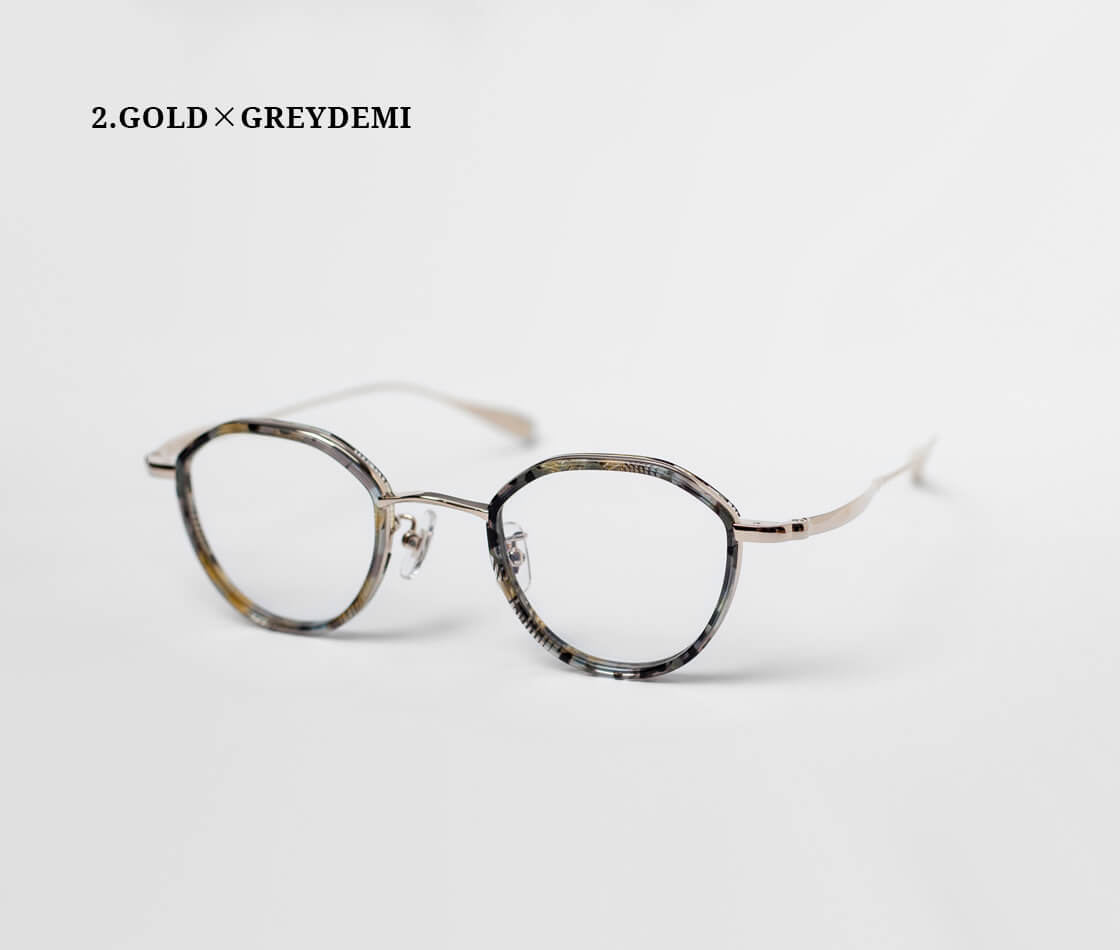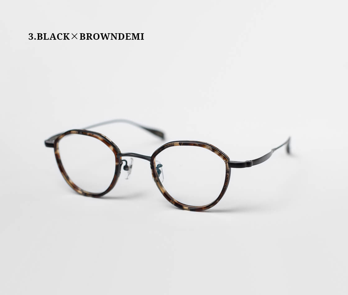 フレーム全体には、軽量かつ高い強度を誇るチタン素材を採用し、レンズ周りを、肌馴染みの良いべっ甲柄のアセテートで縁取ったコンビネーションフレームです。クラウンパント特有の、上部に角を持たせたシェイプが、クラシックでありながら洗練された印象も演出。