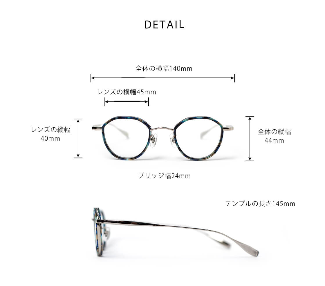 FREE / レンズ横幅45mm / レンズ縦幅40mm / 全体の横幅(フレーム込み)140mm / 全体の縦幅44mm / ブリッジ幅24mm / テンプル長さ145mm
