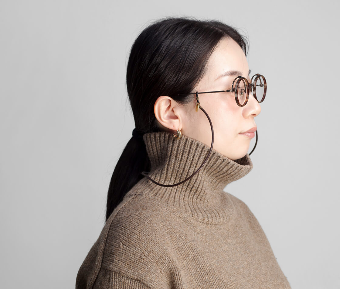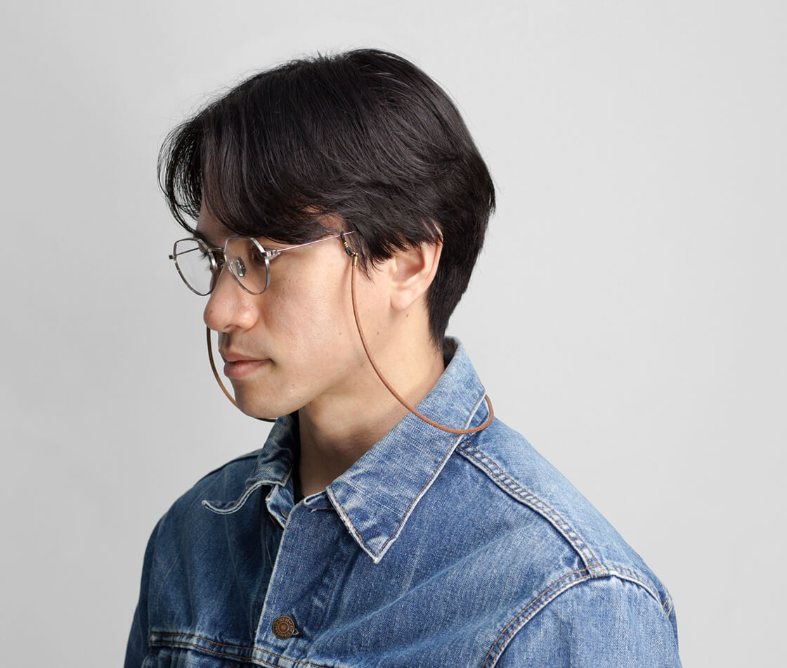 装着方法は端部のゴム輪をメガネのテンプルに通し、金具で固定するだけと簡単。工具不要で、普段使いのメガネやサングラスにも気軽に取り付けていただけます。メガネを外した際は首に掛けておけるため、日常の動作を妨げない実用性もポイント。