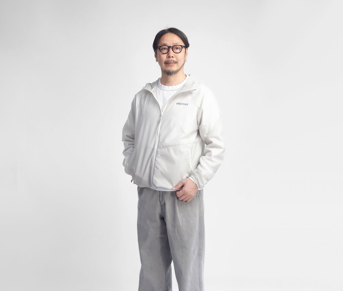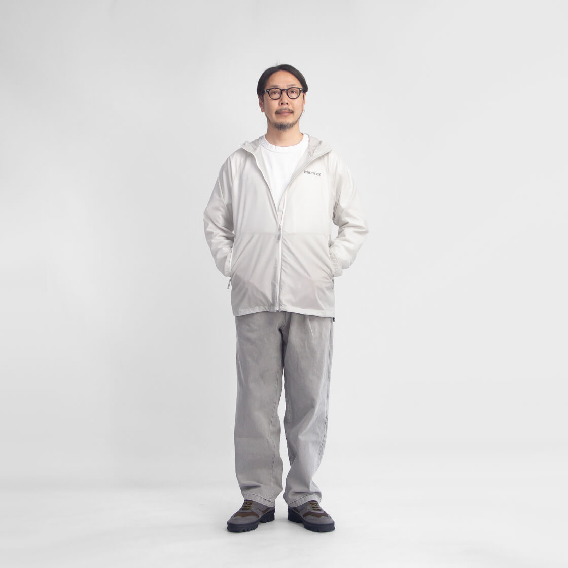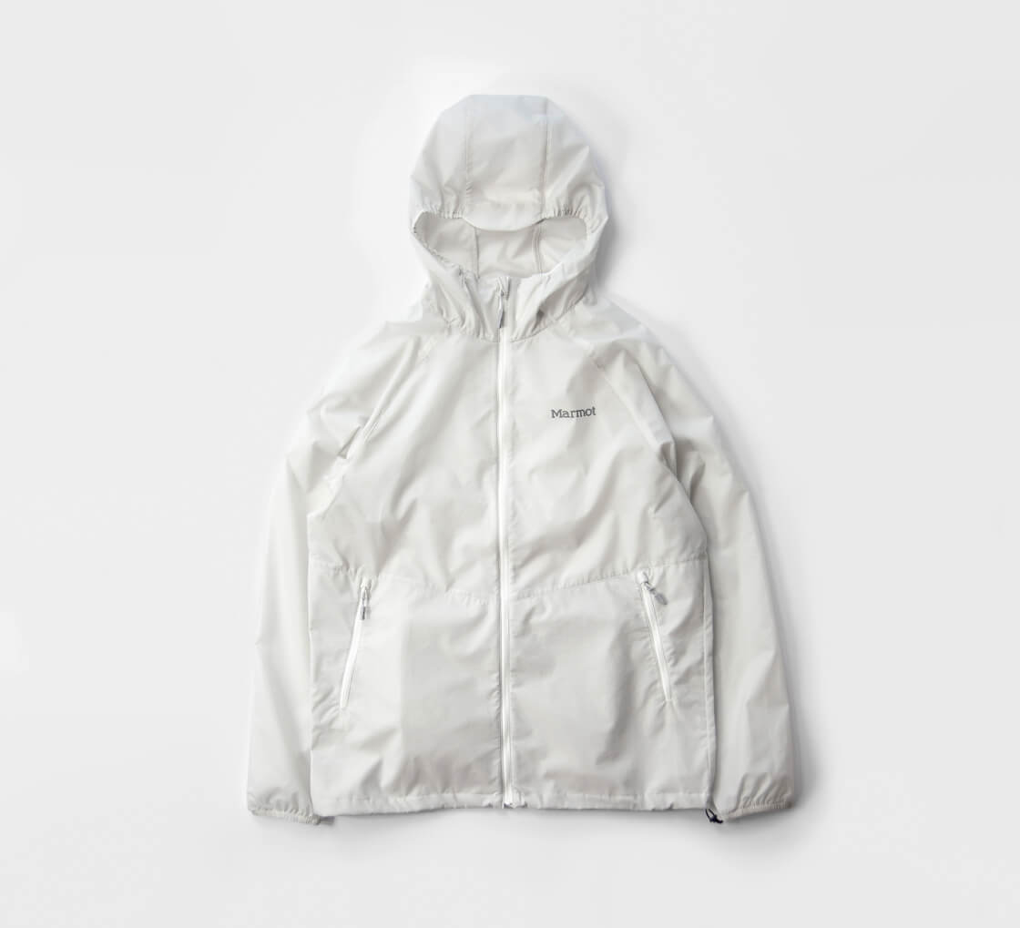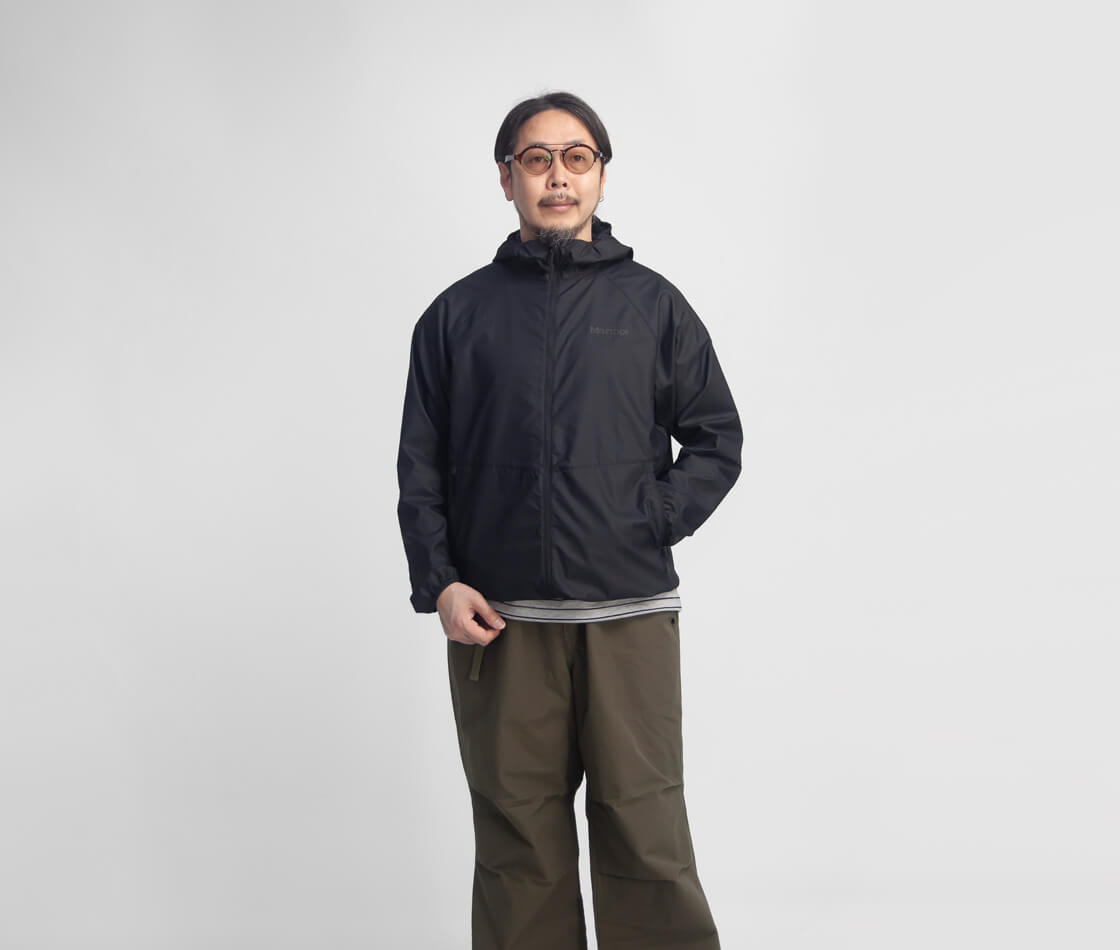 東レ開発の極細糸素材「Airtastic」を採用したMarmotのウインドジャケット「Super Light Remote Jacket(スーパーライトリモートジャケット)」。スーパーライトの名に相応しい風防・撥水性を持った透け感のある極薄生地で、着ているのを忘れるほどの軽やかさがなんといっても魅力の一着です。フードはゴムが内蔵されていて、被ればフィット感のある仕様。袖口も同様にゴム内蔵で風の侵入を防ぎます。腰位置のポケットにはファスナーを備え、大切な持ち物を安心して収納。さらに裾のドローコードを絞れば、シルエットは丸みを帯び、スタイリングに応じて表情を変えます。そして特筆すべきは、その携帯性。手の平に収まるほどコンパクトに畳めて、付属のスタッフサックで携行しておけば、肌寒さや急な天気の変化にも重宝します。