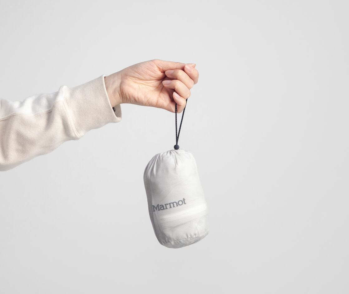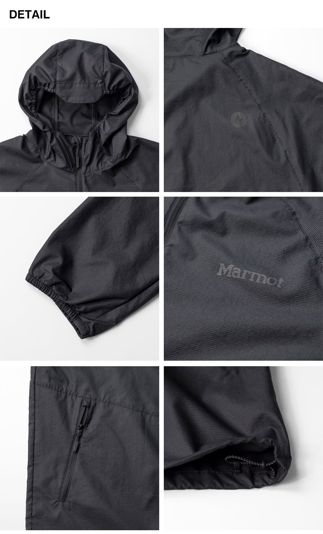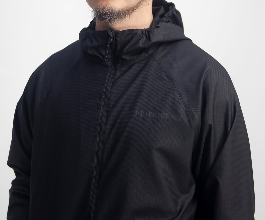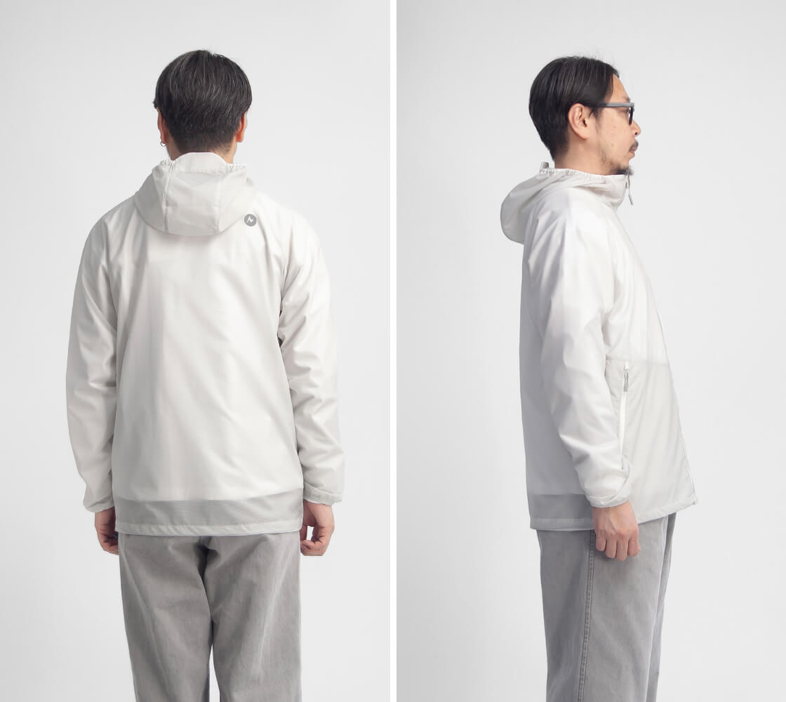 東レ開発の極細糸素材「Airtastic」を採用したMarmotのウインドジャケット「Super Light Remote Jacket(スーパーライトリモートジャケット)」。スーパーライトの名に相応しい風防・撥水性を持った透け感のある極薄生地で、着ているのを忘れるほどの軽やかさがなんといっても魅力の一着です。フードはゴムが内蔵されていて、被ればフィット感のある仕様。袖口も同様にゴム内蔵で風の侵入を防ぎます。腰位置のポケットにはファスナーを備え、大切な持ち物を安心して収納。さらに裾のドローコードを絞れば、シルエットは丸みを帯び、スタイリングに応じて表情を変えます。そして特筆すべきは、その携帯性。手の平に収まるほどコンパクトに畳めて、付属のスタッフサックで携行しておけば、肌寒さや急な天気の変化にも重宝します。