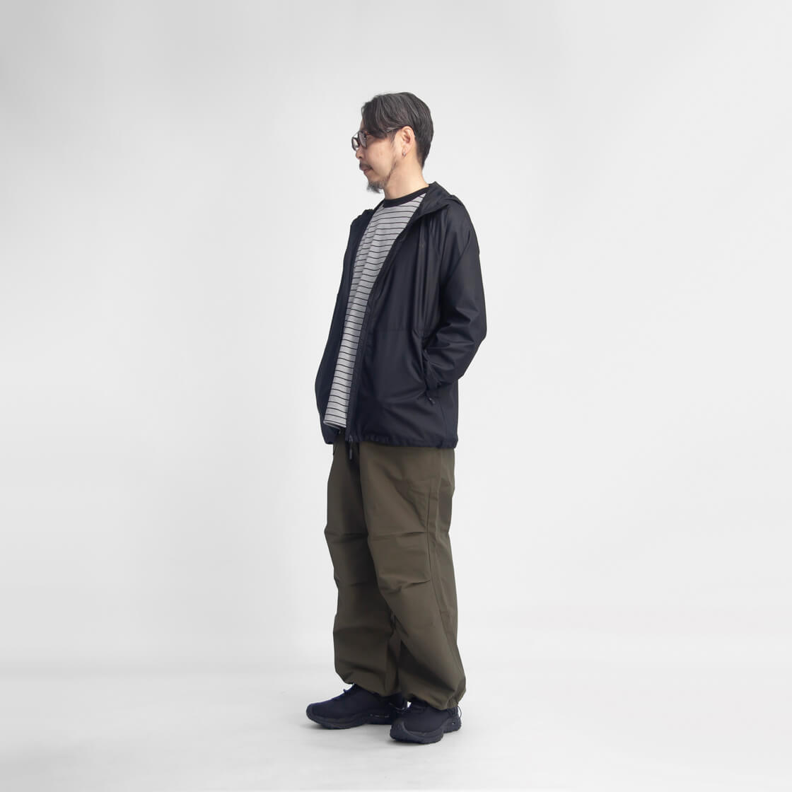 Lサイズを着用しました。身幅はややゆったりとしていてリラックスして着用出来ます。袖はやや長めですが、ゴム内蔵で手首で止まるので問題なしです。裾は絞りも効かせられるので、Lサイズになっても大きすぎる感じにはなりません。Mサイズだと全体的にフィット感のある着心地になるので、個人的にはゆとりのあるLサイズが好みですね。