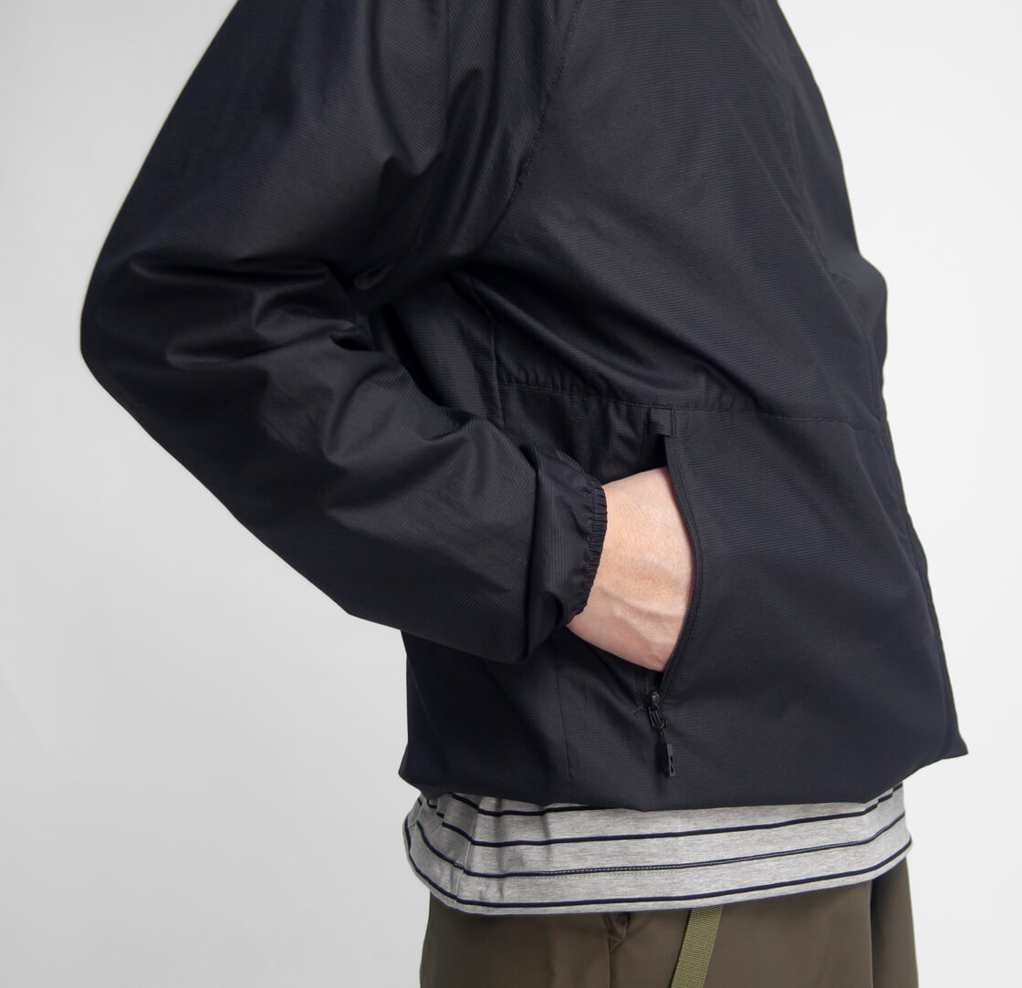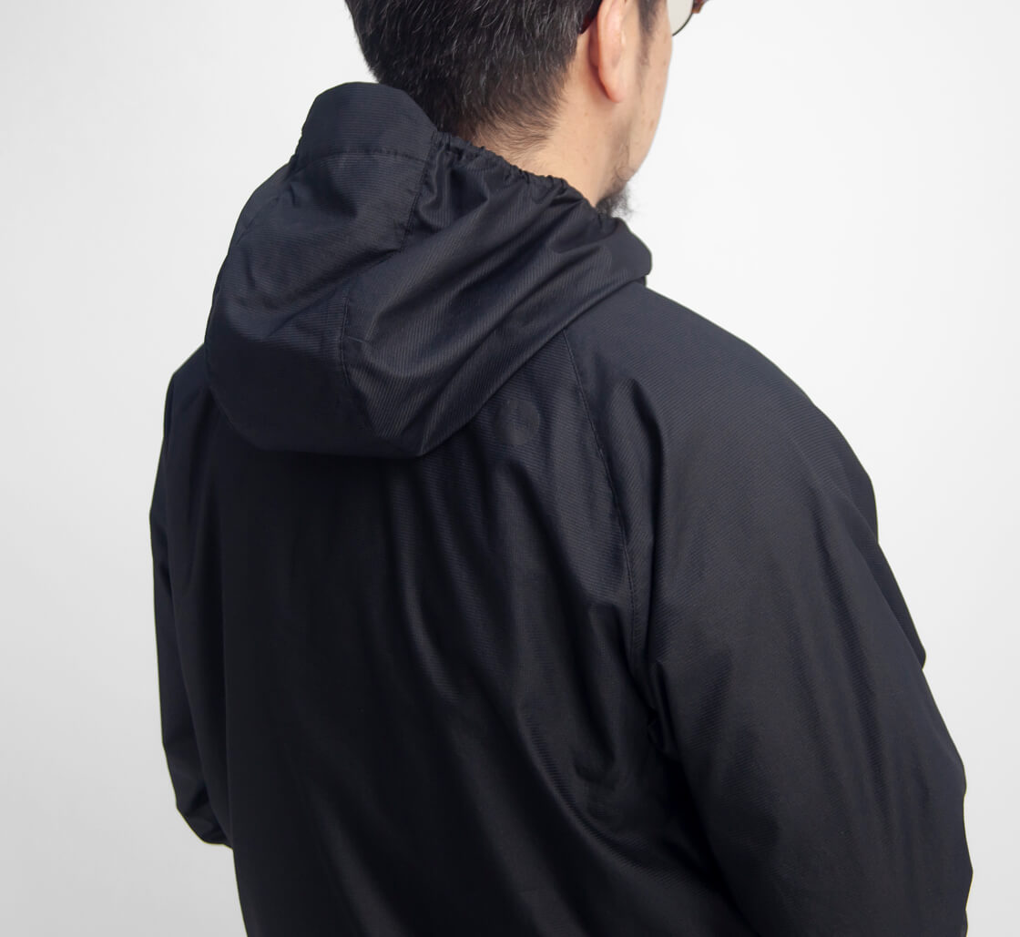 極薄でありながら風を軽やかにいなし、小雨程度ならへっちゃらな撥水性、汗をかいてもベタつきにくい性質を持ったナイロン生地。