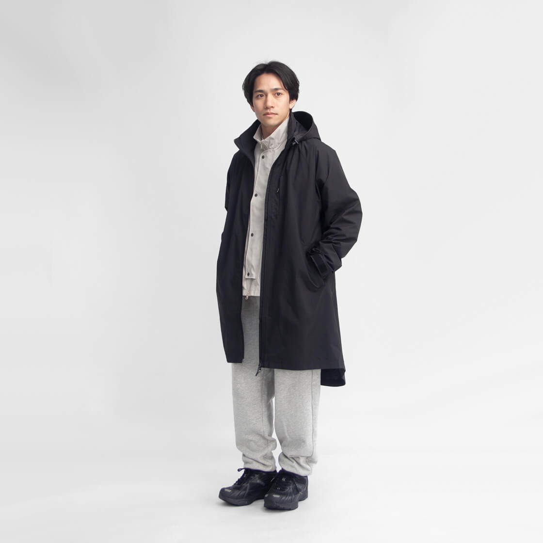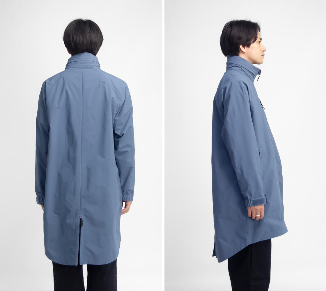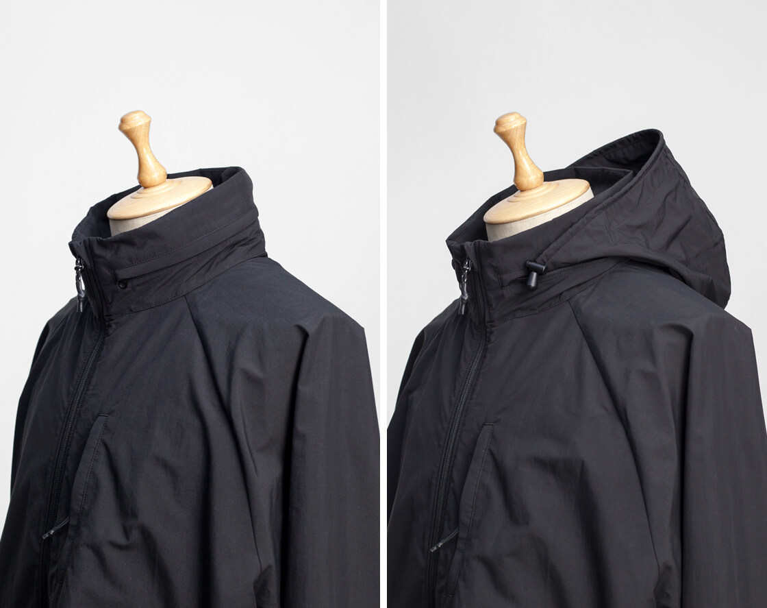 スタンドカラーにフードが収納されていて、雨天時等のシーンや好みで出し入れ可能。
