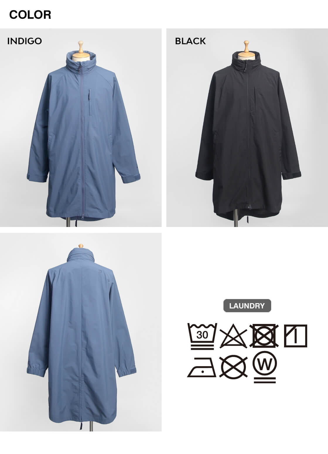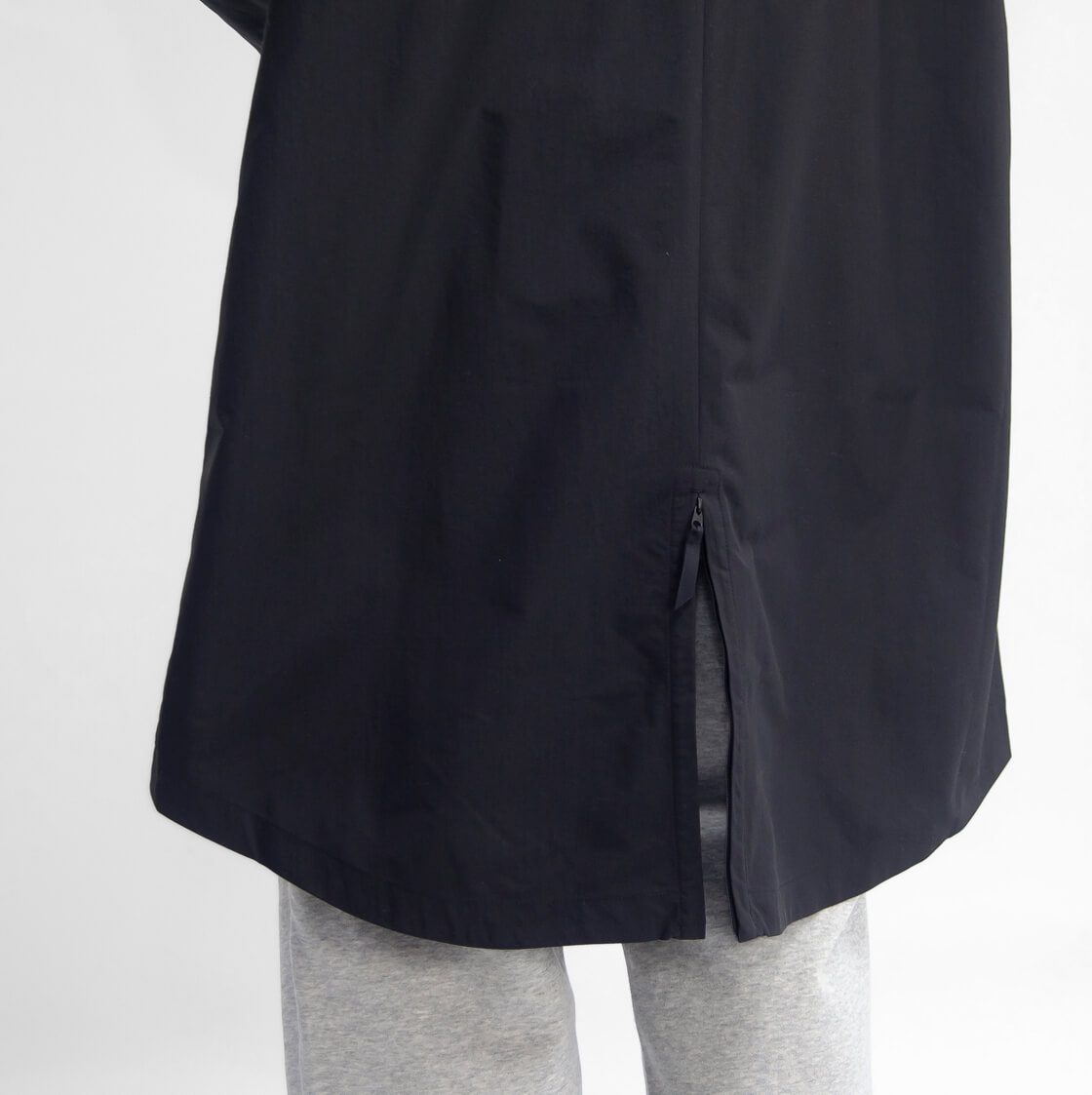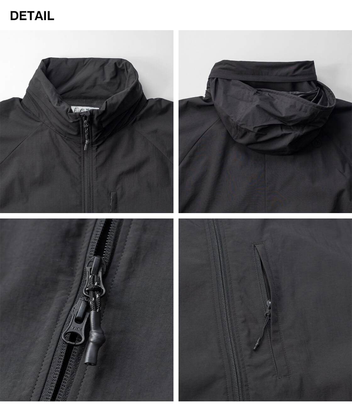 スタンドカラーにフードが収納されていて、雨天時等のシーンや好みで出し入れ可能。
