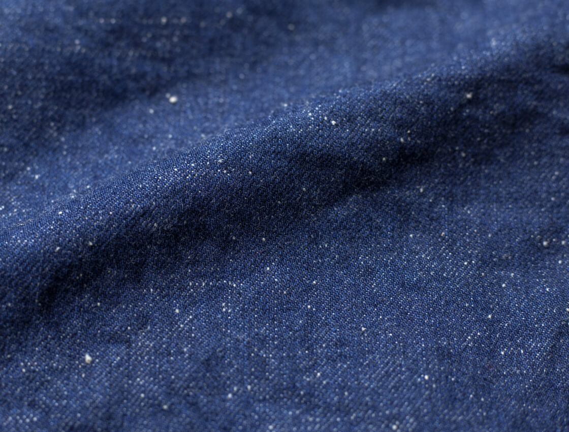 本体に用いているのは、FOBがオリジナルで製作した、落ち綿を用いた10.5オンスピュアインディゴ染めデニム生地。自然なムラ感やネップは旧き良き時代のデニムを彷彿させる表情。淡いインディゴブルーに何度も染めることで、深みのある淡いインディゴブルーを実現し、緯糸にグレー糸を差し込むことで、自然な経年変化を楽しめるデニム生地に仕立てています。