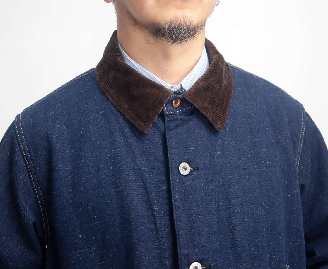太畝コーデュロイ襟、裏地にウールブランケットライナーを配した、クラシックな防寒チョアジャケット(カバーオール)。
