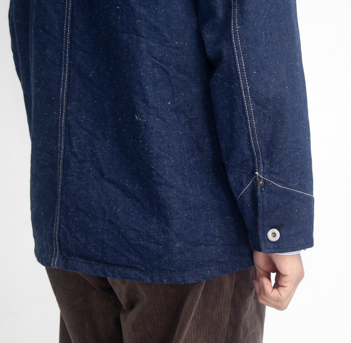 1940年代の大戦時代のチョアジャケットをベースに製作されたFOBのデニムカバーオール「DENIM CHORE JKT BLANKET LINER」。ボーダー柄のウールブランケットライナー、太畝で存在感のあるコーデュロイ襟、ワークタイプのリベットや月桂樹ボタンなどクラシックなディティールを盛り込んだ防寒カバーオールです。懐中時計を入れるための小振りなウォッチポケットは、本来の目的通りに使うことはないかと思いますが、デザインとして確かな存在感を放っています。袖口の裏地にもコーデュロイを配することで、肌触りの良さと温もりをしっかりと感じられます。シルエットは身幅はゆったりとしていながら、決して大きすぎるサイズ感ではないボックス型のシルエット。ジャケットとしてはややショート目な着丈もバランス良し。