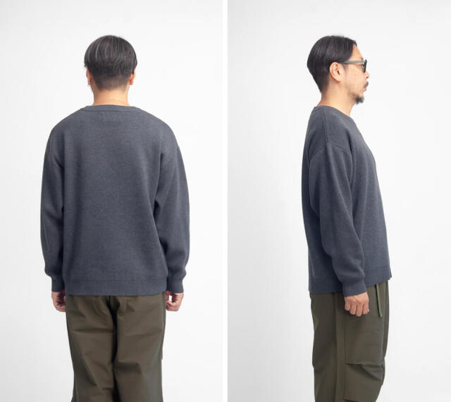 Mサイズを着用しました。ルーズでゆったりとしたサイズ感です。身幅は広めで、肩もしっかり落ちるサイズ感なので、比較的体型を選ばずに着用頂けるかと思います。袖口はリブ編みで絞られているので少々長くても問題ないと思います。着丈はヒップが7.8割ほど隠れるぐらいの長さで、気持ち長め。個人的にはMサイズで良い感じです。