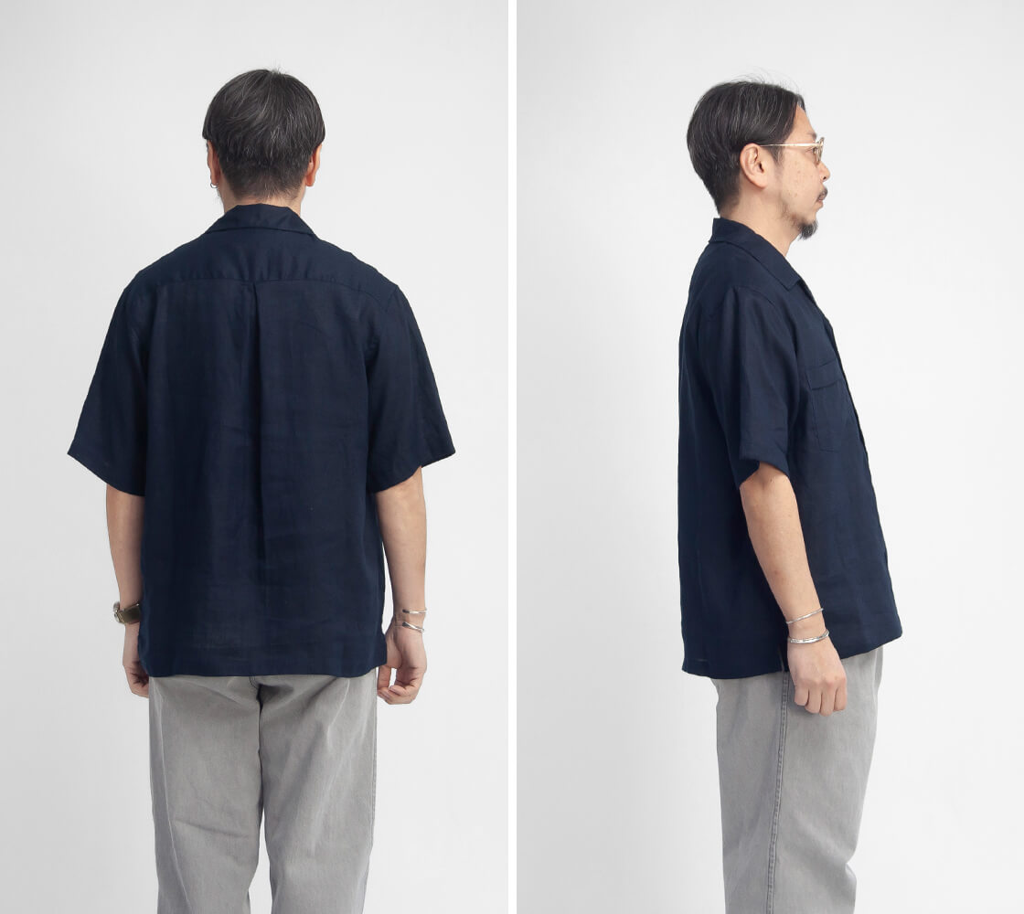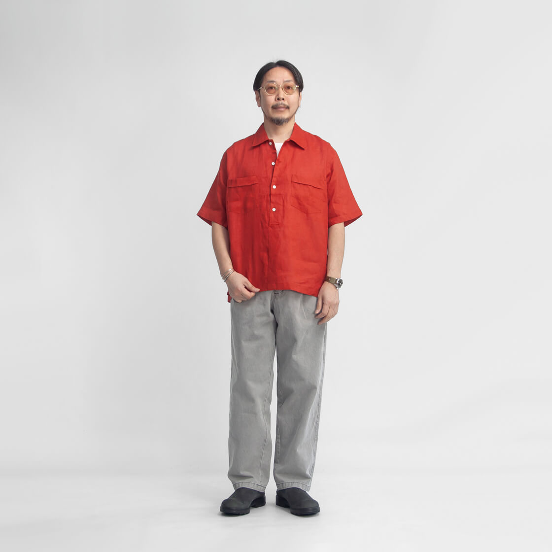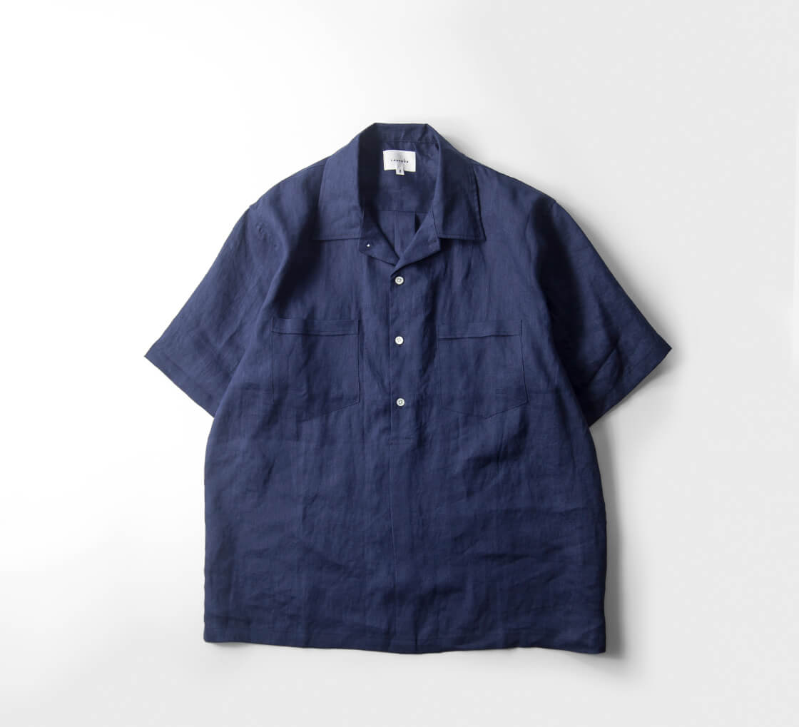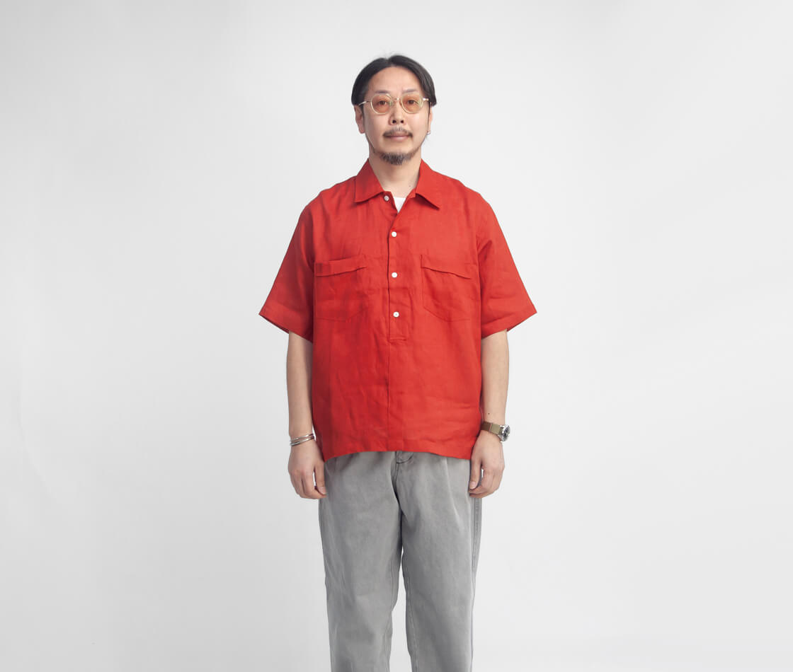 フレンチリネン(麻)を100%使用した、風合いの良さが自慢の半袖オープンカラープルオーバーシャツ。昨年よりコンパクトに、サイズ感を見直しました。