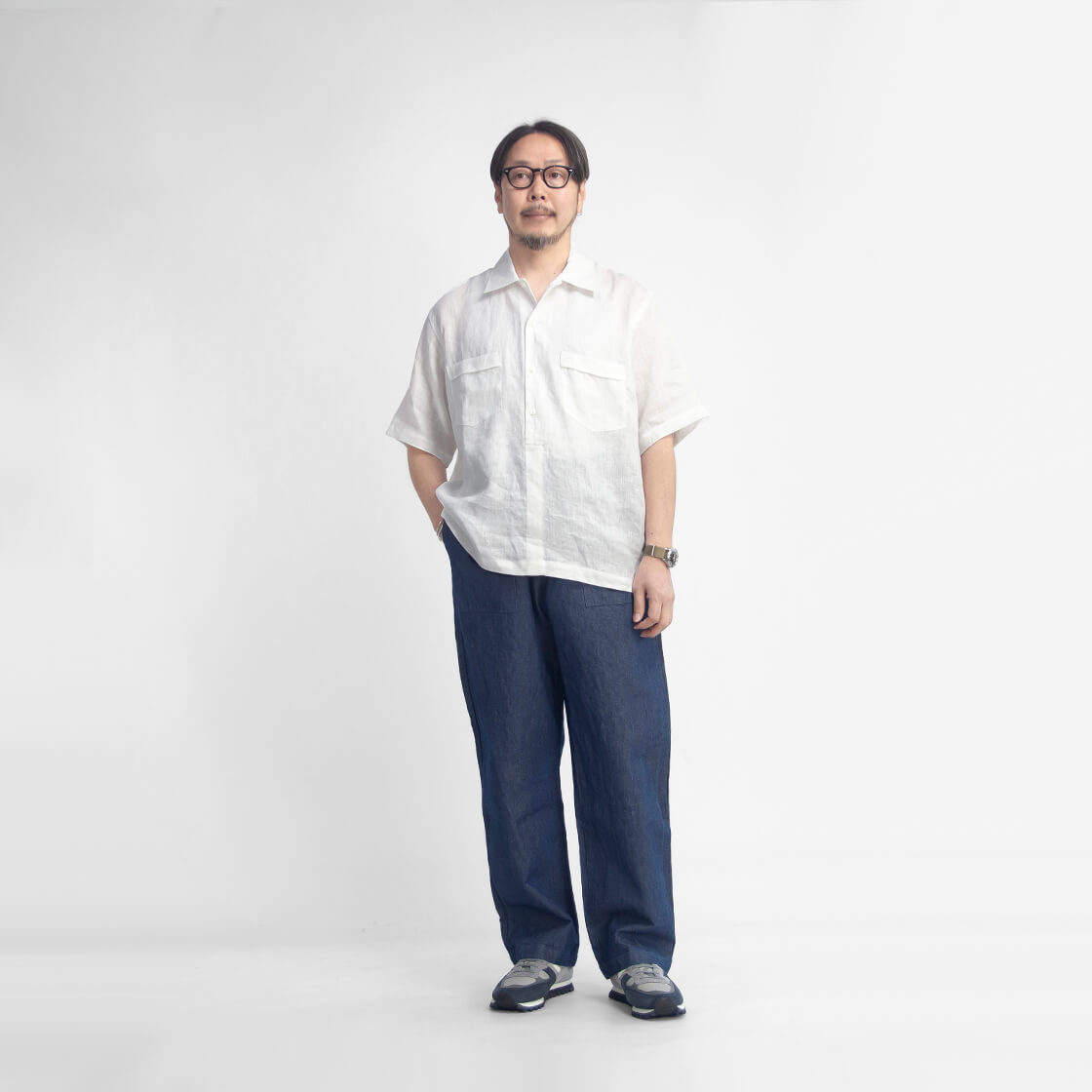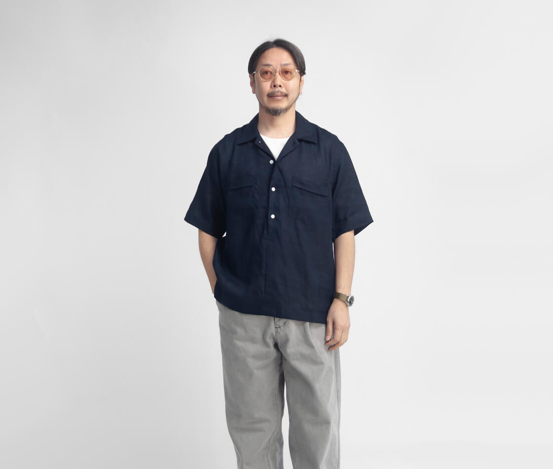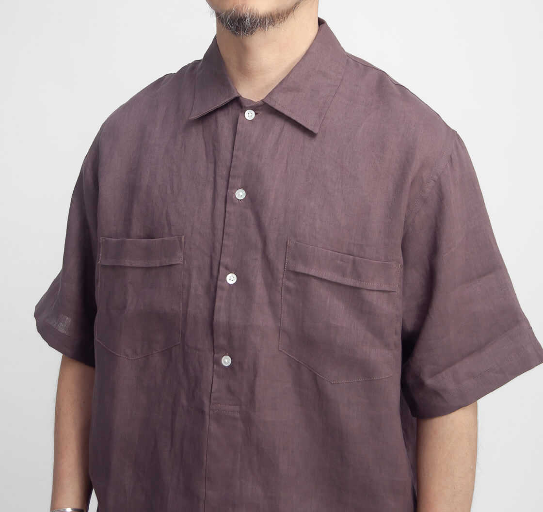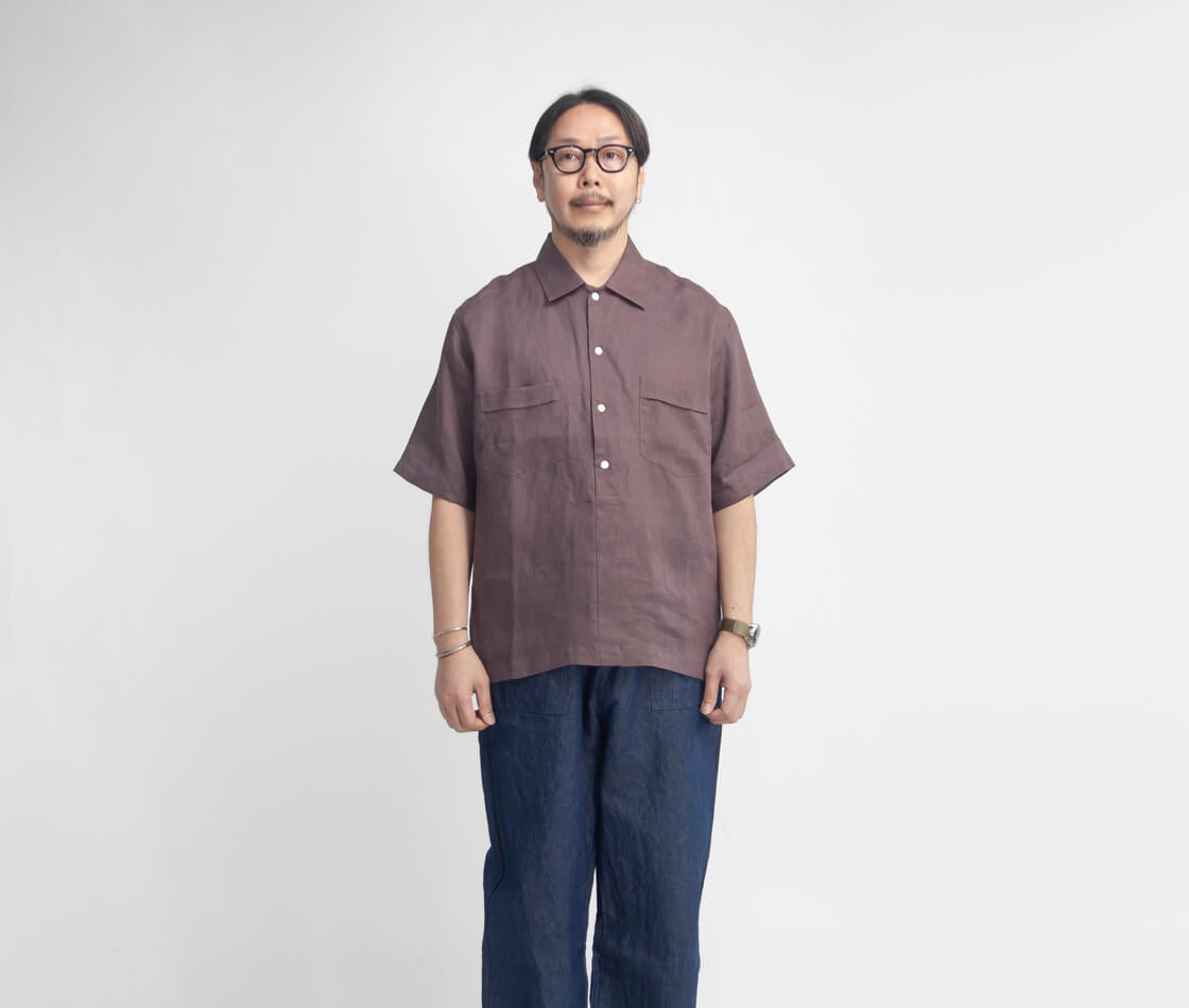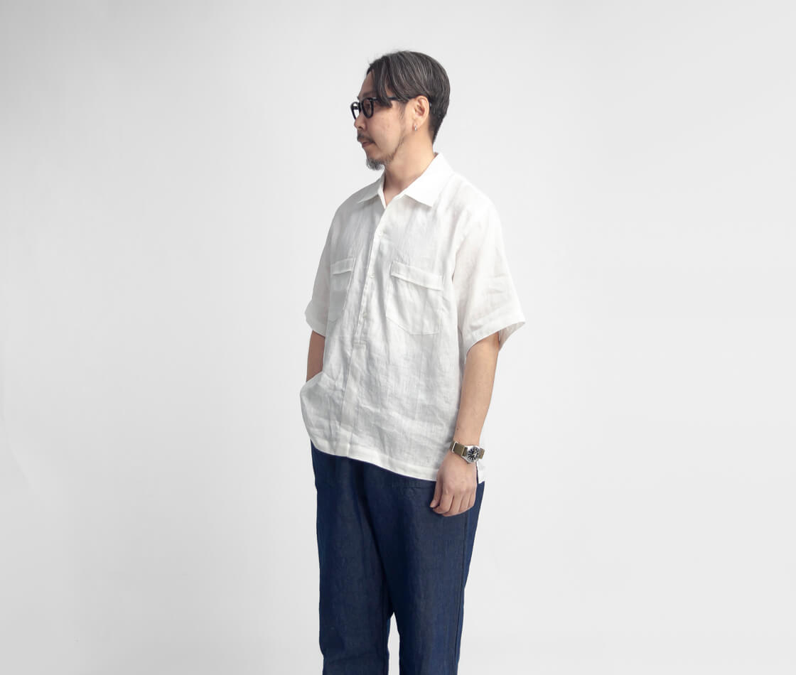 当店の毎年定番人気のリネンプルオーバーシャツに2025年より新たに加わった半袖オープンカラータイプ。身幅をたっぷりとって、裾をストレートにカットしたゆったりサイズ感のボックスシルエット。裾には浅めのスリット、両胸にポケットを設けることでワークな雰囲気に。開放的なオープンカラーは、ボタンを上まで留めてキチンと感が出せるように、ループボタンではなく通常のボタンホールタイプで製作しました。第一ボタンを外せば軽やかなオープンカラーに、留めれば端正なレギュラーカラーにと、表情を自在に変えられます。胸元の開きを見せたくない方にも着用頂きやすい仕様です。背面ヨーク下のプリーツはインボックスプリーツ。プルオーバーでも着脱が容易にできるように、前立ては深めに設定しています。ボタンに関しては光沢のある高瀬貝を使用したシェルボタン。ミニマムなデザインの7分袖ワイドカラータイプ、2026年よりモデルチェンジした、長袖のオープンカラータイプも製作していますが、それとはまた違ったラフで開放的な雰囲気を纏った半袖モデルです。