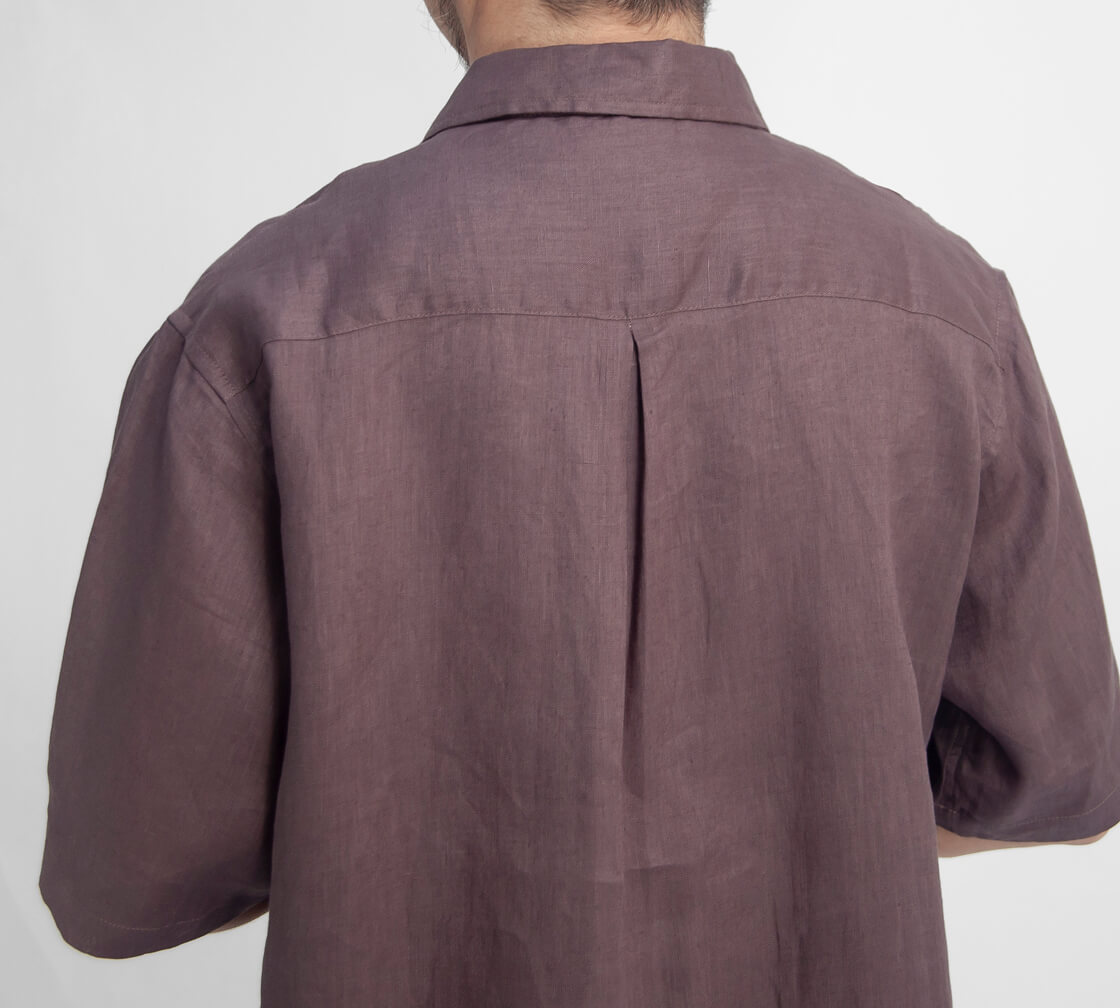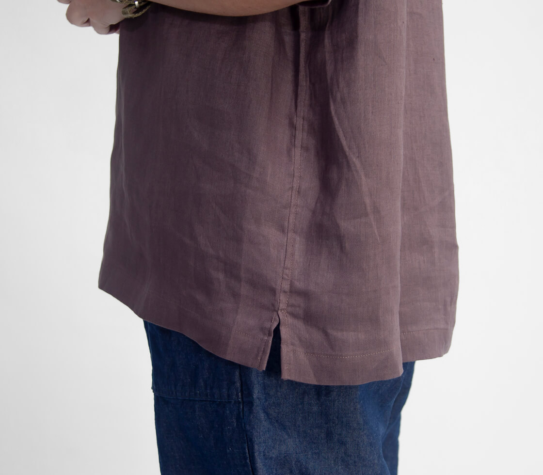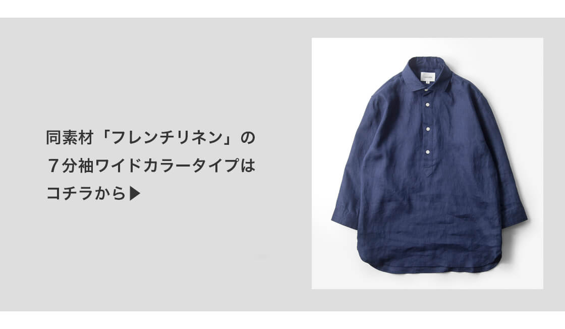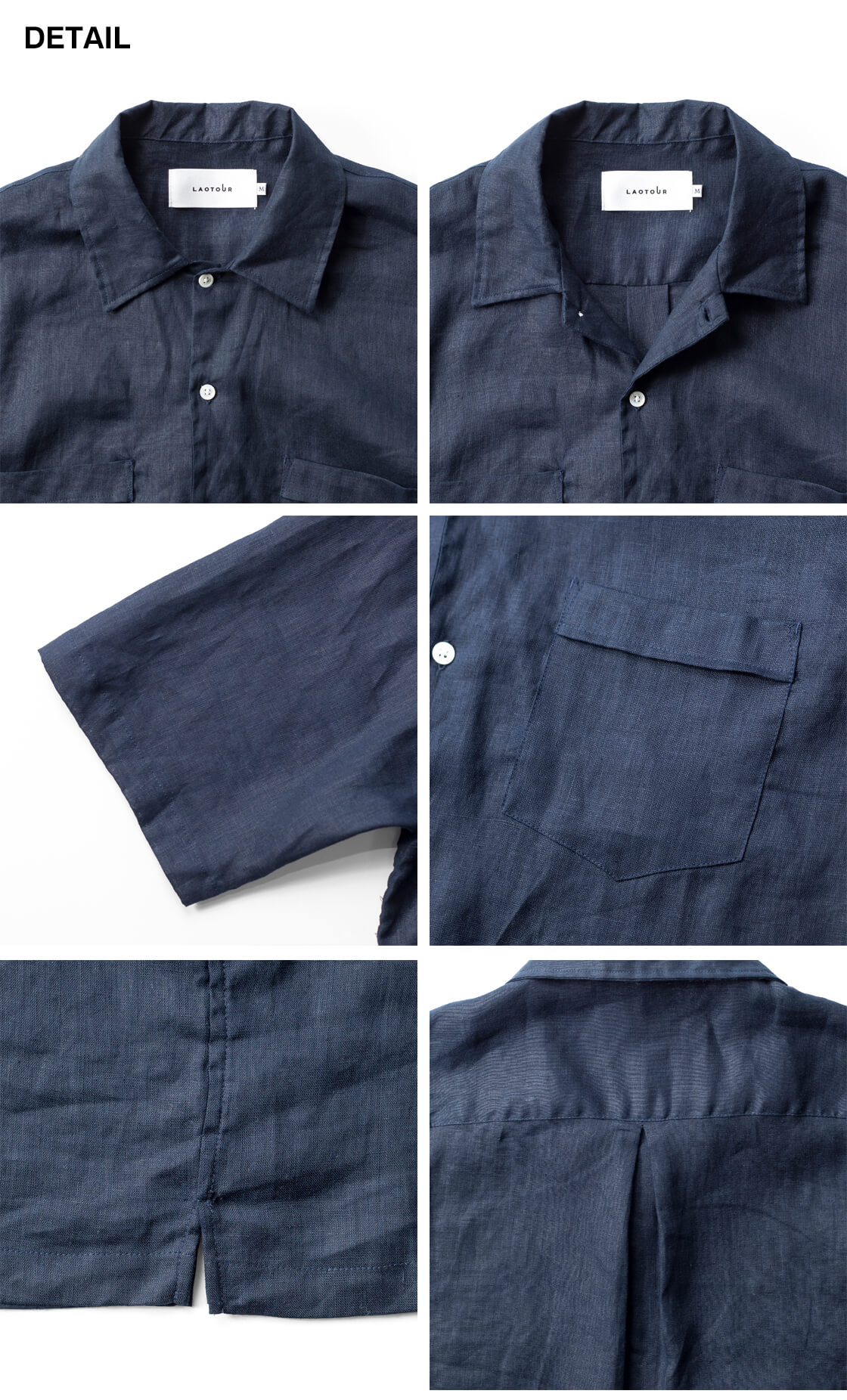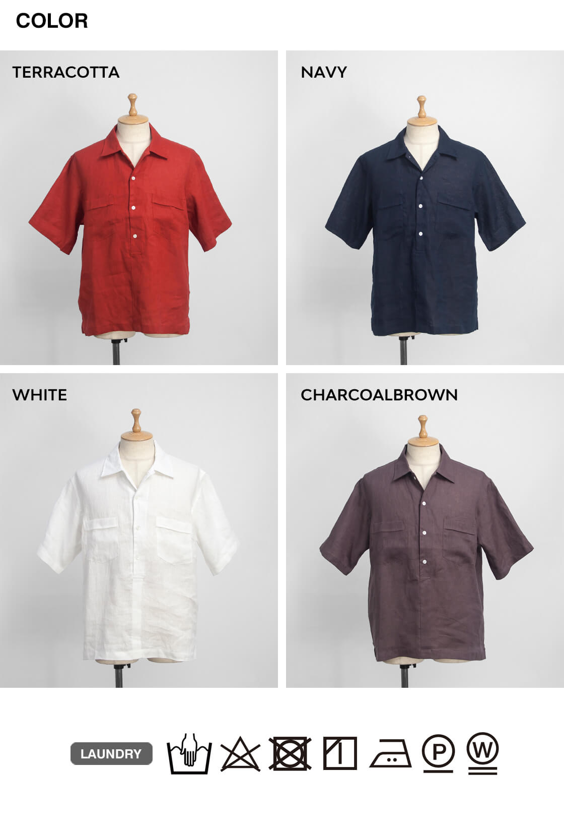 当店の毎年定番人気のリネンプルオーバーシャツに2025年より新たに加わった半袖オープンカラータイプ。身幅をたっぷりとって、裾をストレートにカットしたゆったりサイズ感のボックスシルエット。裾には浅めのスリット、両胸にポケットを設けることでワークな雰囲気に。開放的なオープンカラーは、ボタンを上まで留めてキチンと感が出せるように、ループボタンではなく通常のボタンホールタイプで製作しました。第一ボタンを外せば軽やかなオープンカラーに、留めれば端正なレギュラーカラーにと、表情を自在に変えられます。胸元の開きを見せたくない方にも着用頂きやすい仕様です。背面ヨーク下のプリーツはインボックスプリーツ。プルオーバーでも着脱が容易にできるように、前立ては深めに設定しています。ボタンに関しては光沢のある高瀬貝を使用したシェルボタン。ミニマムなデザインの7分袖ワイドカラータイプ、2026年よりモデルチェンジした、長袖のオープンカラータイプも製作していますが、それとはまた違ったラフで開放的な雰囲気を纏った半袖モデルです。