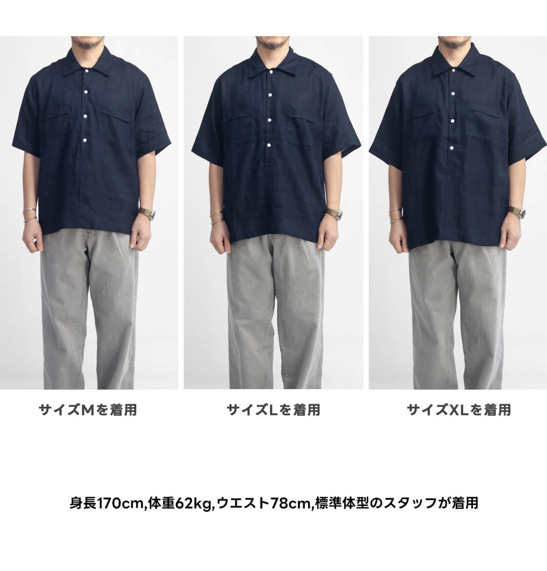 当店で昨年より新たに加わったリネンプルオーバーシャツの半袖タイプ。ご好評を頂き、シーズン終わりには完売しましたが、サイズ感がオーバーすぎるとのお声もチラホラ。そのため、いつもは製作しないSサイズも展開していたのですが、やはり普段のサイズを選ばれるので、どうしてもサイズを間違ってしまう。だから2026年モデルはサイズ感を見直し、昨年よりもワンサイズほど小さめの設定にしています。なので昨年Mサイズを買われて丁度よかった方は、今年はLサイズがほぼ同じサイズ感になっています。とはいえ元々ゆったりとさせたサイジングなので、やや大きめのシルエットではあります。デザイン自体は昨年と変わりありません。
