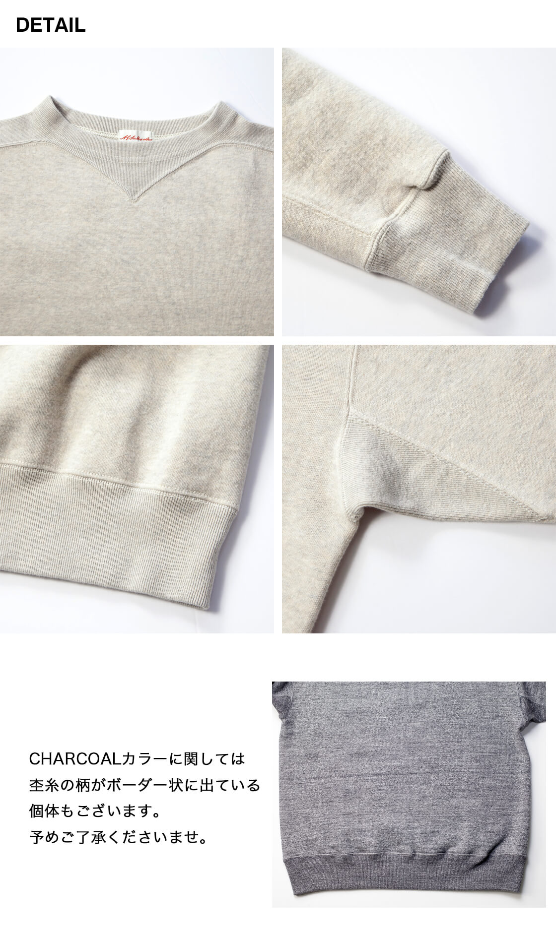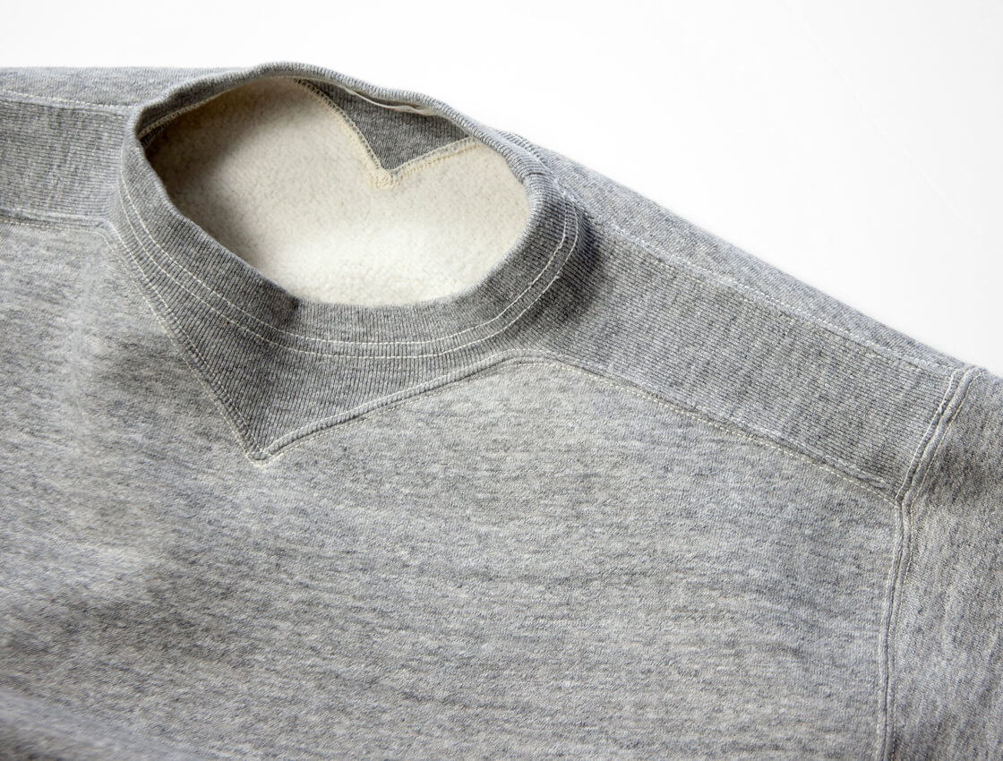 ヴィンテージの意匠である、首から肩にかけてのリブ編みフライス。運動性を高めるための機能的なディテールです。