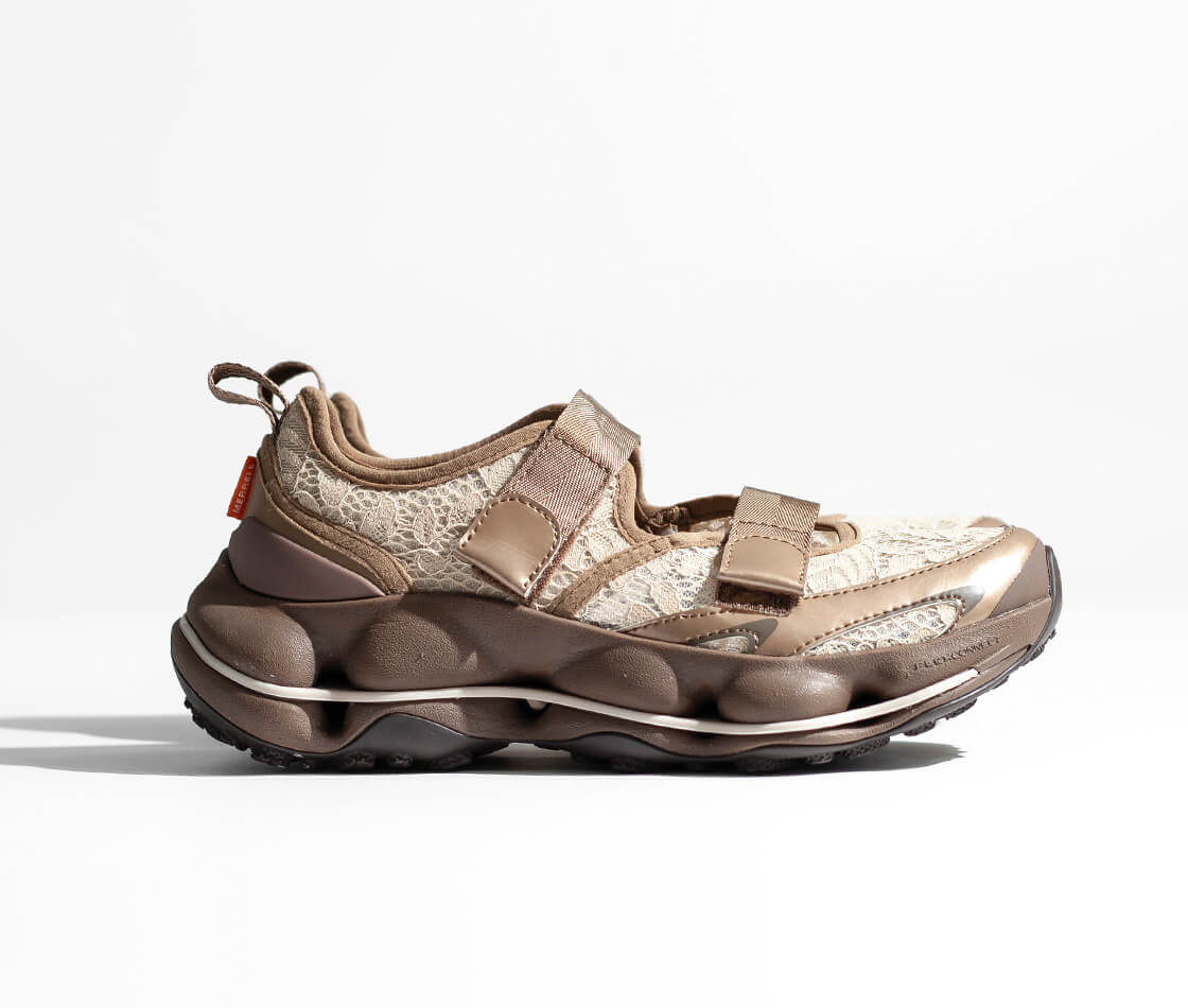 レース調のデザインも印象的ですが、真価は履き心地にあります。マシュマロのような柔らかな見た目のミッドソールは、見た目ほど沈み込まず、しっかりとした弾性で足を支えます。一歩踏み出すたびに感じる安定感と反発力は、思わず他のスニーカーに戻れなくなるほど。長時間のハイキングでも疲れにくく、最後まで軽やかな足取りをキープしてくれる一足です。