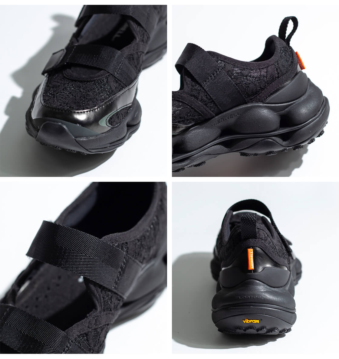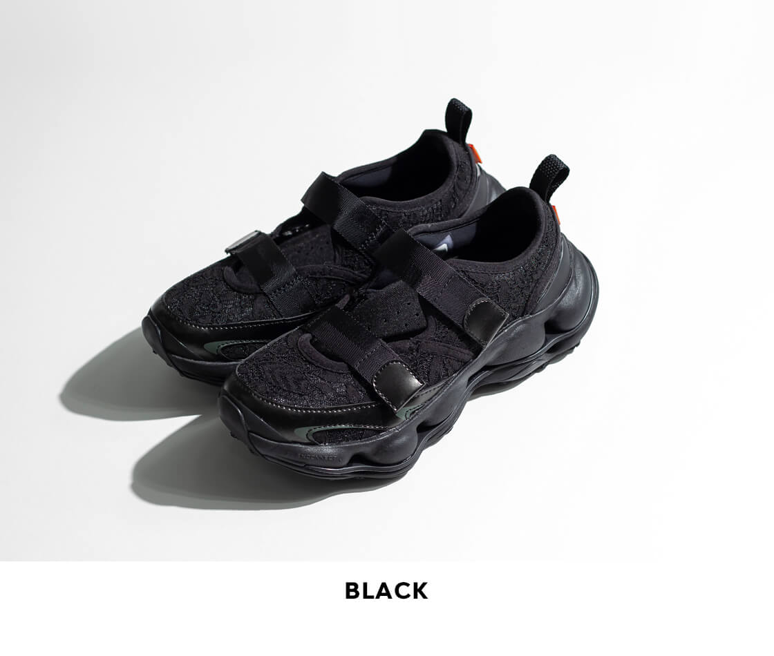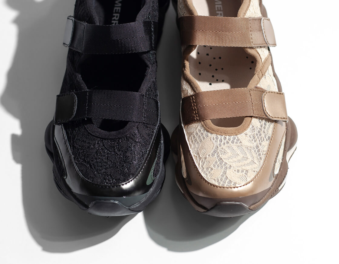 甲にストラップが2本あるメリージェーンスタイルのアッパーは、通気性に優れ、フェミニンな印象を与えるレース調のテキスタイル。このアッパーによる高い通気性は、蒸れを軽減してくれ、濡れても乾きが早い。履き口周りはパッド入りで優しい足入れ感を実現した構造。通気性の高いメッシュライニングと、フットベッドカバーは100%リサイクル素材を使用していて、独特のデザインだけではなく、エコフレンドリーな素材使いも環境問題に取り組むMERRELLらしい仕様です。踵部にはTPU補強ヒールカウンターを配置して安定性を高め、防臭加工を施した通気性の高い取り外し可能なインソールは、EVAフォームの低反発なクッショニングで足をサポートします。