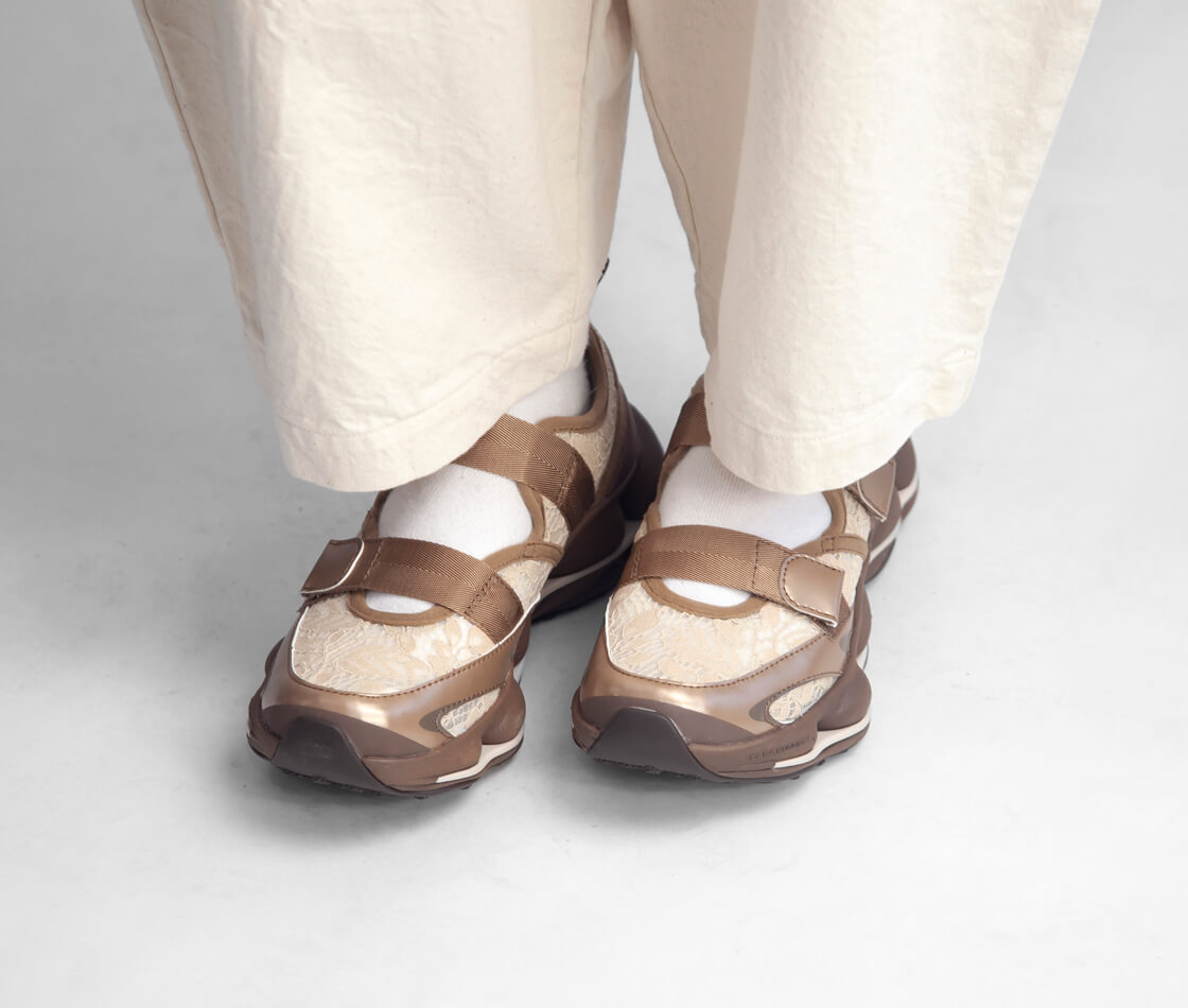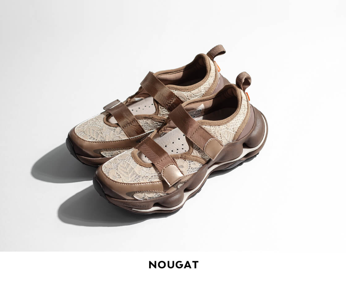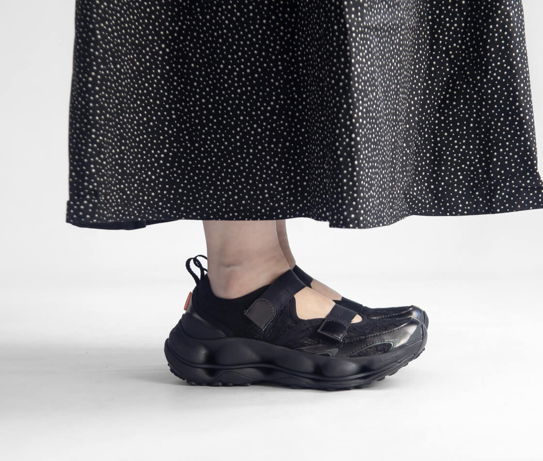 優れた通気性でフェミニンなレース調のテキスタイル、2本のベルトで直感的に調整できるメリージェーンスタイルのアッパー。