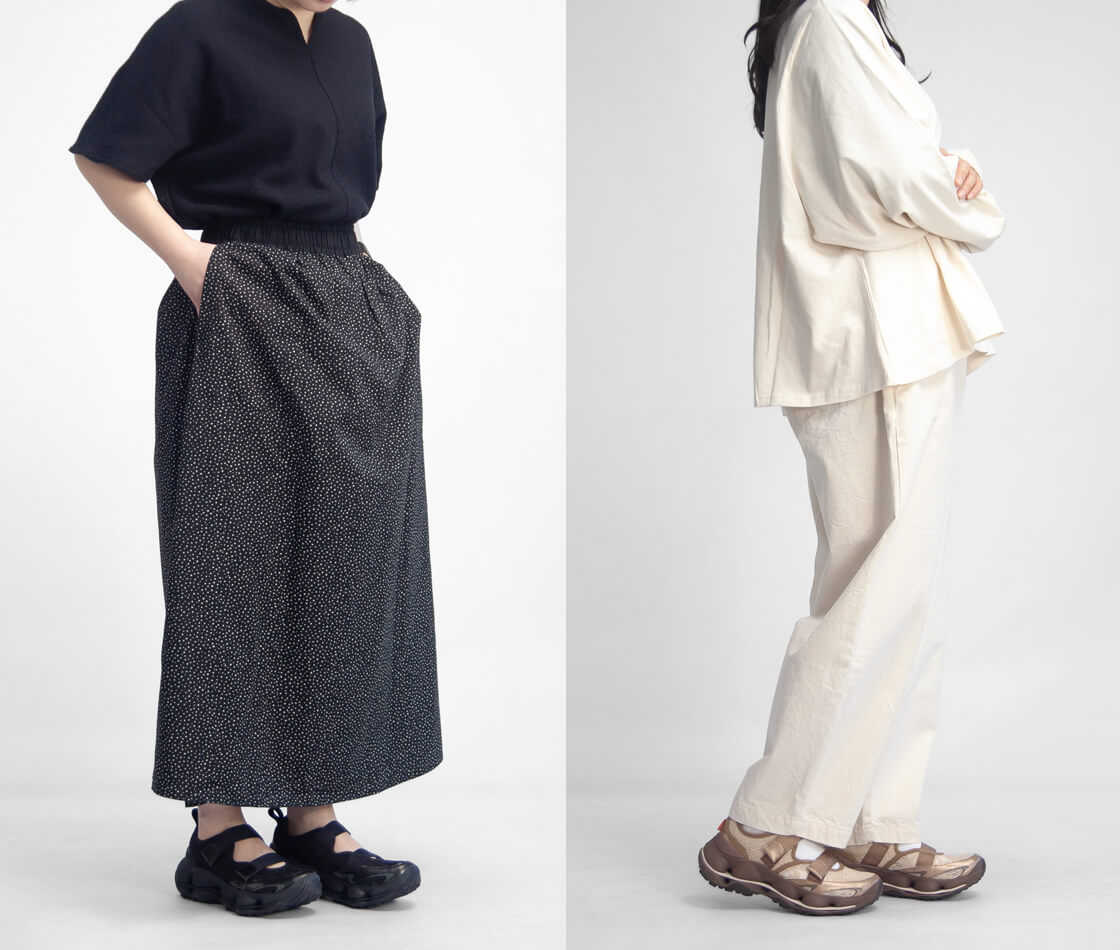 普段は23.5cm前後のスニーカーを履いていますが、こちらは薄手の靴下でちょうどいいサイズ感でした。つま先は指一本入るか入らないかくらいの余裕で、横幅もぴったりフィットしてくれます。私はやや甲が高めなので、ベルクロはぴったり全部が重なる感じではありませんが、見た目にはほとんど気にならず、しっかりとフィット感は感じられ、歩いても問題ありませんでした。普段から厚手の靴下を履かれる方や、甲高・幅広の方は、ワンサイズ上げていただいても良さそうです。