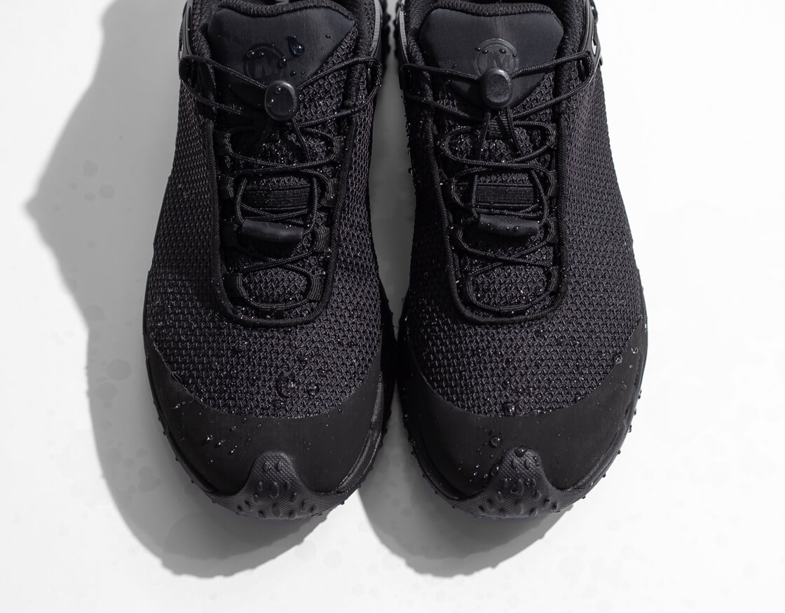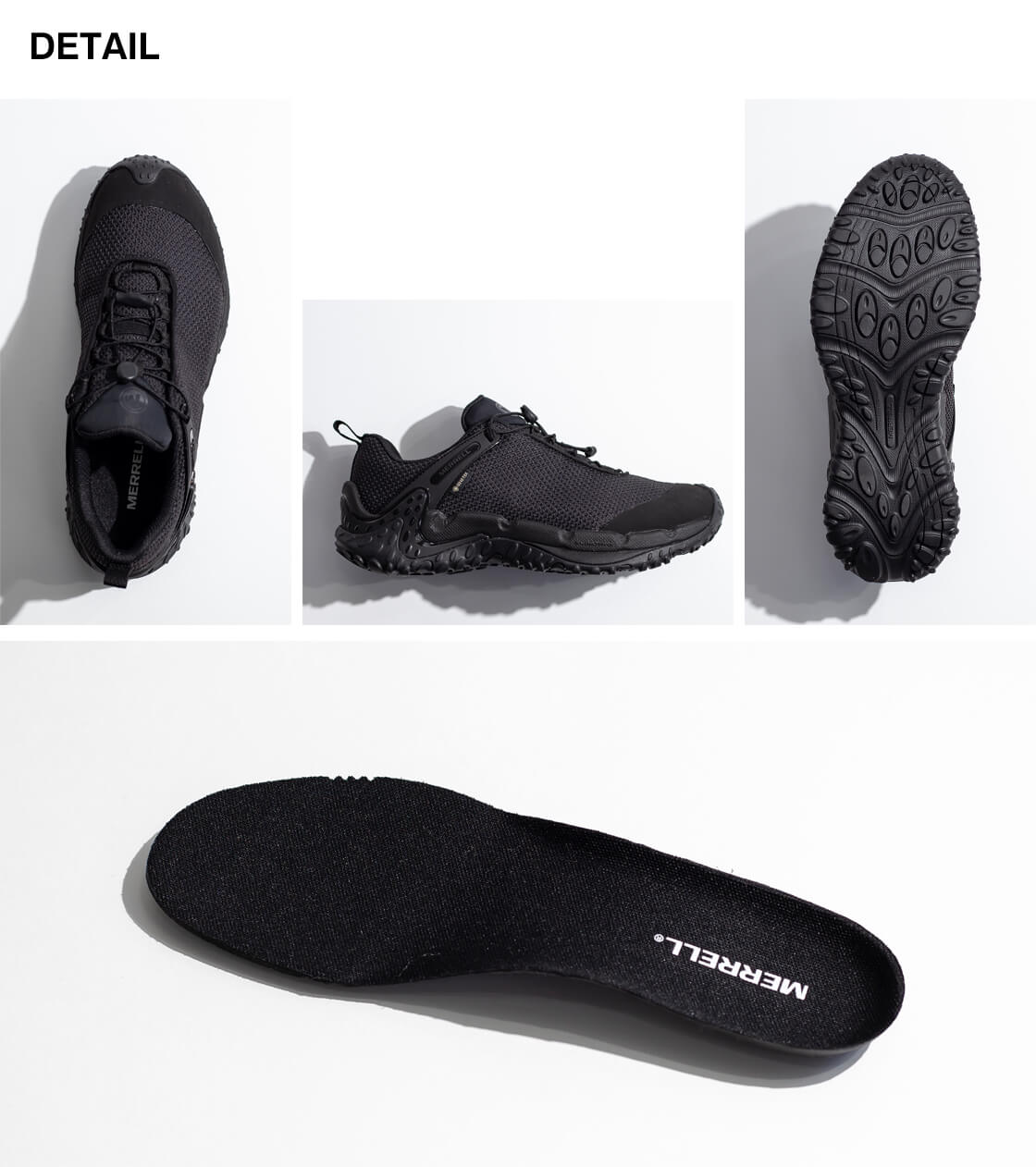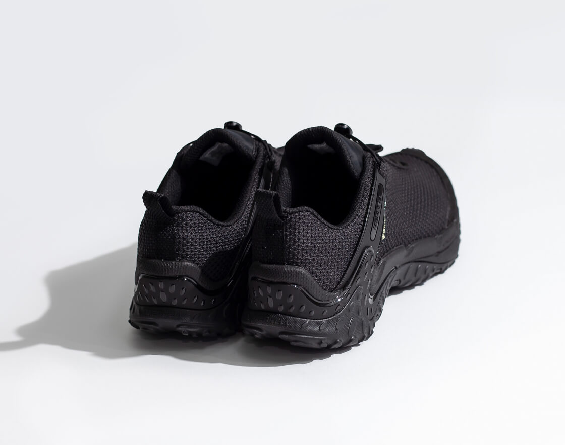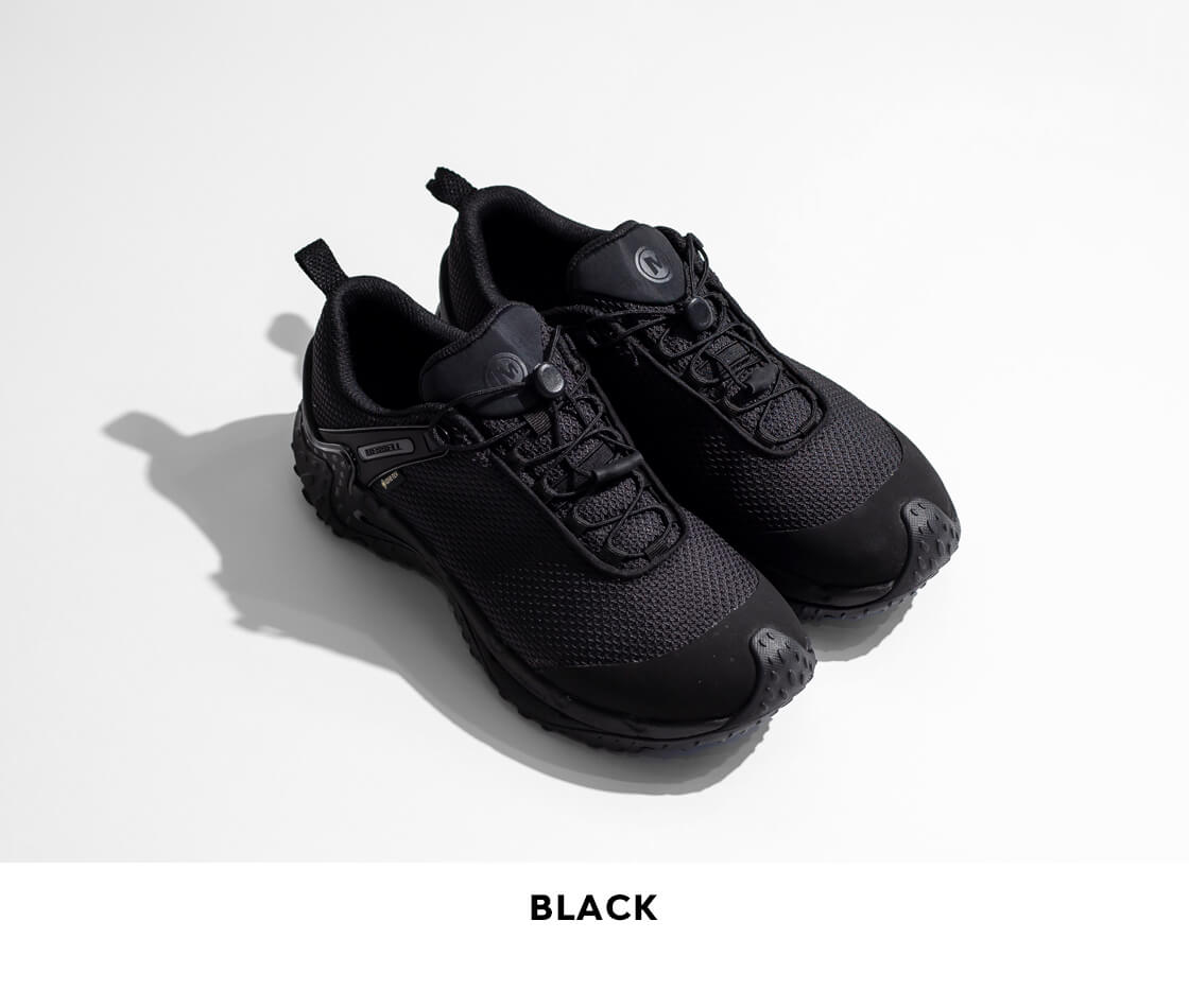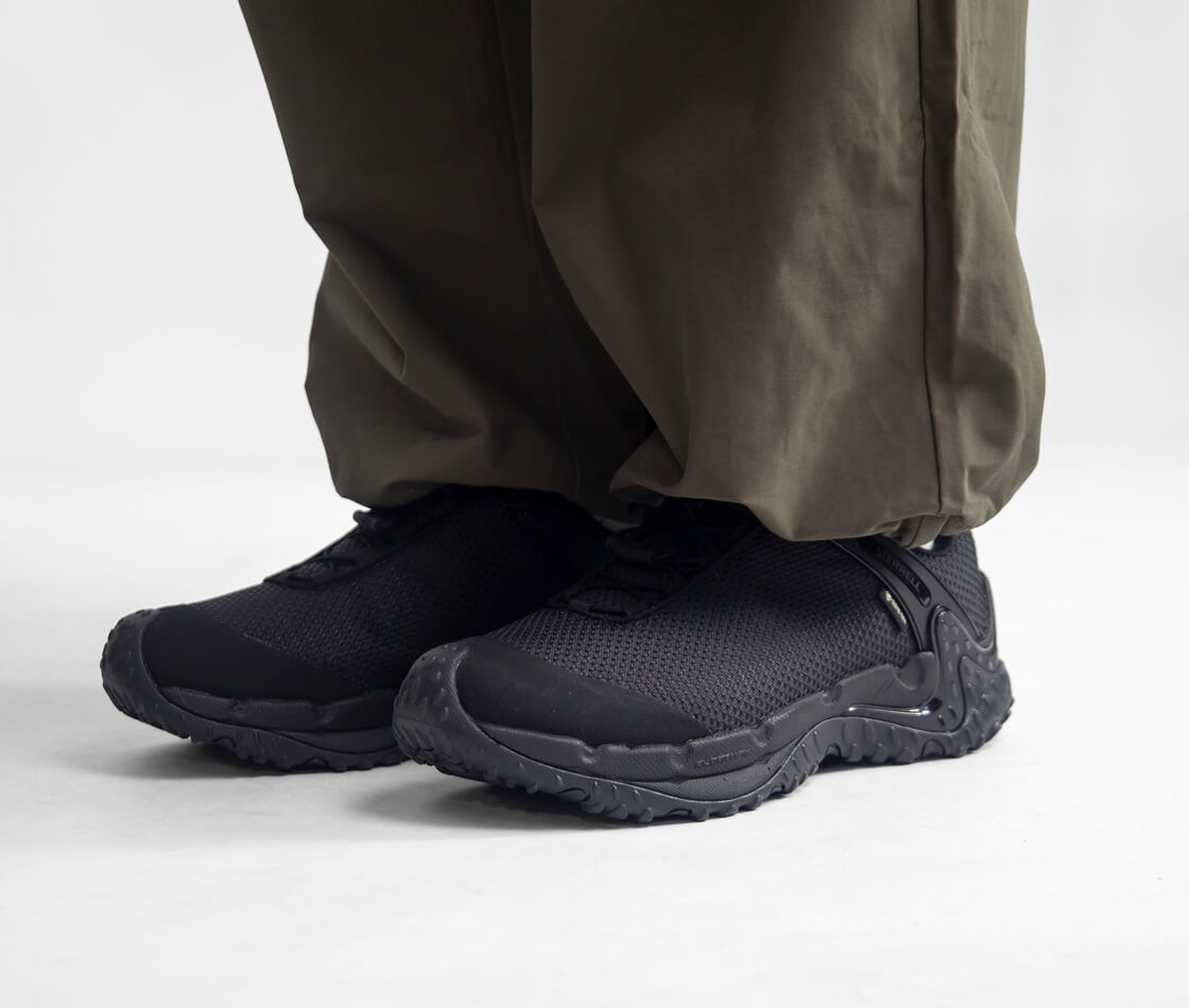 従来のトレイルだけでなく、都市のアスファルトや突発的な悪天候といったリアルな日常環境にも適応するため、業界随一の防水透湿性を備えたGORE-TEXメンブレンを搭載。アッパーは、縞鋼板デザインのメッシュが採用された、摩耗耐久性に優れた撥水ラギッドメッシュアッパー。強度に加え、見た目のシンプルさと緻密な形状がスタイリッシュな印象を演出。着脱とフィット調整が簡単なスピードシューレースは60%リサイクル素材。通気性の高いメッシュライニングと、メッシュフットベッドカバーも一部リサイクル素材を使用していて、独特のデザインだけではなく、エコフレンドリーな素材使いも環境問題に取り組むMERRELLらしい仕様です。踵部にはTPU補強ヒールカウンターを配置して安定性を高め、防臭加工を施した通気性の高い取り外し可能なインソールは、EVAフォームの低反発なクッショニングで足をサポートします。