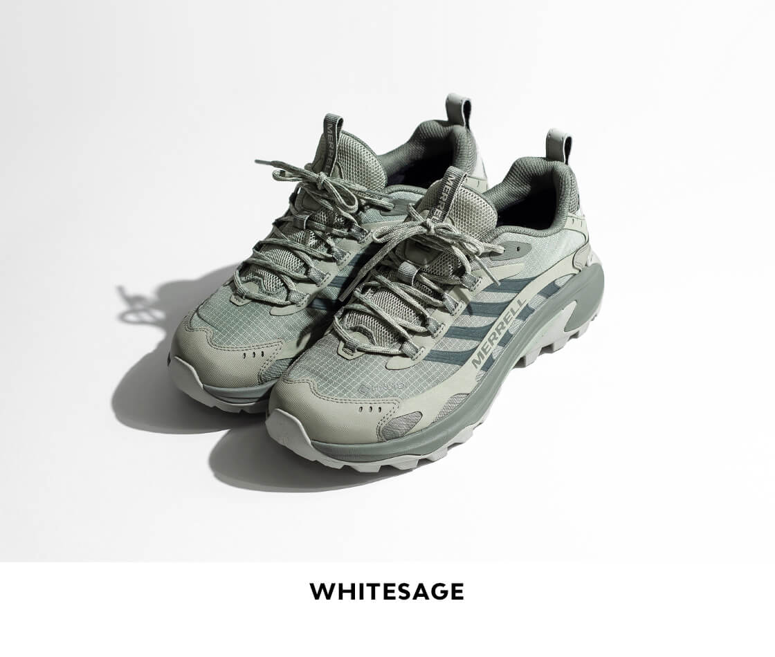 トレイルやハイキングだけでなく、都市のアスファルトや突発的な悪天候といったリアルな日常環境にも適応するため、業界随一の防水透湿性を備えたGORE-TEXメンブレンを搭載。アッパーは、耐引裂性に優れた構造のリップストップナイロンをベースにTPUで補強。通気性の高いメッシュライニングと、シューレース・ウェビングは100%リサイクル素材を使用していて、独特のデザインだけではなく、エコフレンドリーな素材使いも環境問題に取り組むMERRELLらしい仕様です。つま先とかかと部のラバートゥキャップが外部の衝撃から足を保護してくれ、防臭加工を施した通気性の高い取り外し可能なインソールは、ポリウレタンフォームの低反発なクッショニングで足をサポートしてくれます。