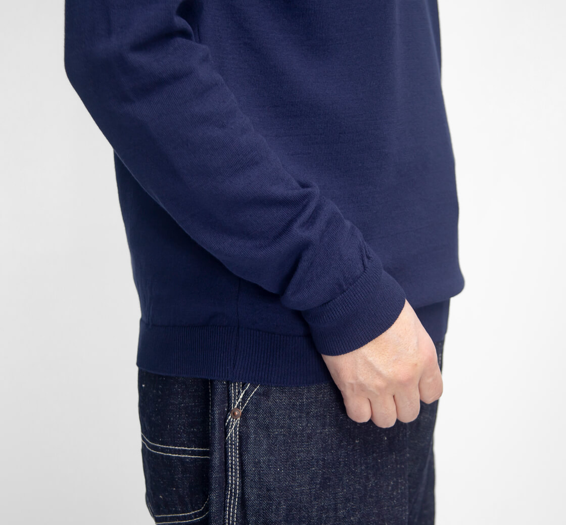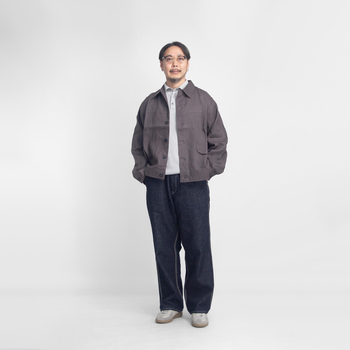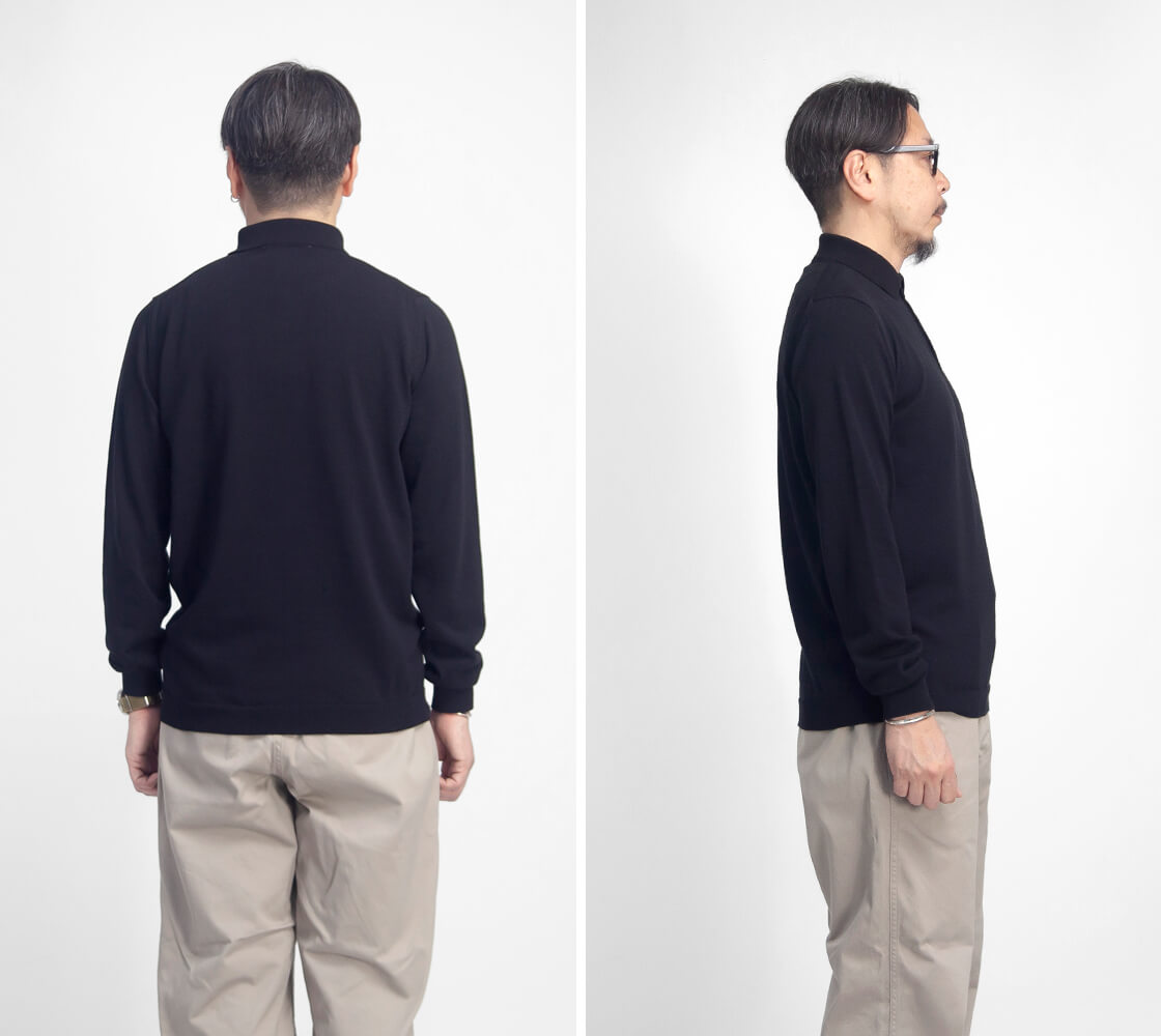 Mサイズを着用しました。全体的にもたつきもなく見た目にも程よくスッキリと見えるジャストサイズです。ウールニットほどではありませんが、伸縮性も比較的ありますし、身幅に関しては程よくゆとりがあり、極端に細身な感じでもないので不快な感じはありません。着丈はヒップが少し隠れるぐらいで、袖丈はジャストな長さです。僕の場合はMサイズがジャストサイズになりますが、LやXLサイズで今どきのラフなシルエットで着こなす方が好みではあります。