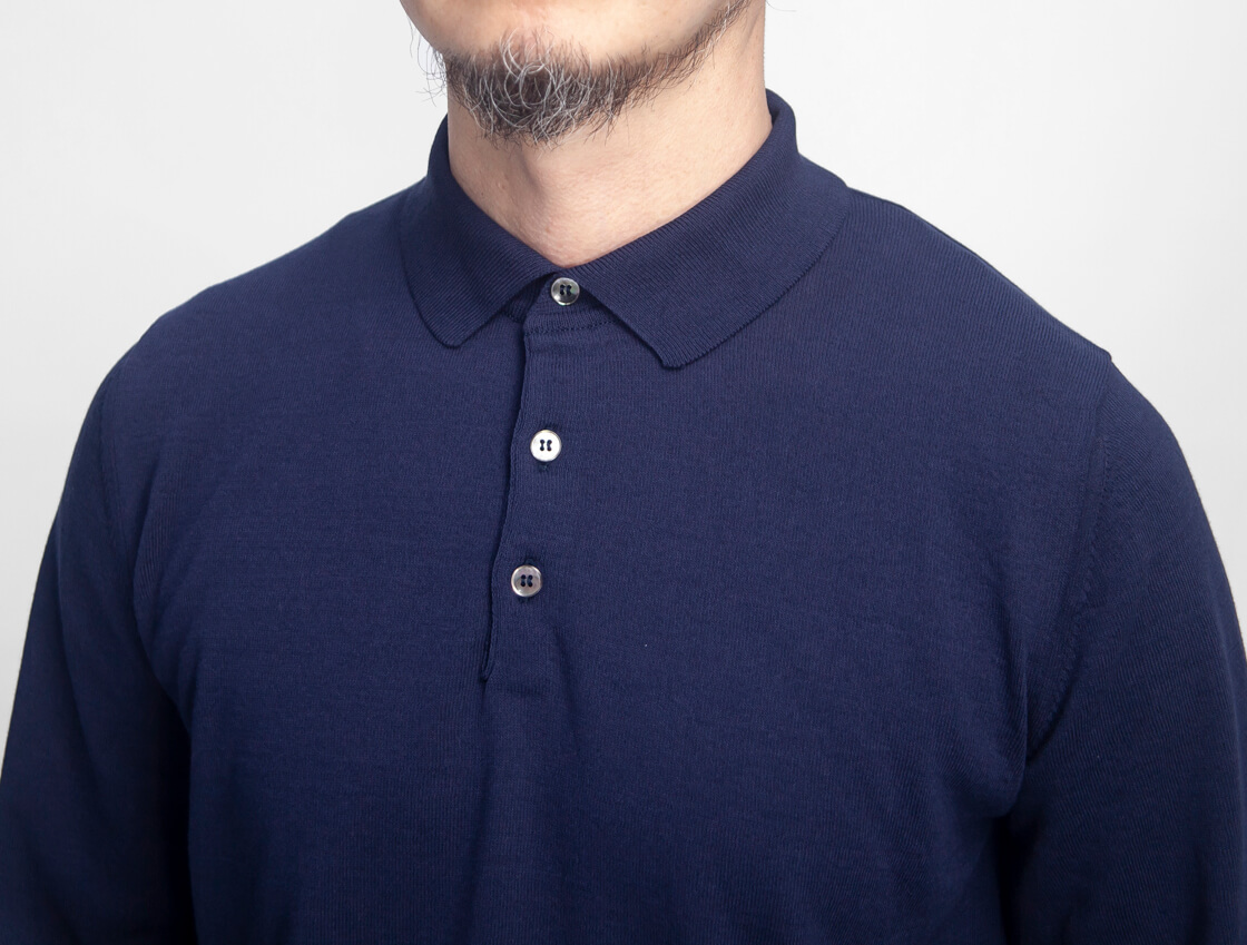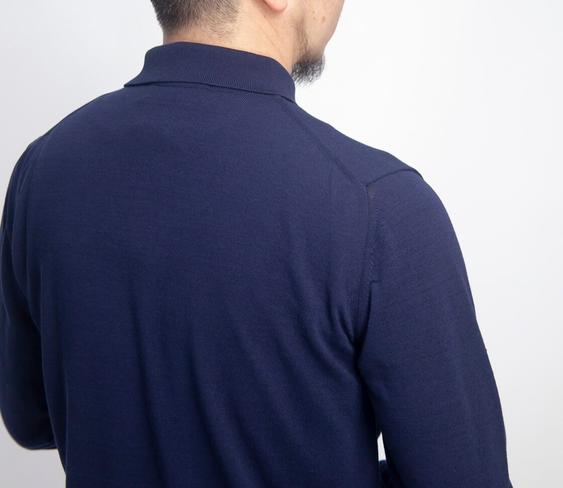 ビジネスシーンに使えるようにと商品企画された、MOONCASTLE定番の半袖ニットポロの長袖タイプがこちら「ICE COTTON LONG POLO NECK」。真夏には半袖ポロを、春先や晩夏などの暖かい季節にはこちらの長袖を着用頂けるわけです。襟は台襟付きの様に、高めのクラシックなスタイル。第一ボタンが高めの位置に設定されているので、台襟付きの襟の様に襟先が支えられ、シャツの様に立体的な襟に仕上げられています。この襟が、よりジャケットとの相性を高めてくれているというわけです。ボタンはカラーによって高瀬貝と黒蝶貝を使い分け、品のある光沢感を放ちます。ボタンを外した時の襟の開きも綺麗な見え方。ビジネスシーンにも使いやすく、1枚で着こなしたい休日でも使いやすい。袖がひらひらと広がりすぎないよう、リブで程よく締めた袖口は、ジャケットを着用しても袖口が中に折れにくいのも特徴です。また袖口のリブ幅はやや細めで、腕時計をしていても干渉しにくい。裾も同様にリブが入りで、タックインしなくても腰にフィットし、だらしなく見えません。